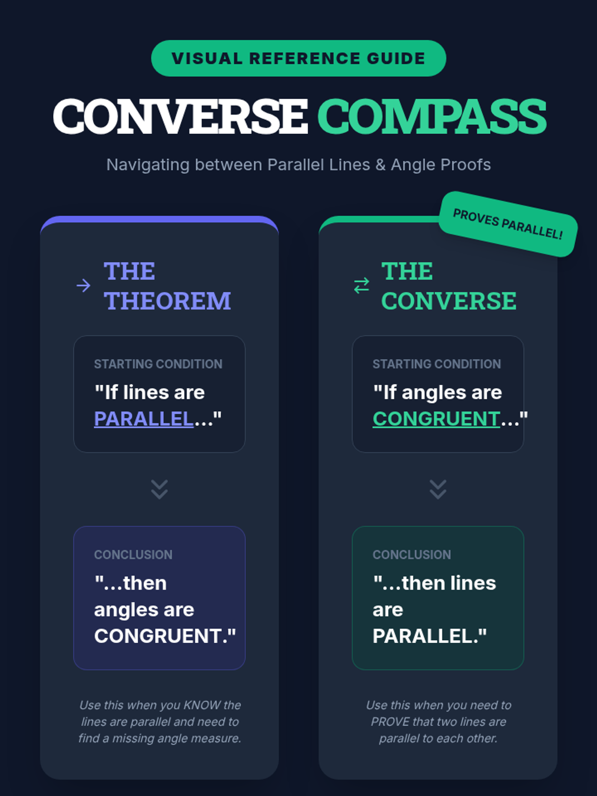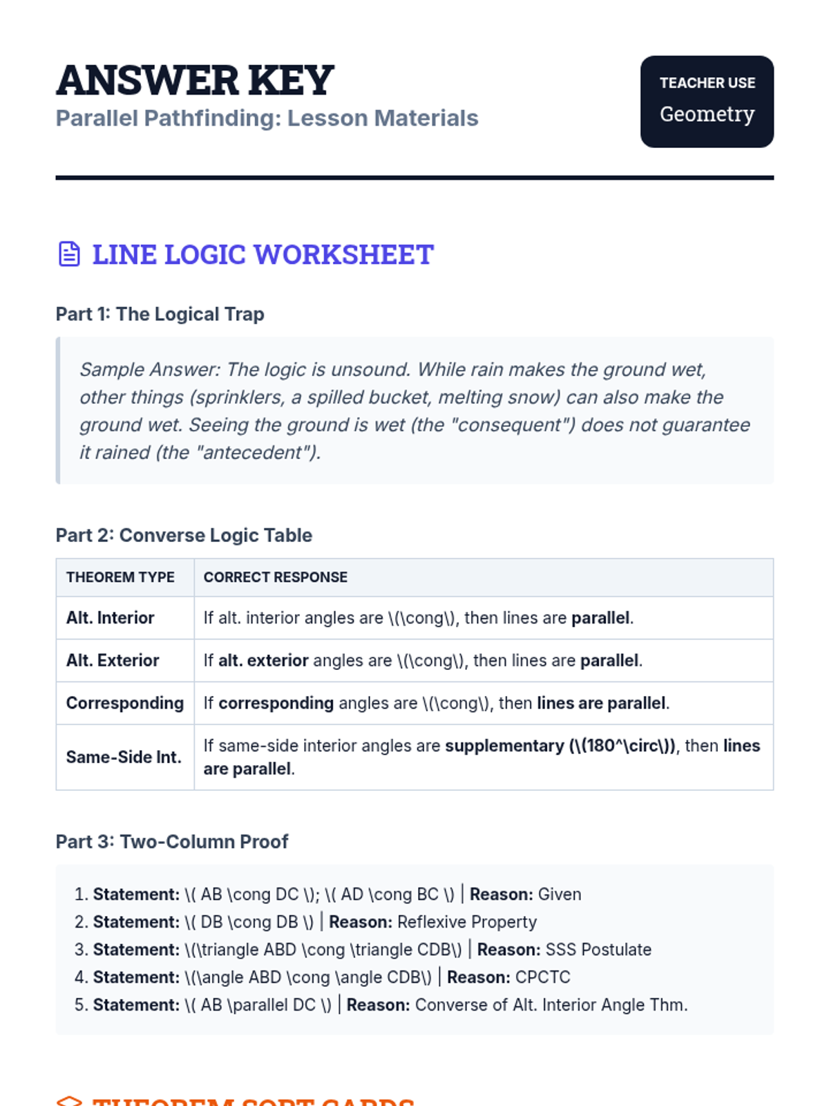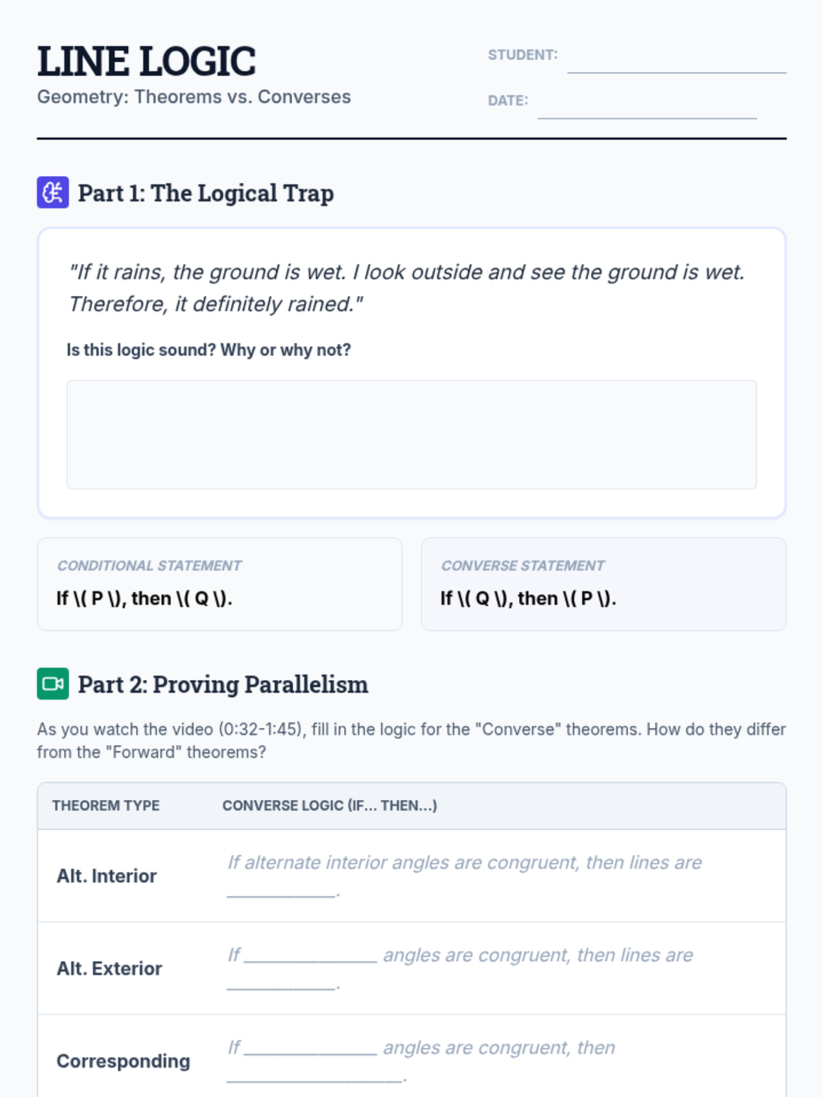 A high school geometry lesson focused on distinguishing between parallel line theorems and their converses, utilizing logic puzzles and formal proof techniques.