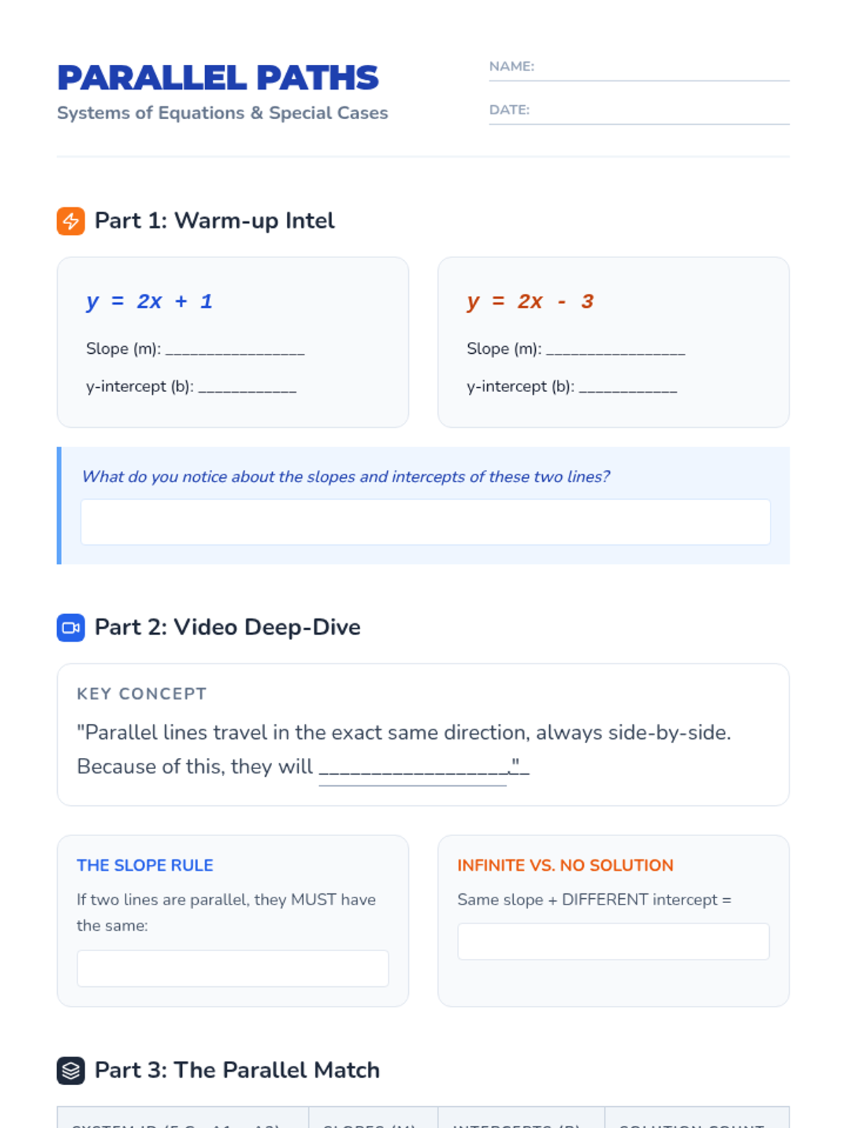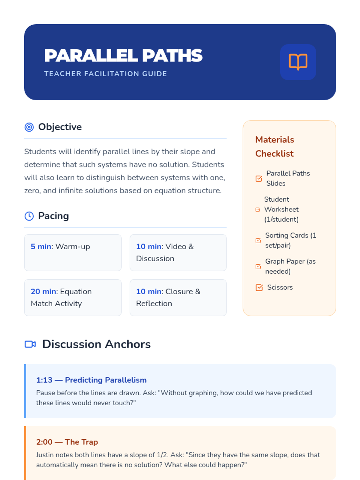 An 8th-grade math lesson focusing on identifying systems of linear equations with no solution by analyzing parallel lines and their identical slopes. Students use graphing and algebraic analysis to distinguish between systems with one, zero, or infinite solutions.