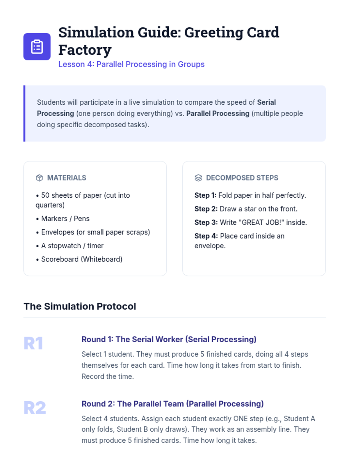Students discover that once a problem is decomposed, different people (or processors) can work on different parts simultaneously. They engage in a group activity where parallel work speeds up the result compared to serial work.