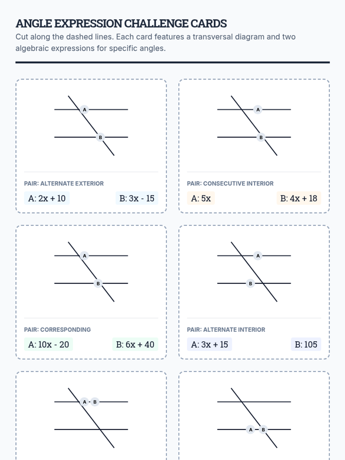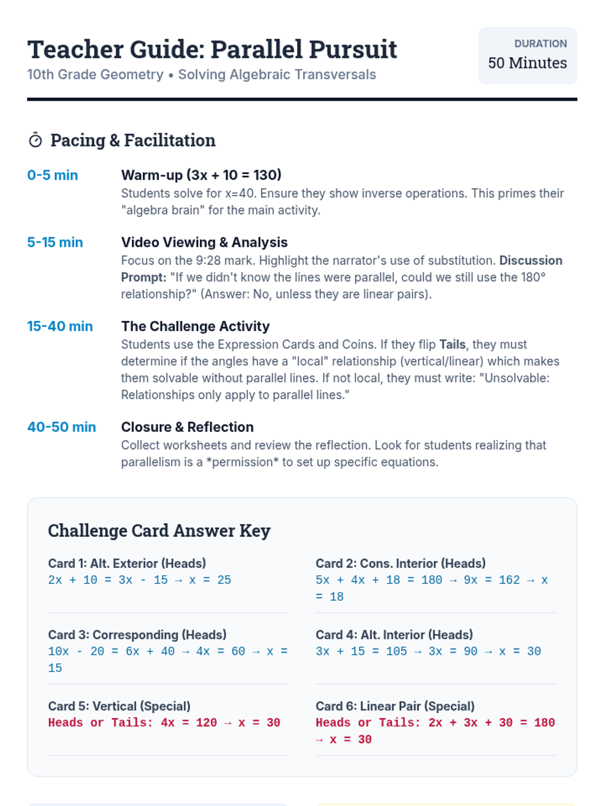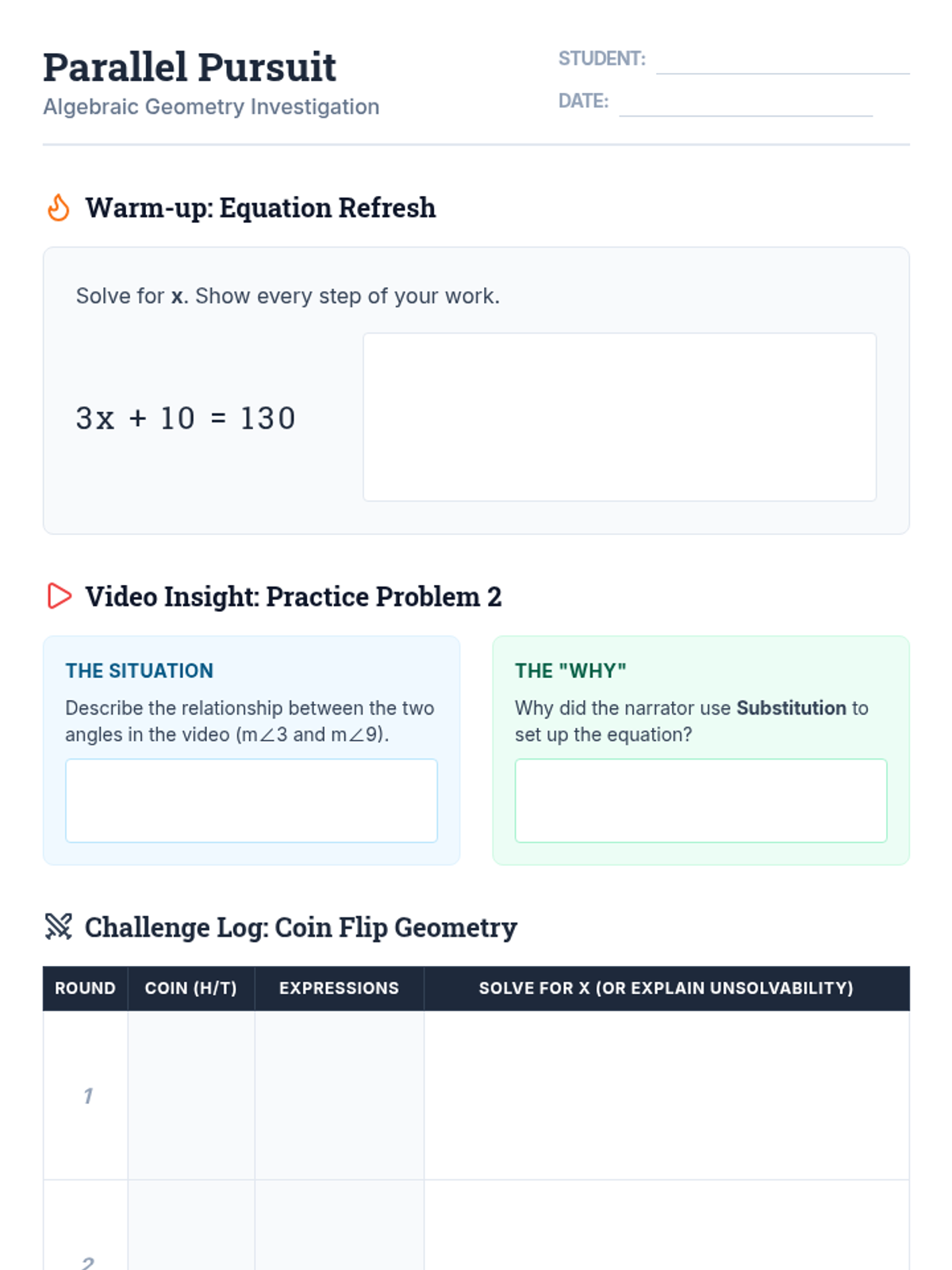 A 10th-grade geometry lesson focusing on solving algebraic equations formed by parallel lines and transversals. Students use coin flips to determine if lines are parallel, forcing them to distinguish between solvable and unsolvable geometric scenarios.