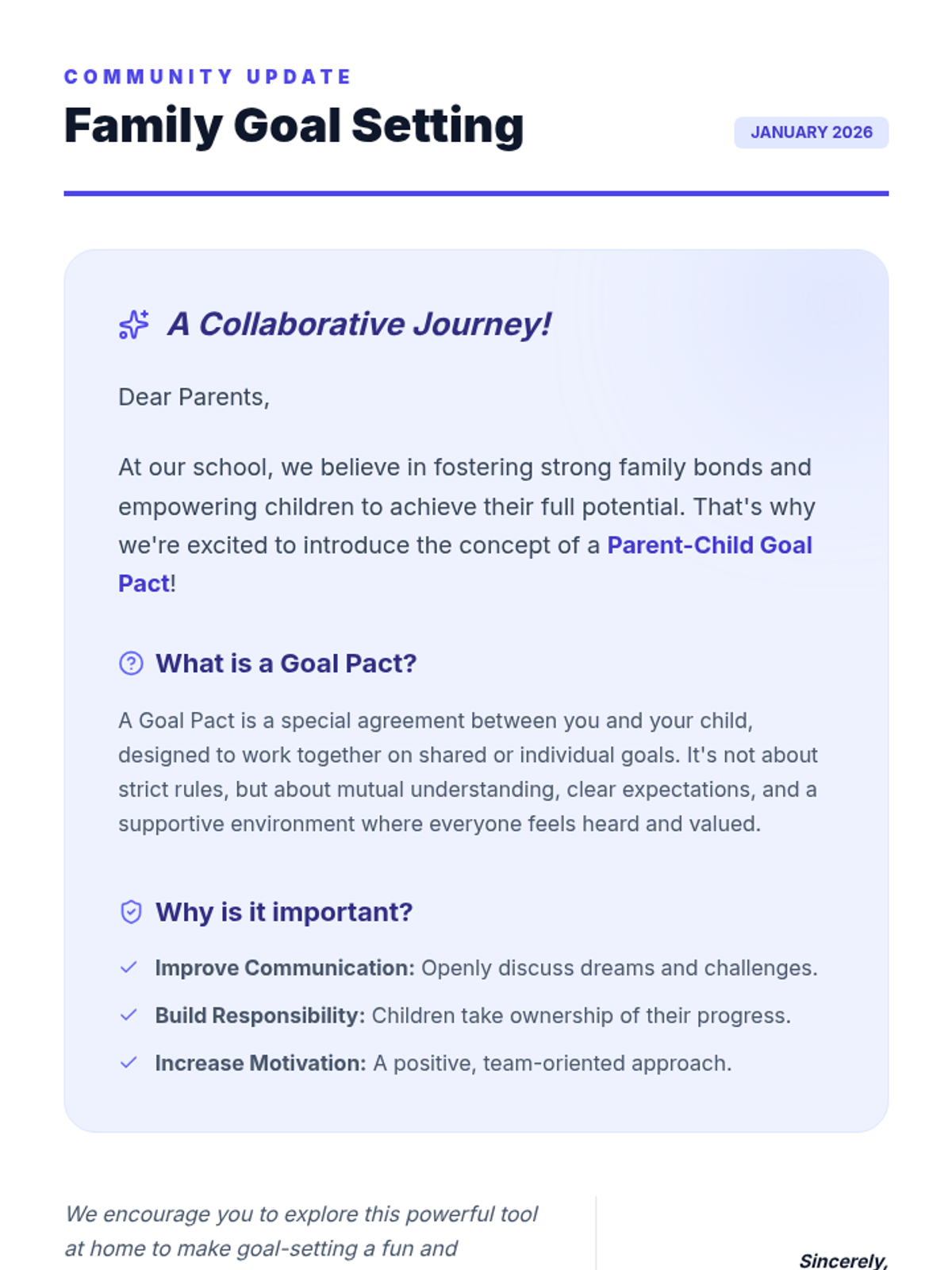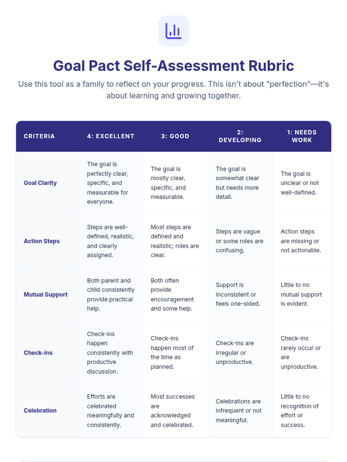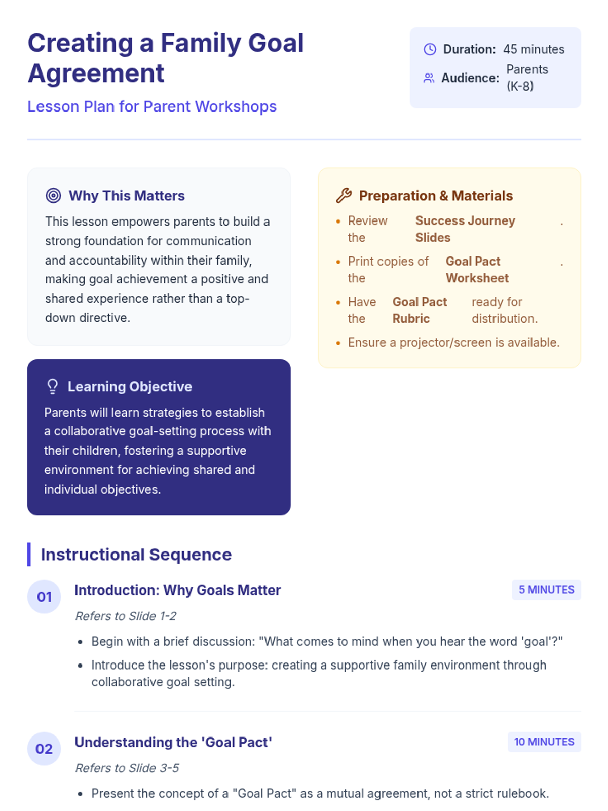 This lesson empowers parents to build a strong foundation for communication and accountability within their family by creating a structured Parent-Child Goal Pact. It includes a slide deck, a practical template, and a self-assessment rubric to make goal achievement a positive, team-oriented experience.