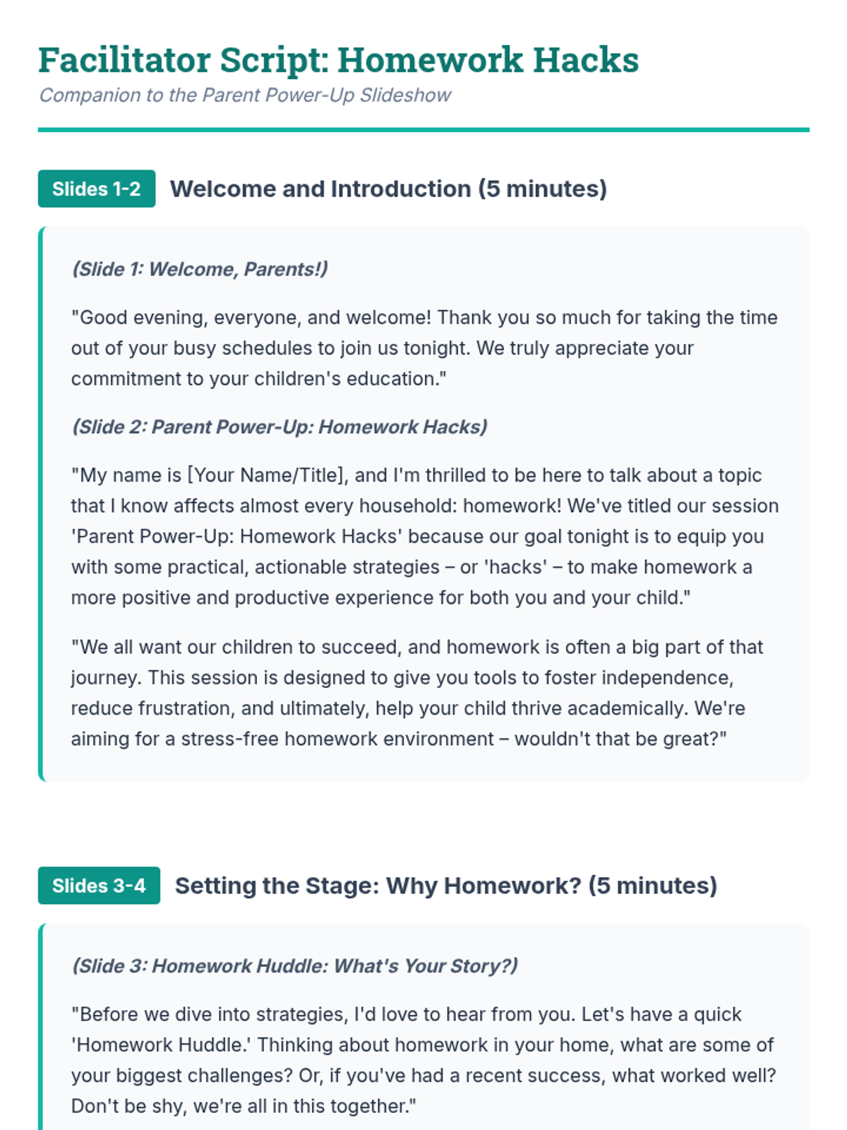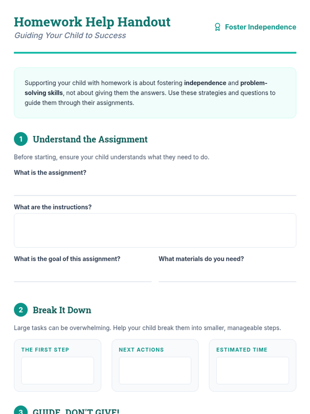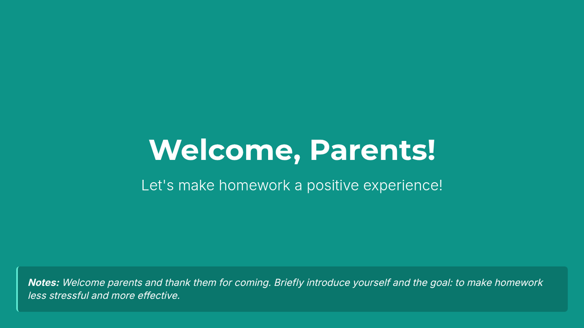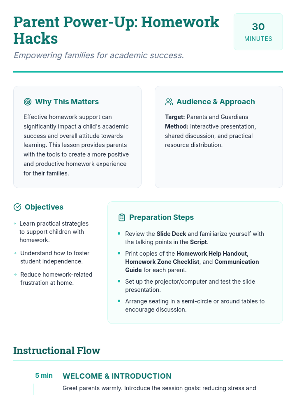 This lesson provides parents with practical strategies and tools to effectively support their children with homework, fostering a positive learning environment. Designed for parents, this 30-minute session equips them with actionable tips to reduce stress and improve student learning.