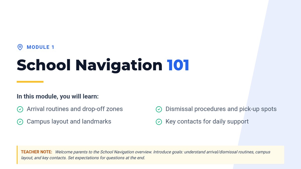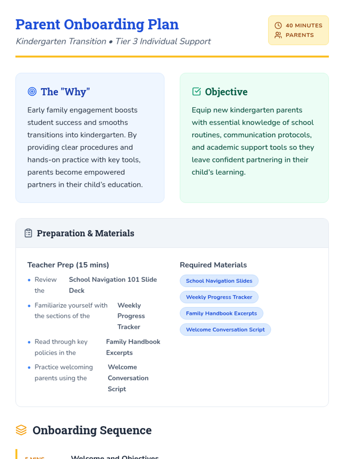 An individualized resource kit for new parents of kindergarteners, covering school systems, communication protocols, and academic support strategies. This Tier 3 (Individual) lesson empowers families to navigate the school environment confidently through one 40-minute session.