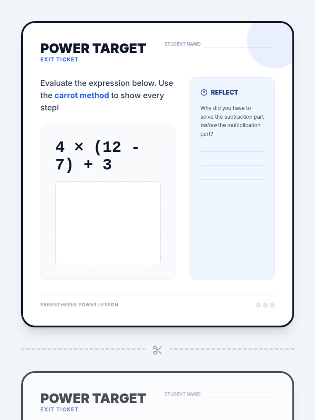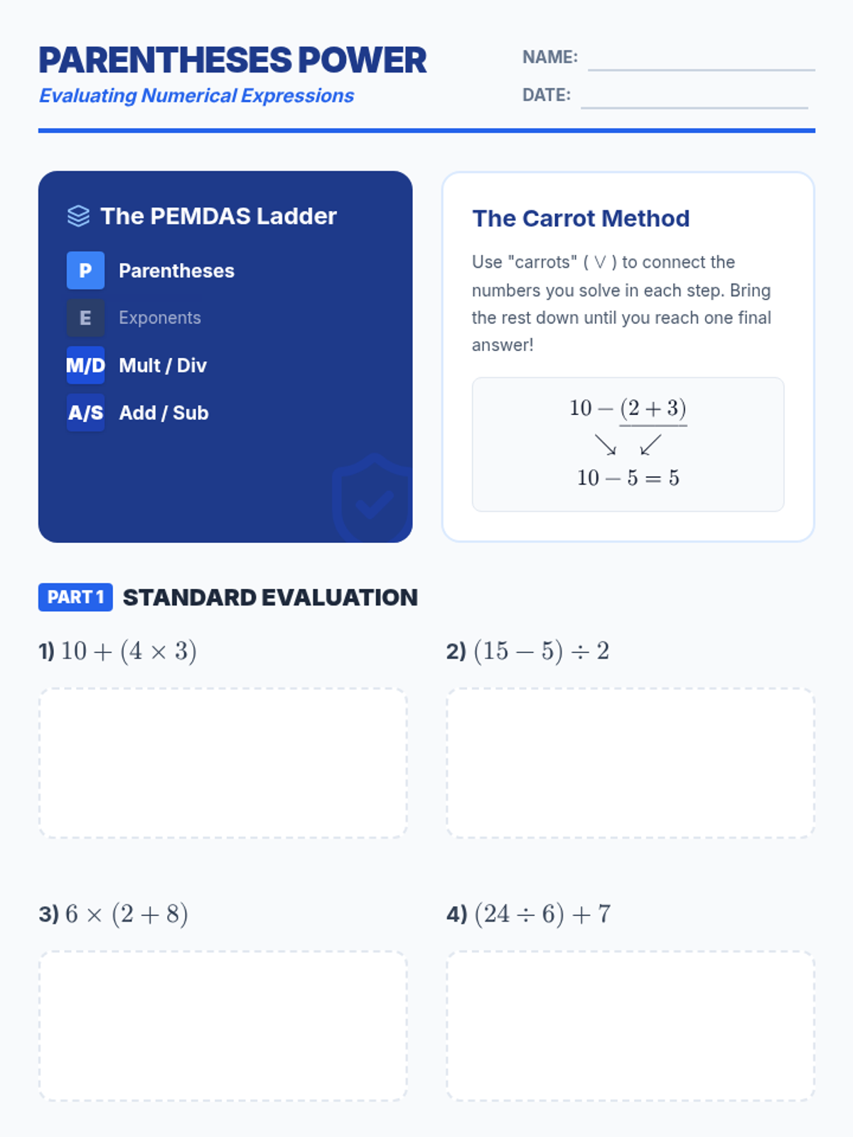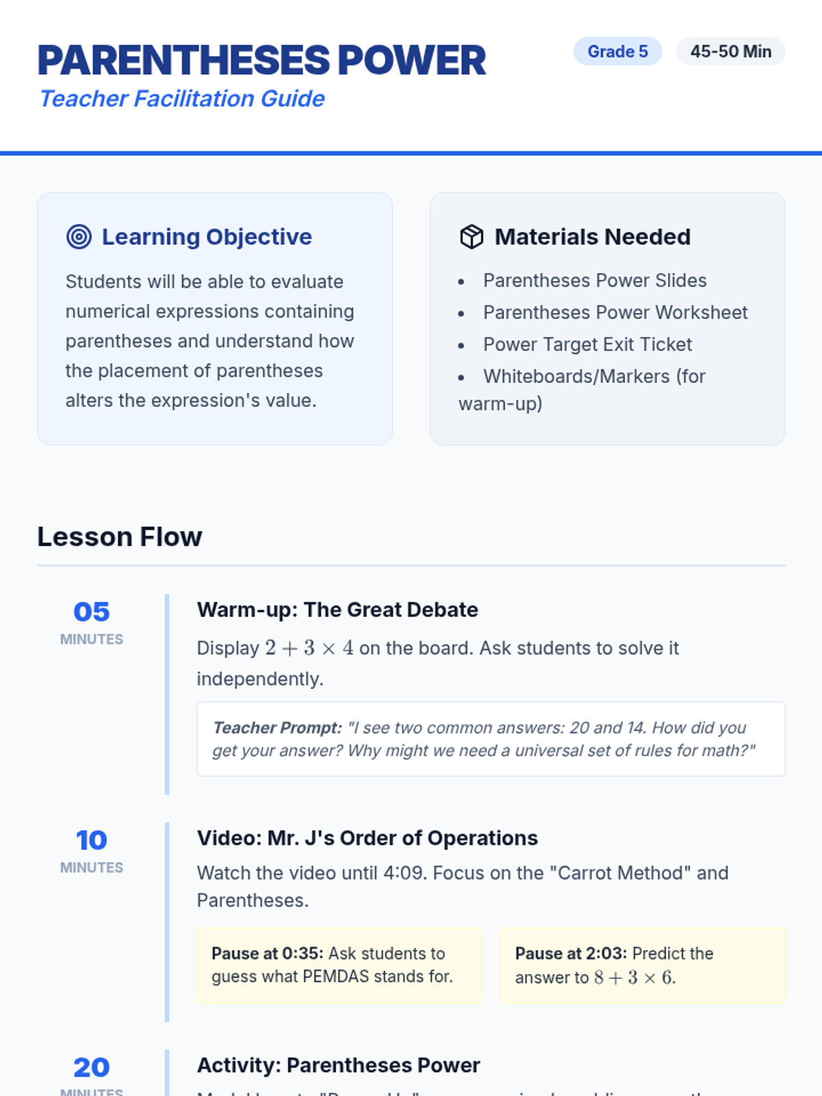 A 5th-grade lesson focusing on how parentheses change the value of numerical expressions, featuring the 'carrot method' for tracking steps.