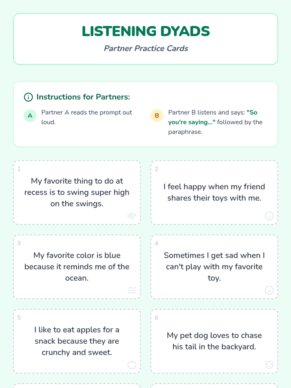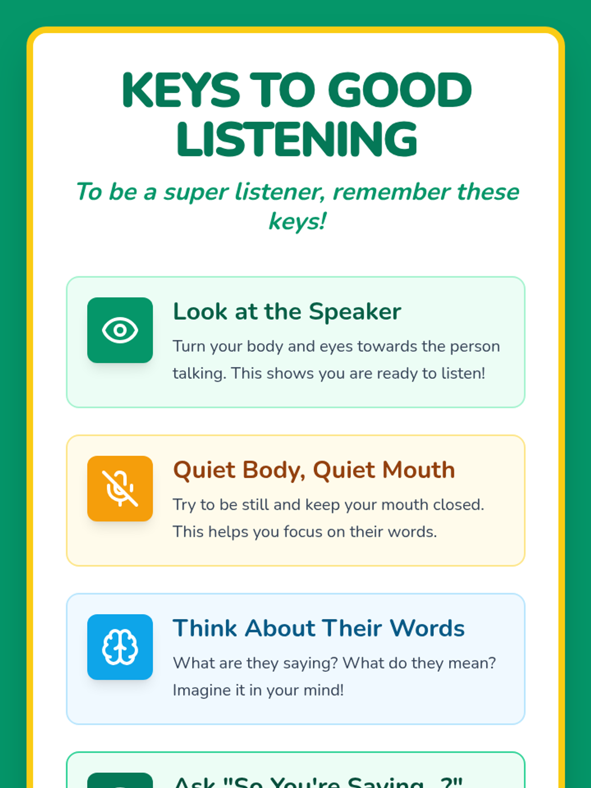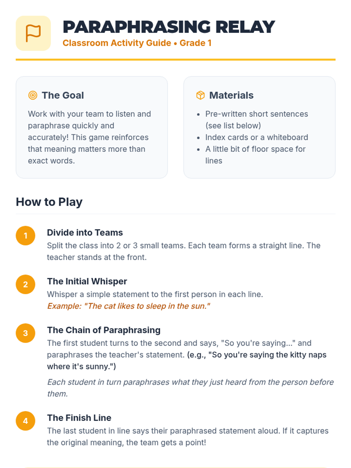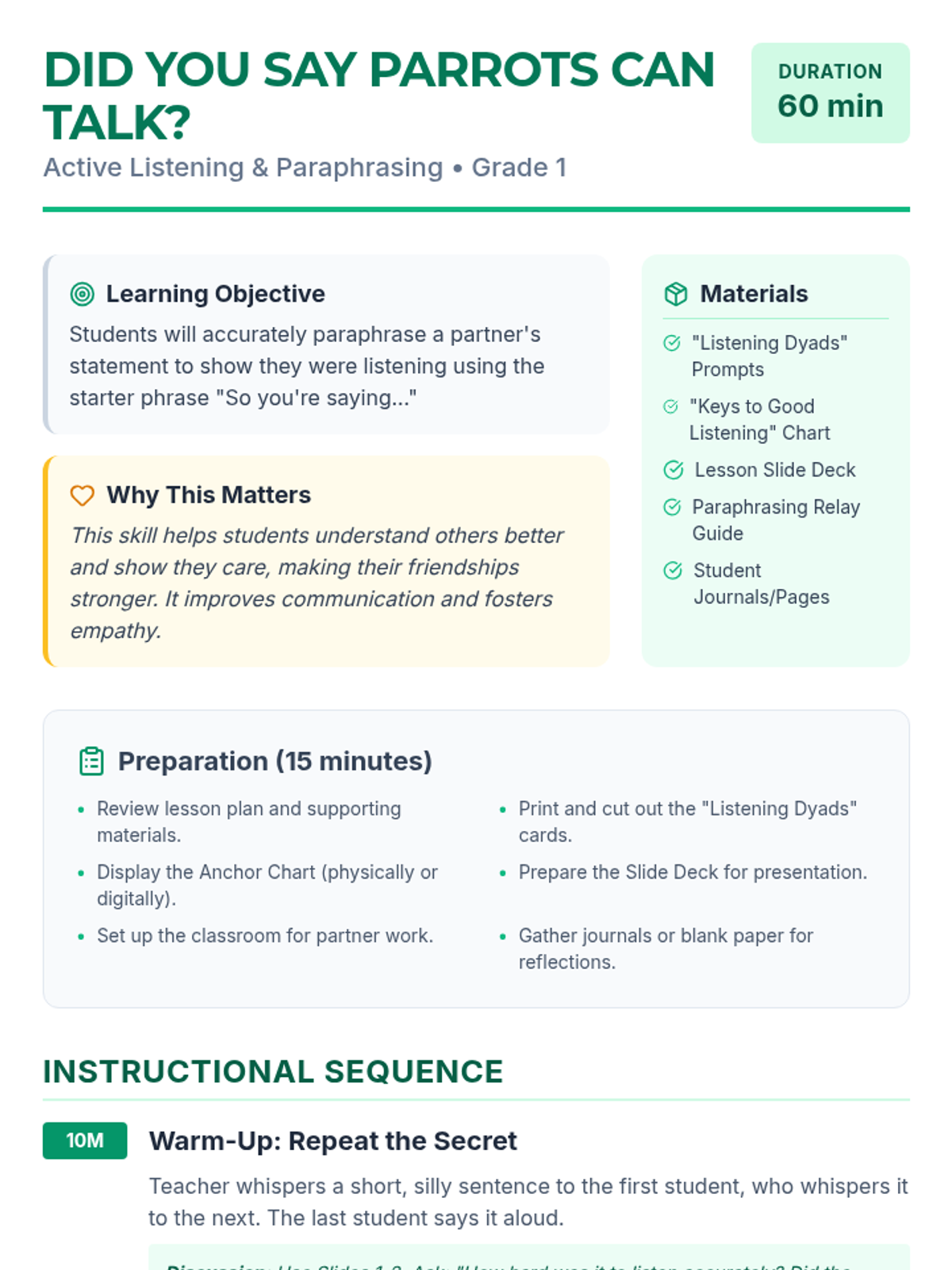 A 60-minute interactive lesson for 1st graders focused on active listening and paraphrasing using the 'So you're saying...' technique to build empathy and communication skills.
