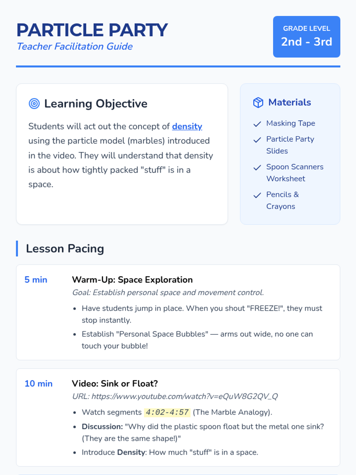 A hands-on science lesson for 2nd-3rd graders that uses a 'human particle' model to explain density, based on the SciShow Kids 'Sink or Float?' video. Students will act as particles to visualize how tight packing determines if an object is more or less dense than water.