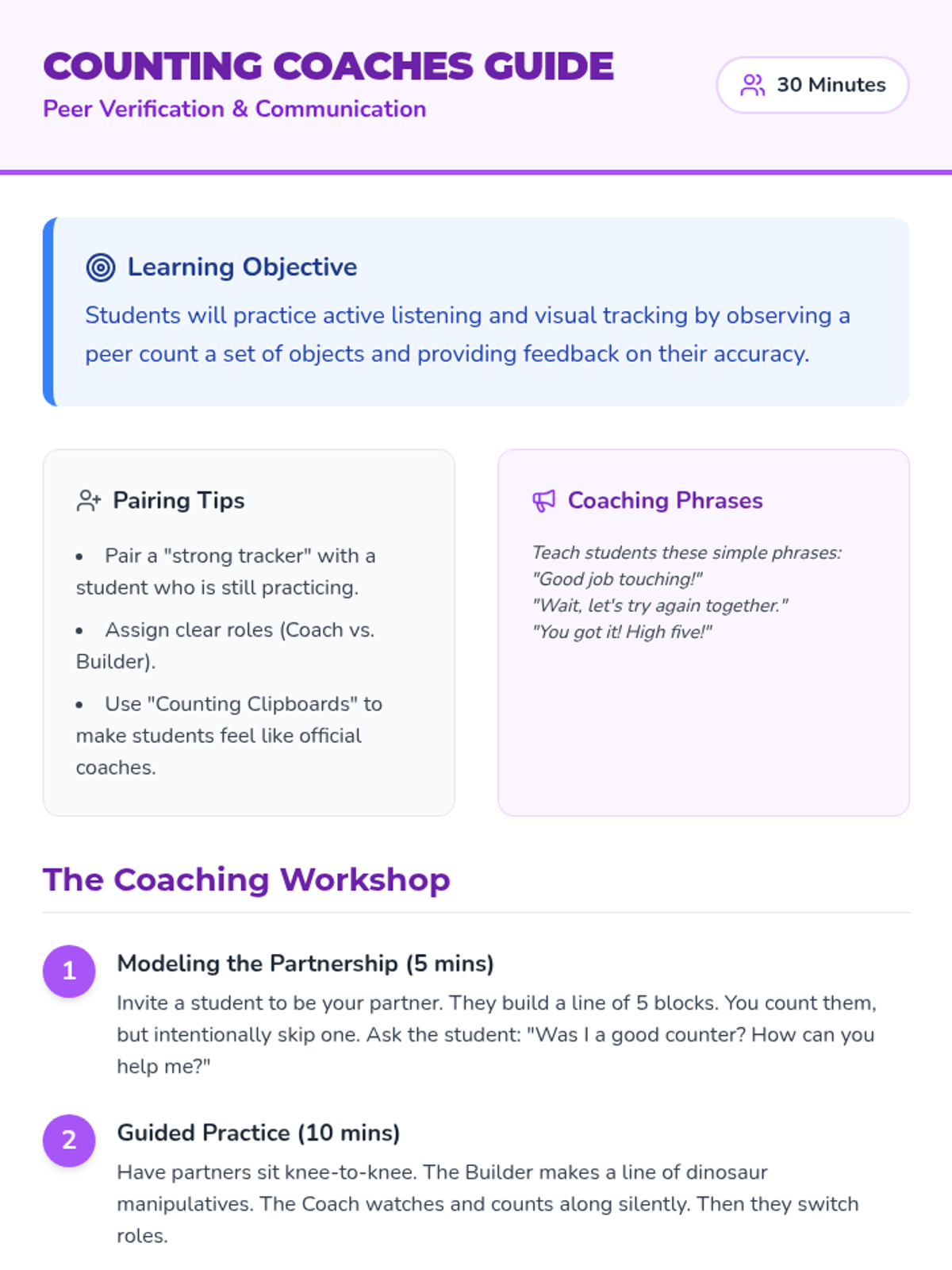 Students work in pairs where one student arranges a line of objects and the other counts them. They verify each other's counts, fostering communication and reinforcing the rules of one-to-one correspondence.