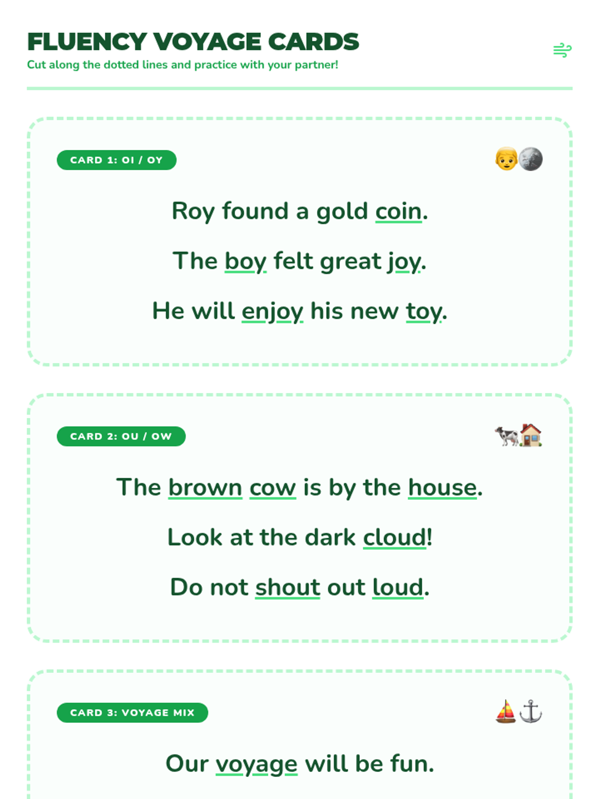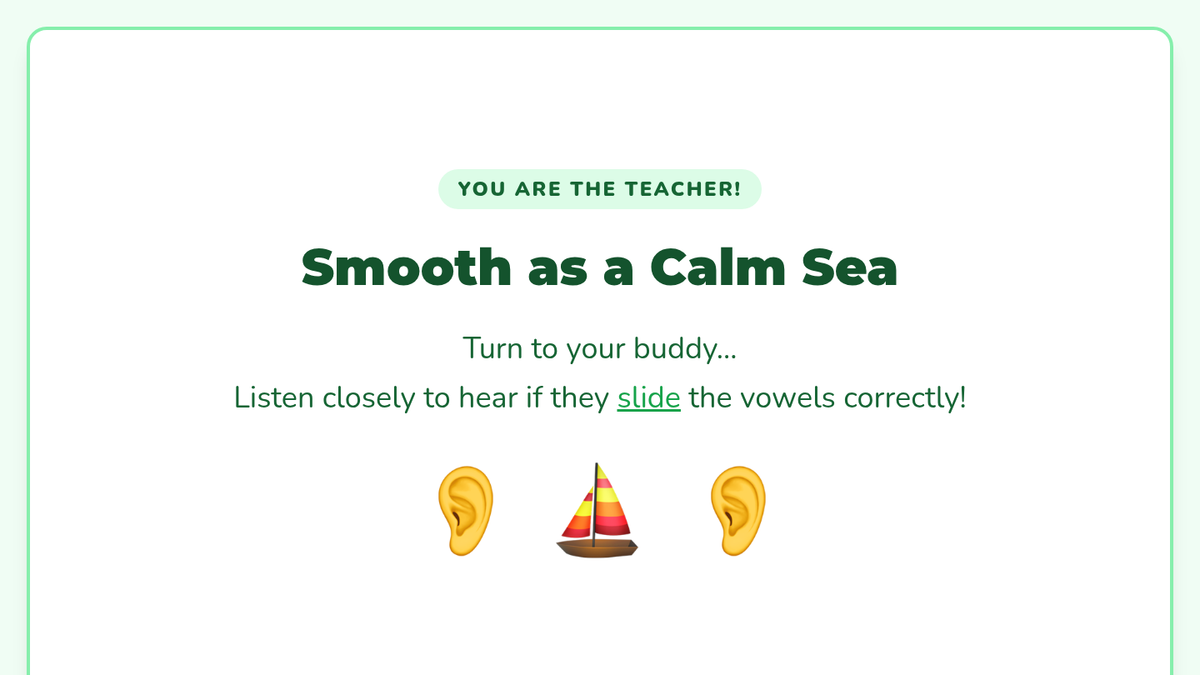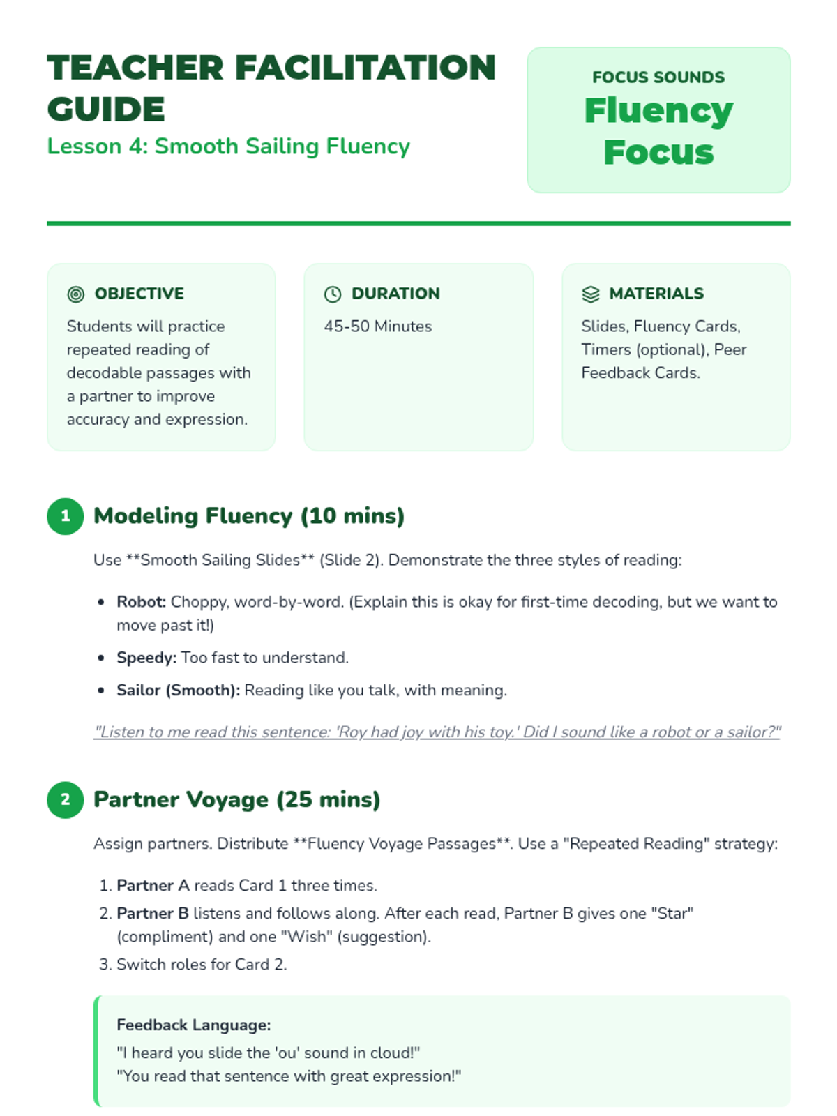 Students engage in repeated reading of decodable passages with partners to build oral fluency and provide peer feedback.