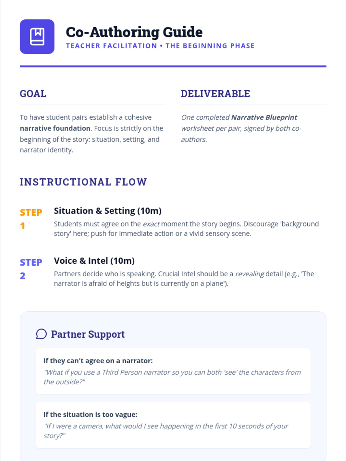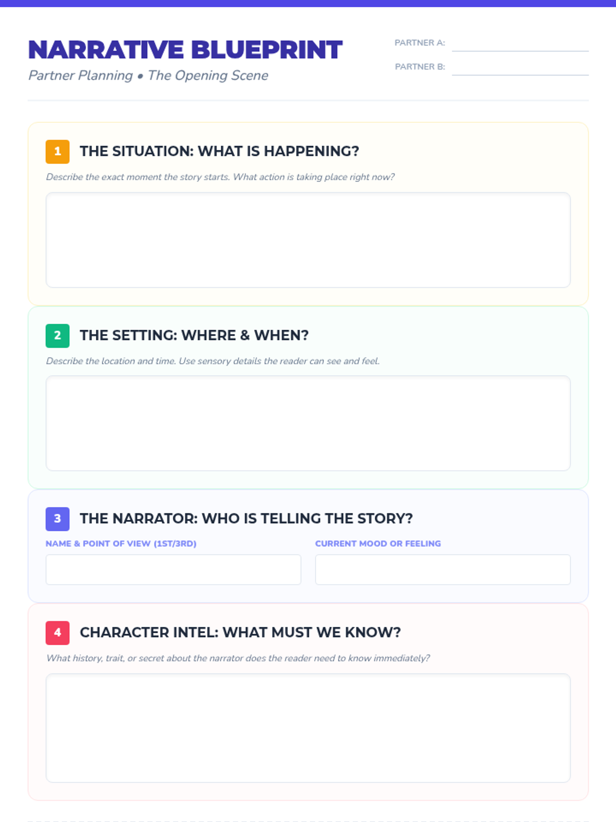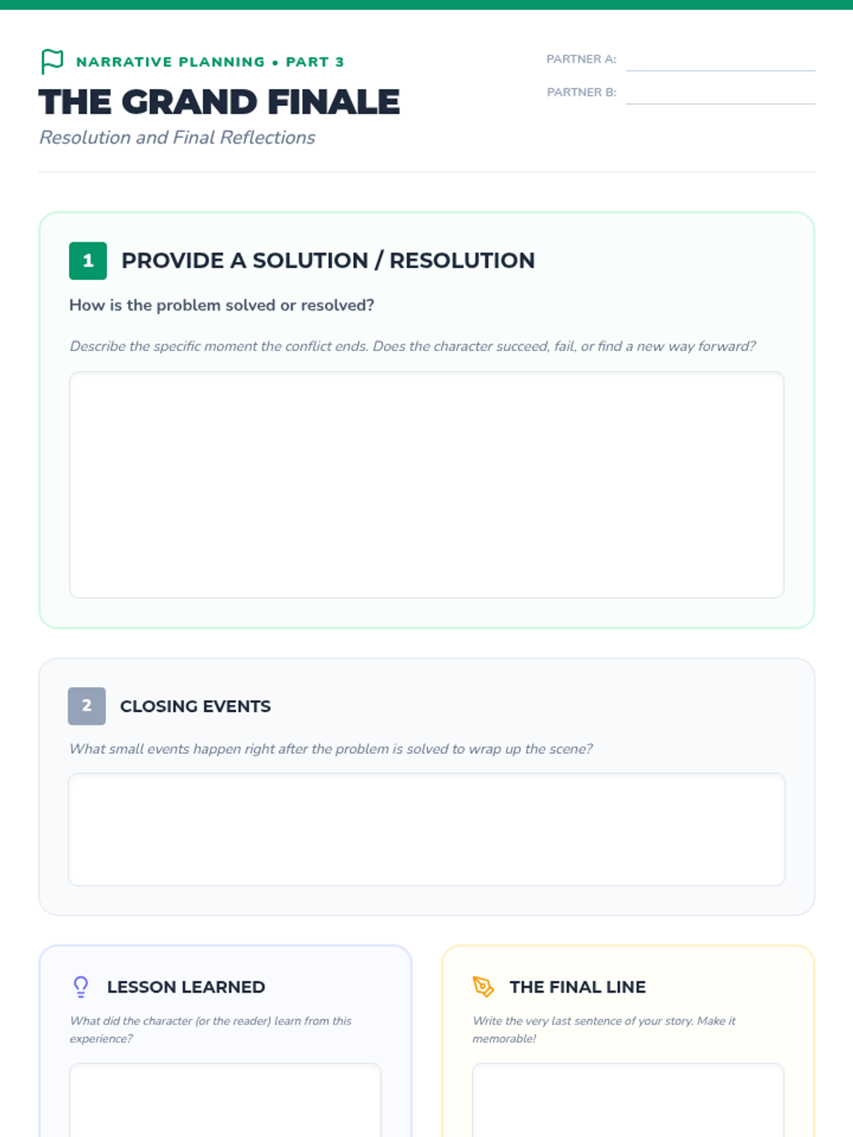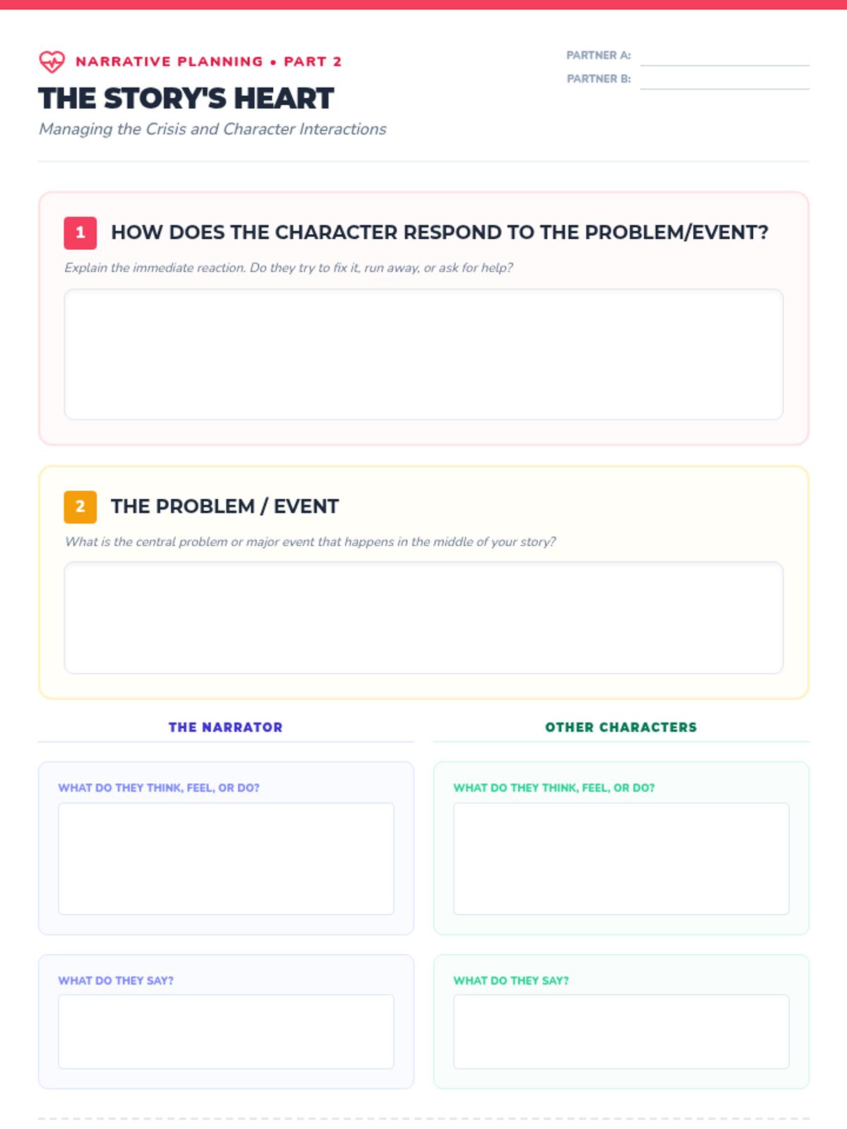 In this lesson, students collaborate with a partner to plan a narrative story, focusing on character development, setting, and plot structure using a shared graphic organizer.