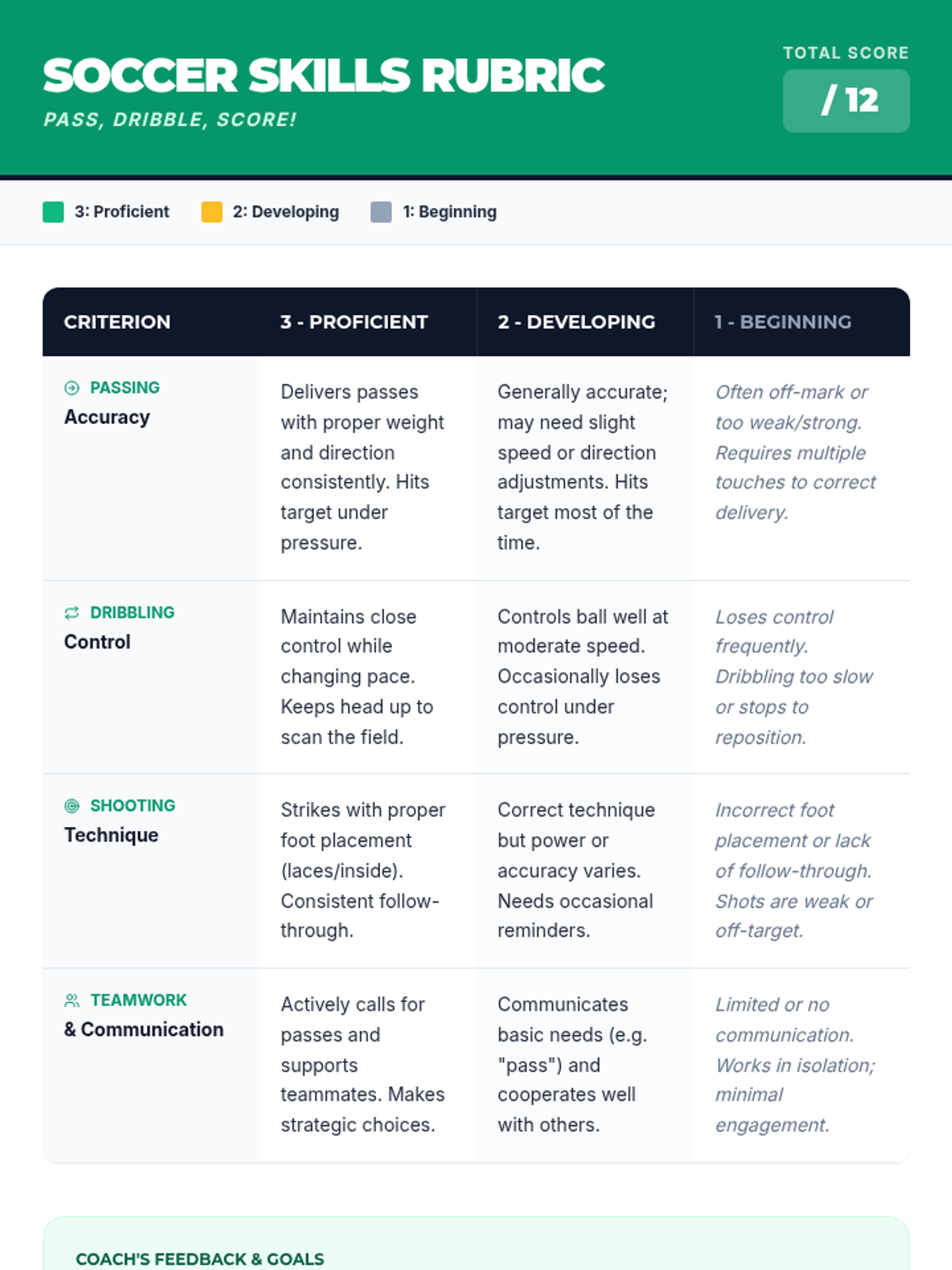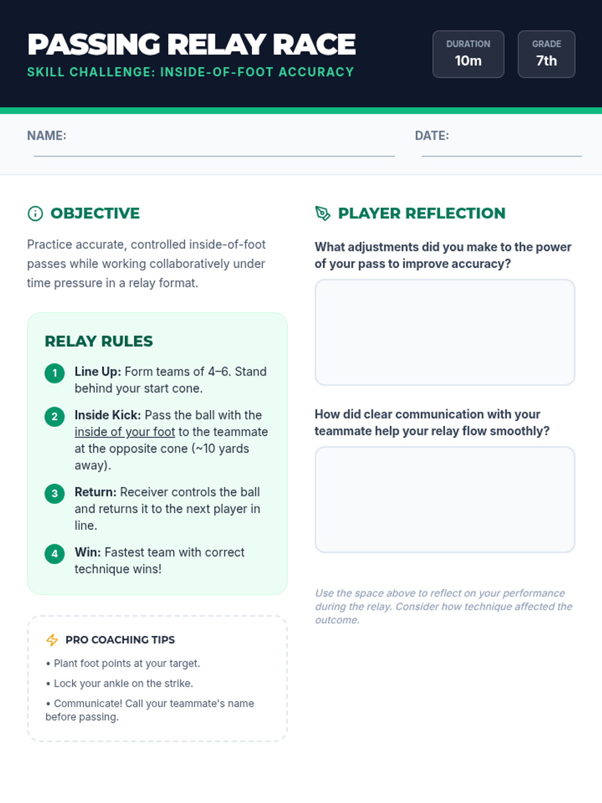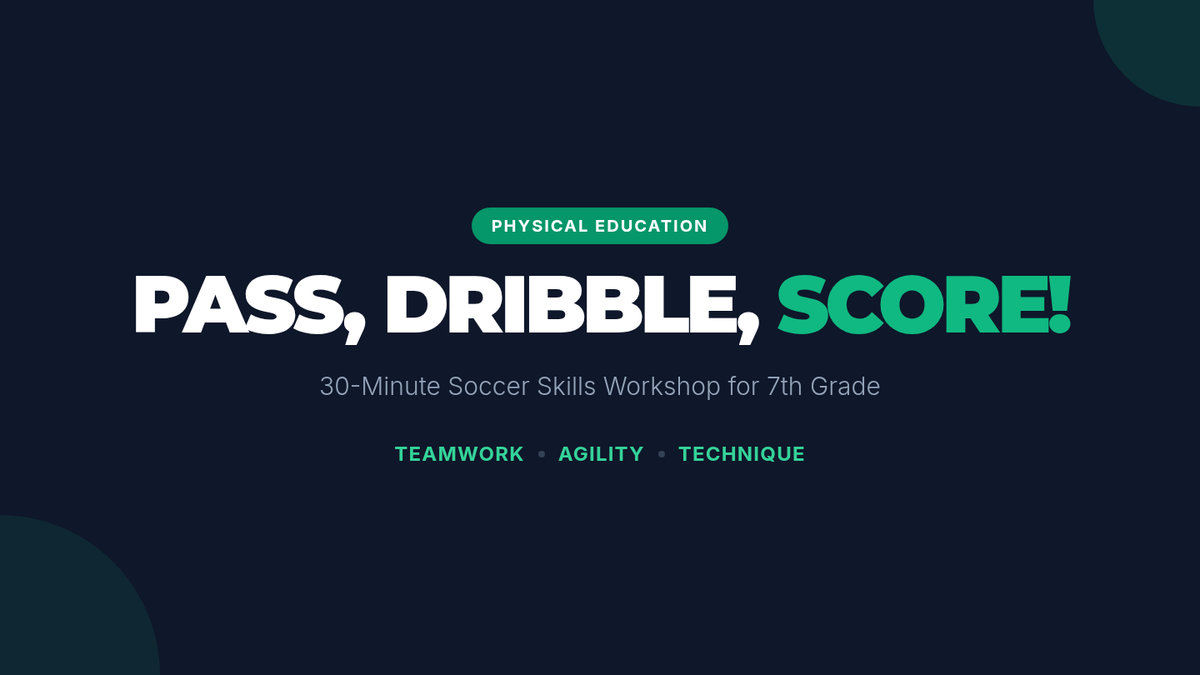 A 30-minute soccer lesson for 7th-grade students focusing on fundamental skills: passing, dribbling, and shooting. The lesson progresses from dynamic warm-ups to targeted drills and concludes with a small-sided game to build teamwork and confidence.