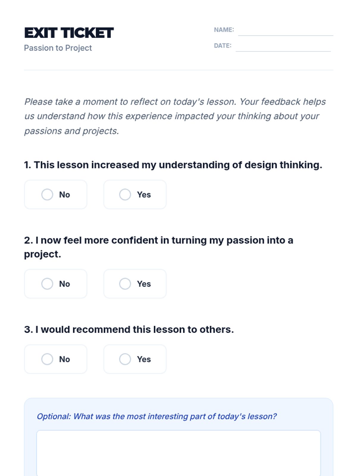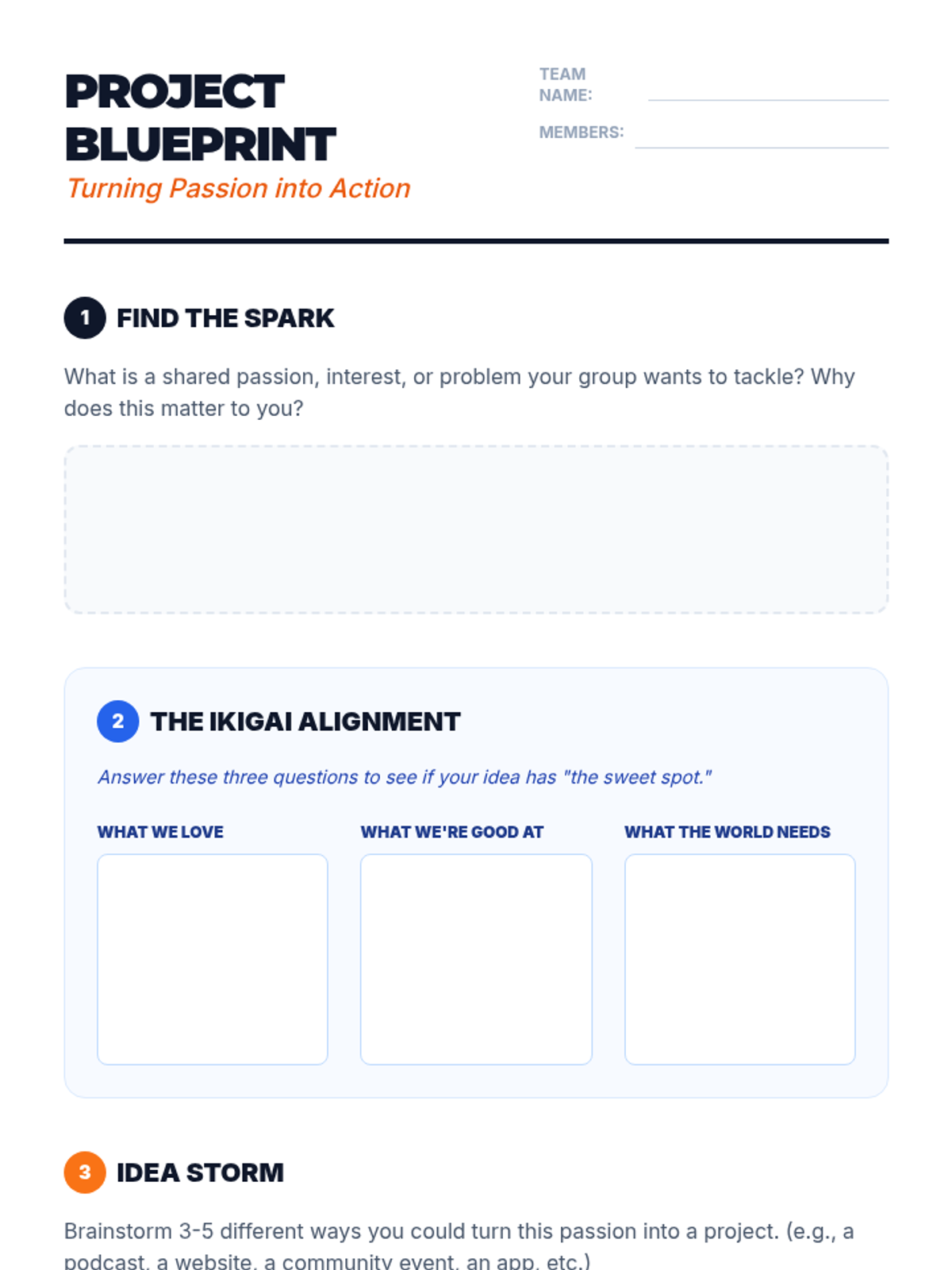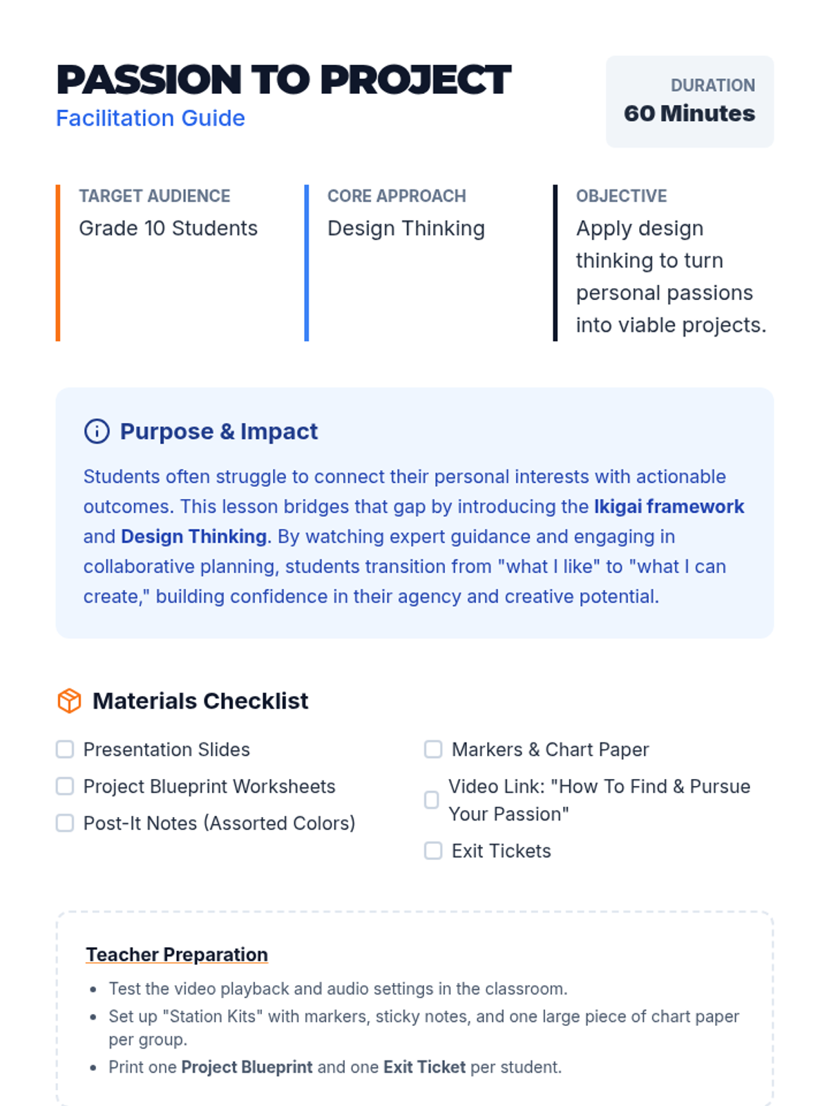 Students explore the intersection of passion and design thinking, watching an instructional video and collaborating to create a project plan using the Ikigai framework and design thinking principles.
