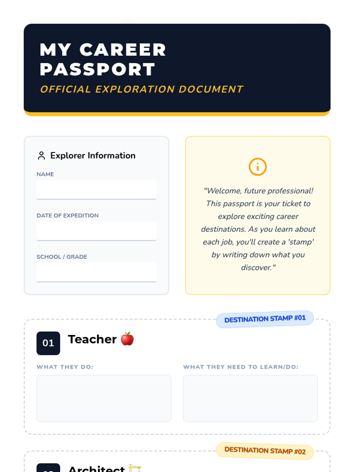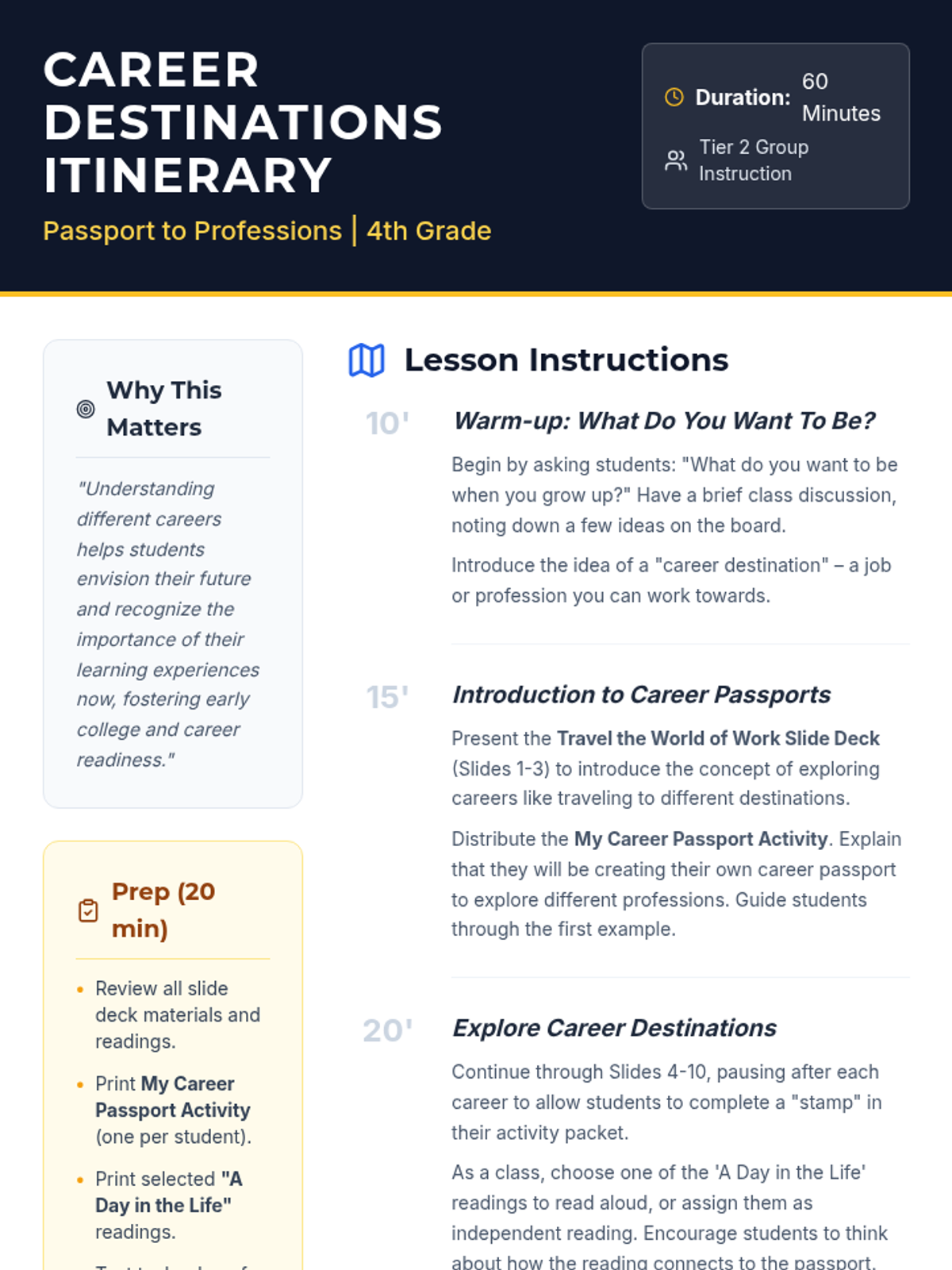 A 60-minute interactive career exploration lesson for 4th graders where they use a 'career passport' to travel through different professions, understanding the education and skills required for each.