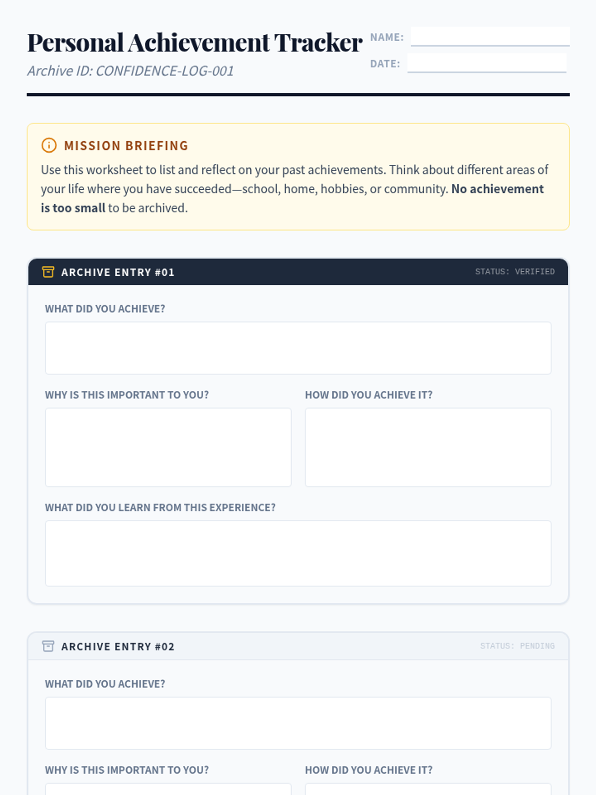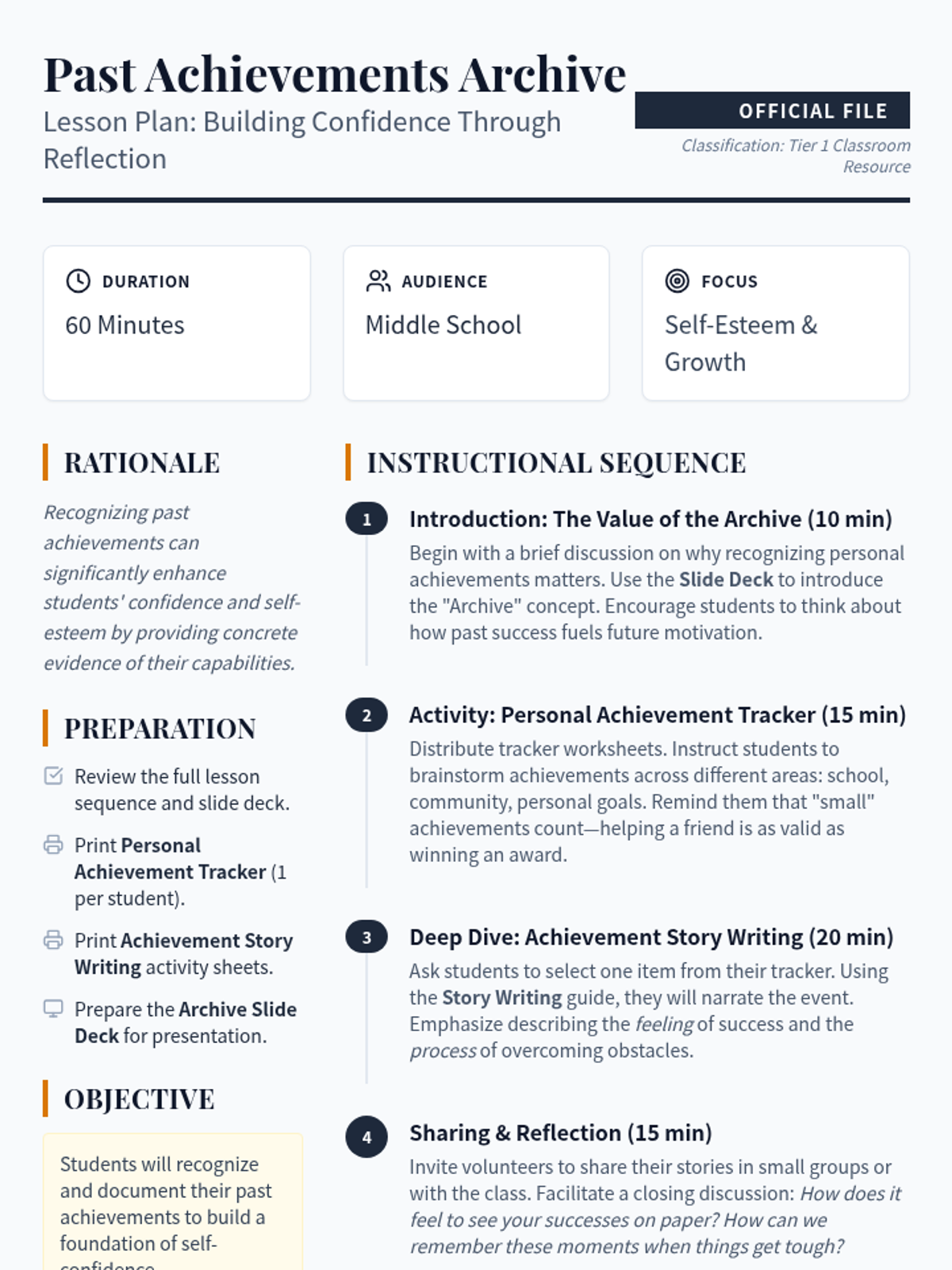 A lesson designed to help middle school students build confidence by identifying, documenting, and reflecting on their past personal achievements through a creative 'archive' theme.