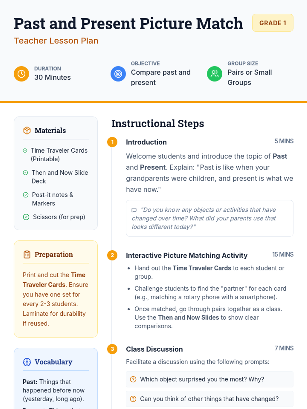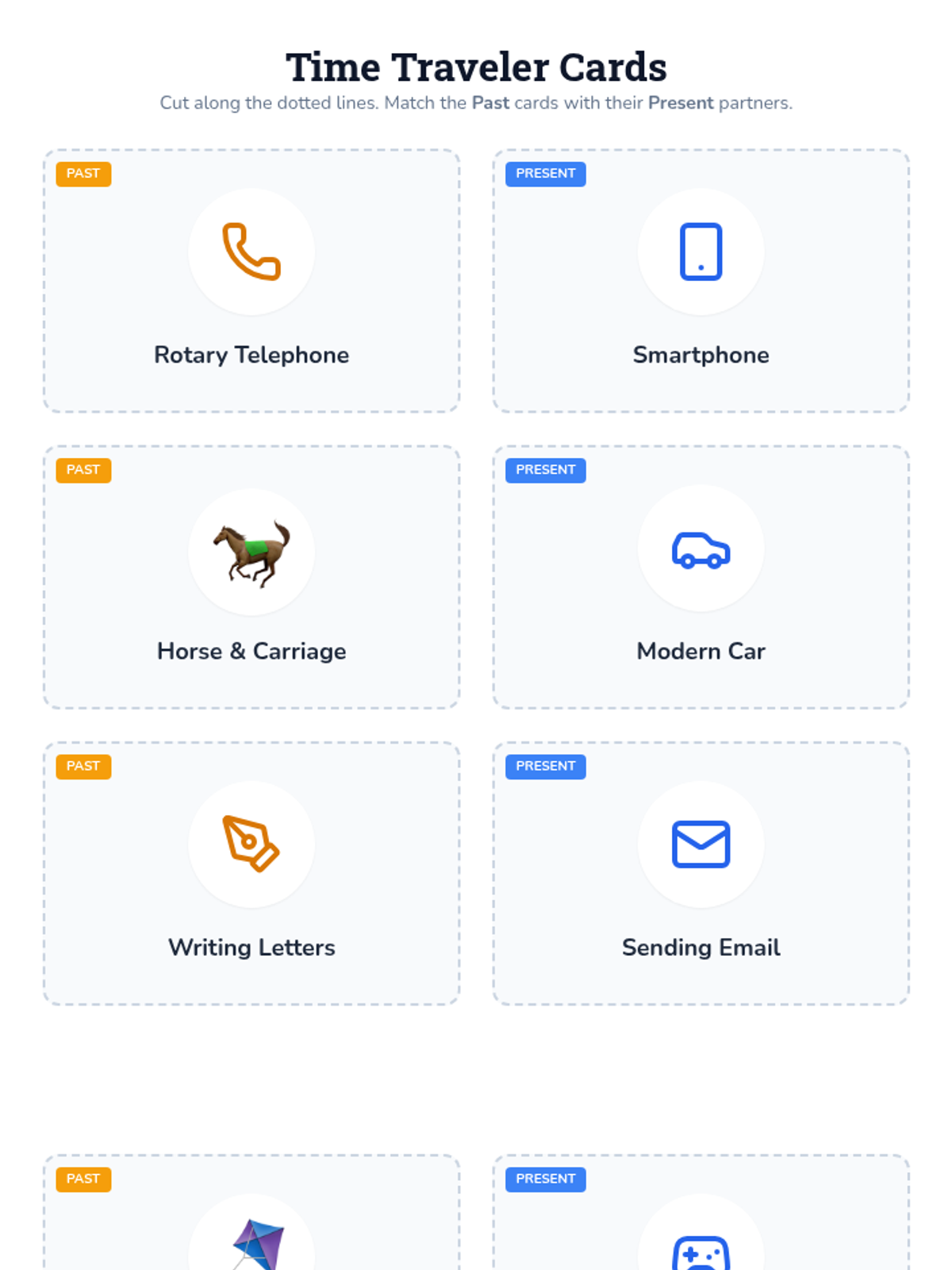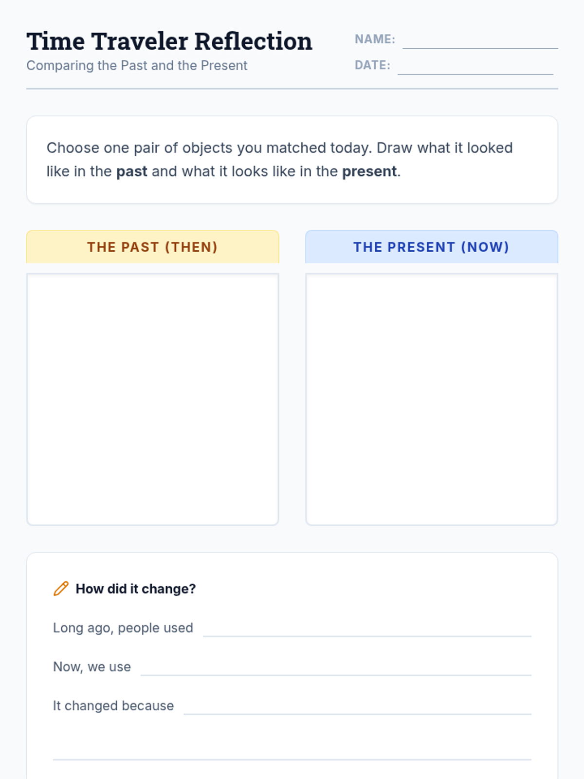 Students will compare objects and activities from the past with their modern counterparts through an interactive picture matching activity to understand chronological change.