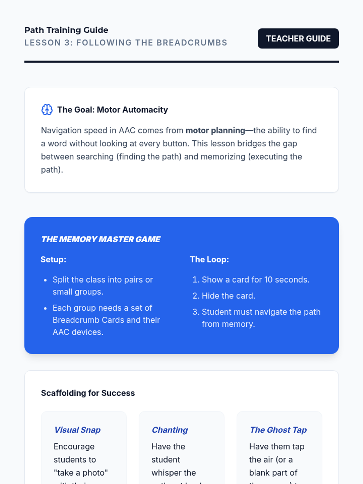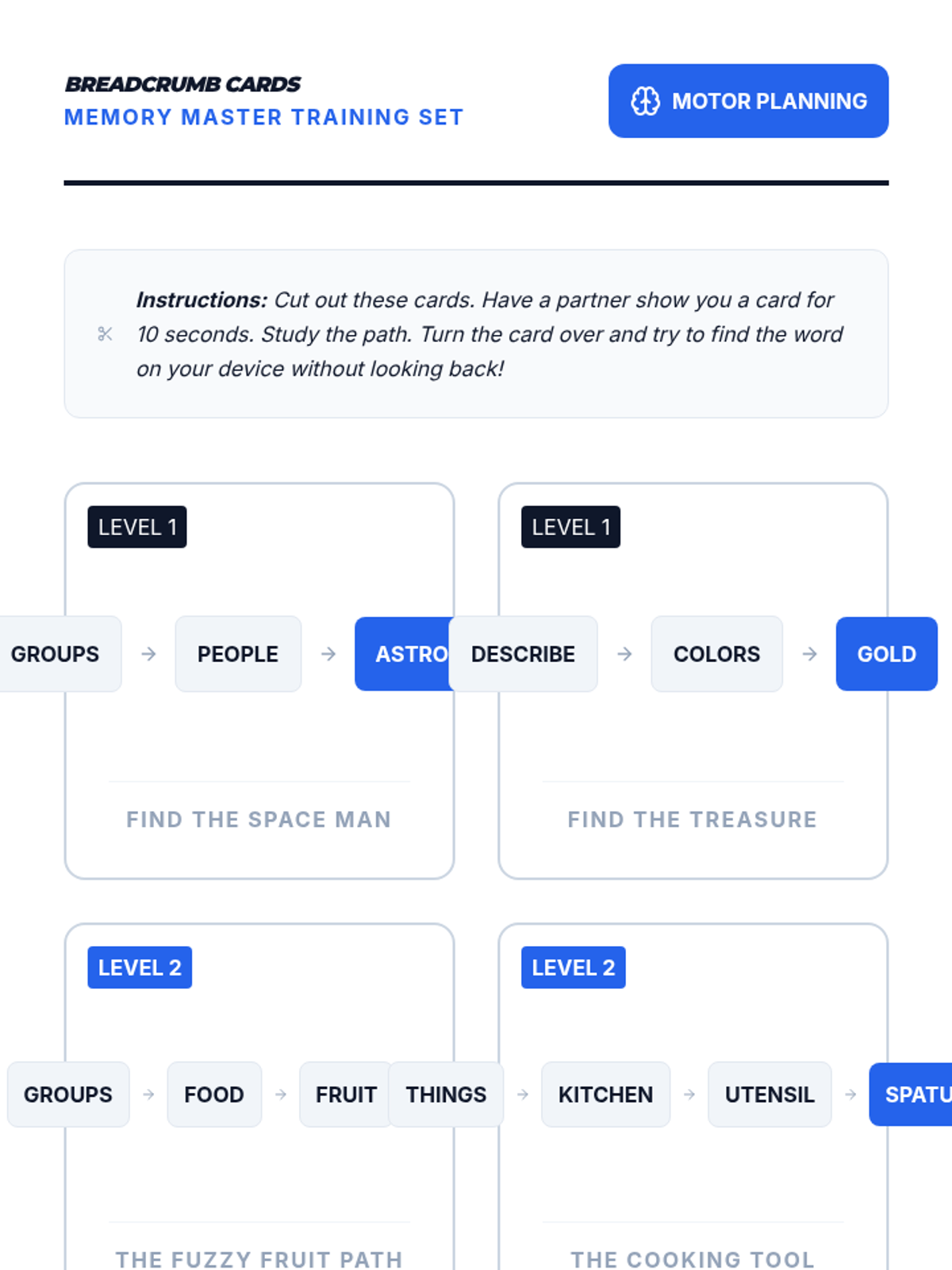 Focuses on working memory and motor planning to follow the visual 'breadcrumbs' shown by the device after a search.