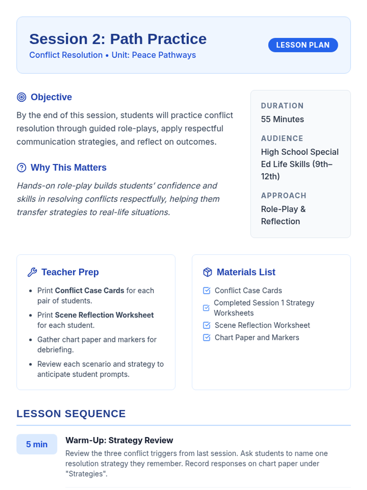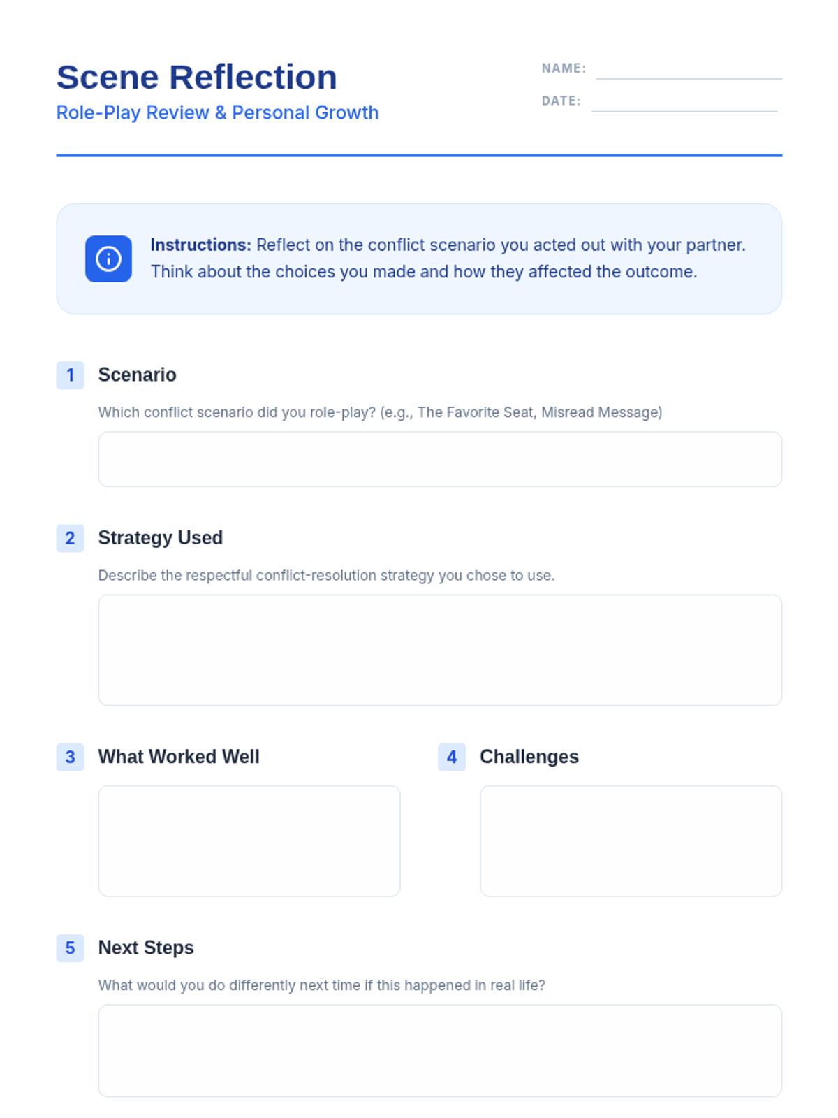 Students practice conflict resolution through guided role-plays, applying respectful communication skills and reflecting on their progress.