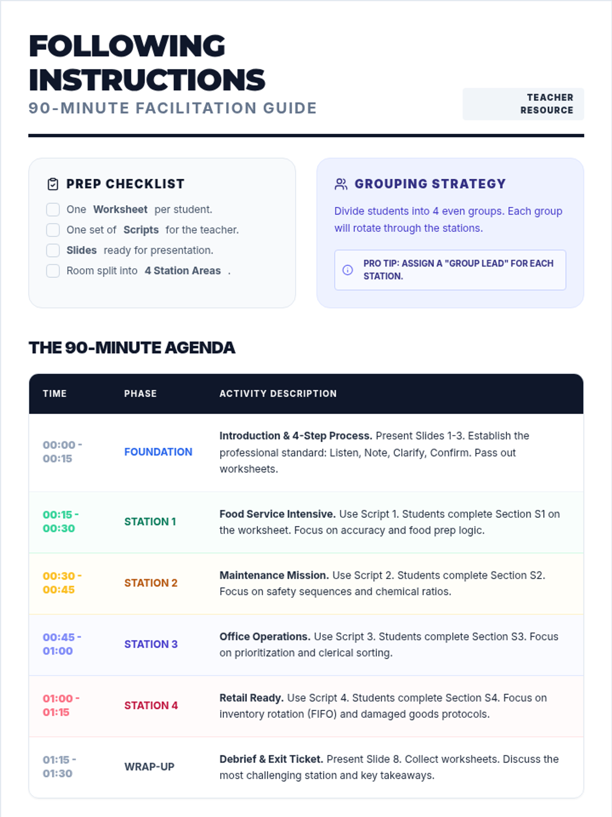 The core 90-minute training session covering four industry-specific challenges. Students rotate through scenarios to master the 4-step professional process for following instructions.