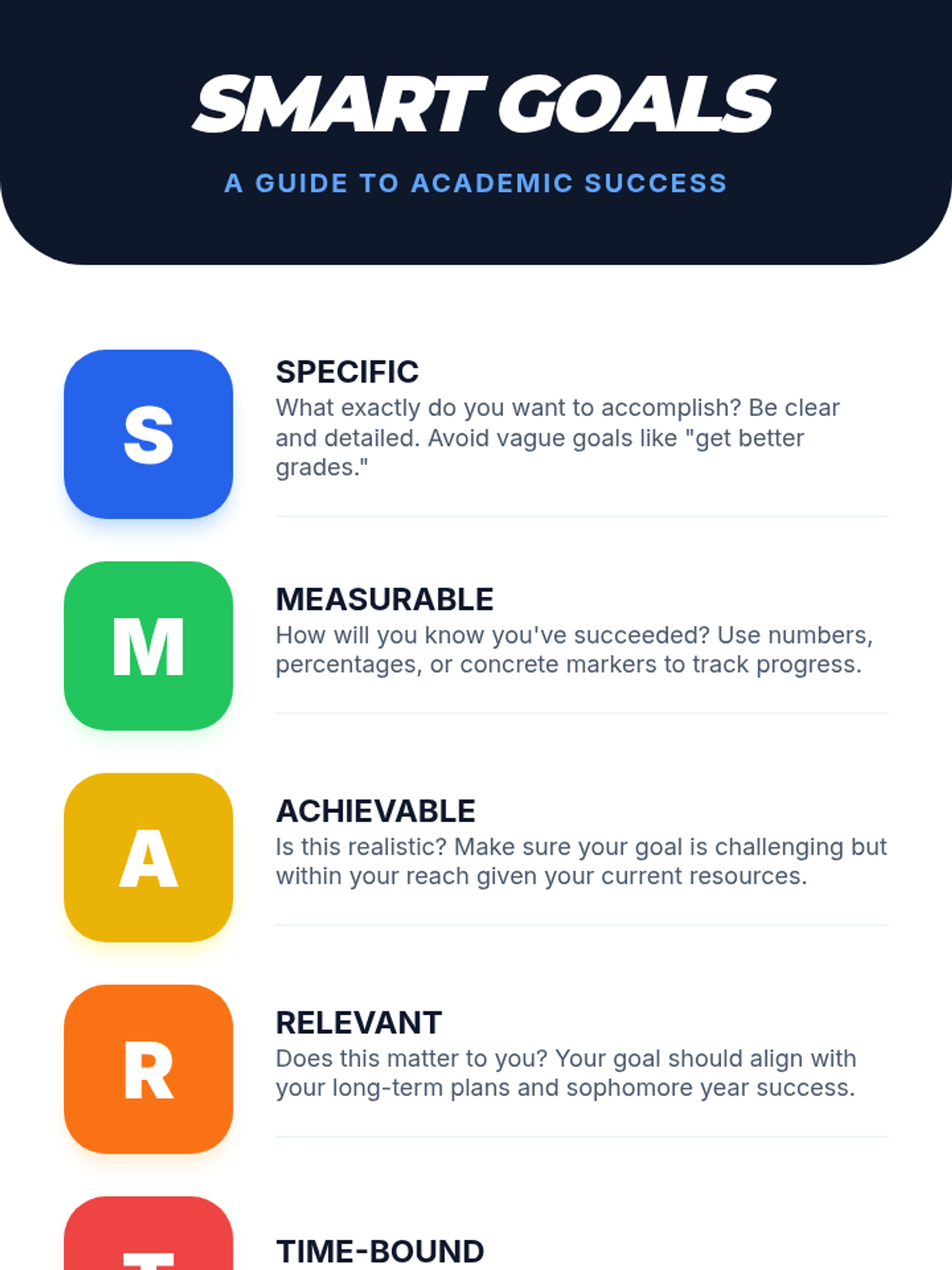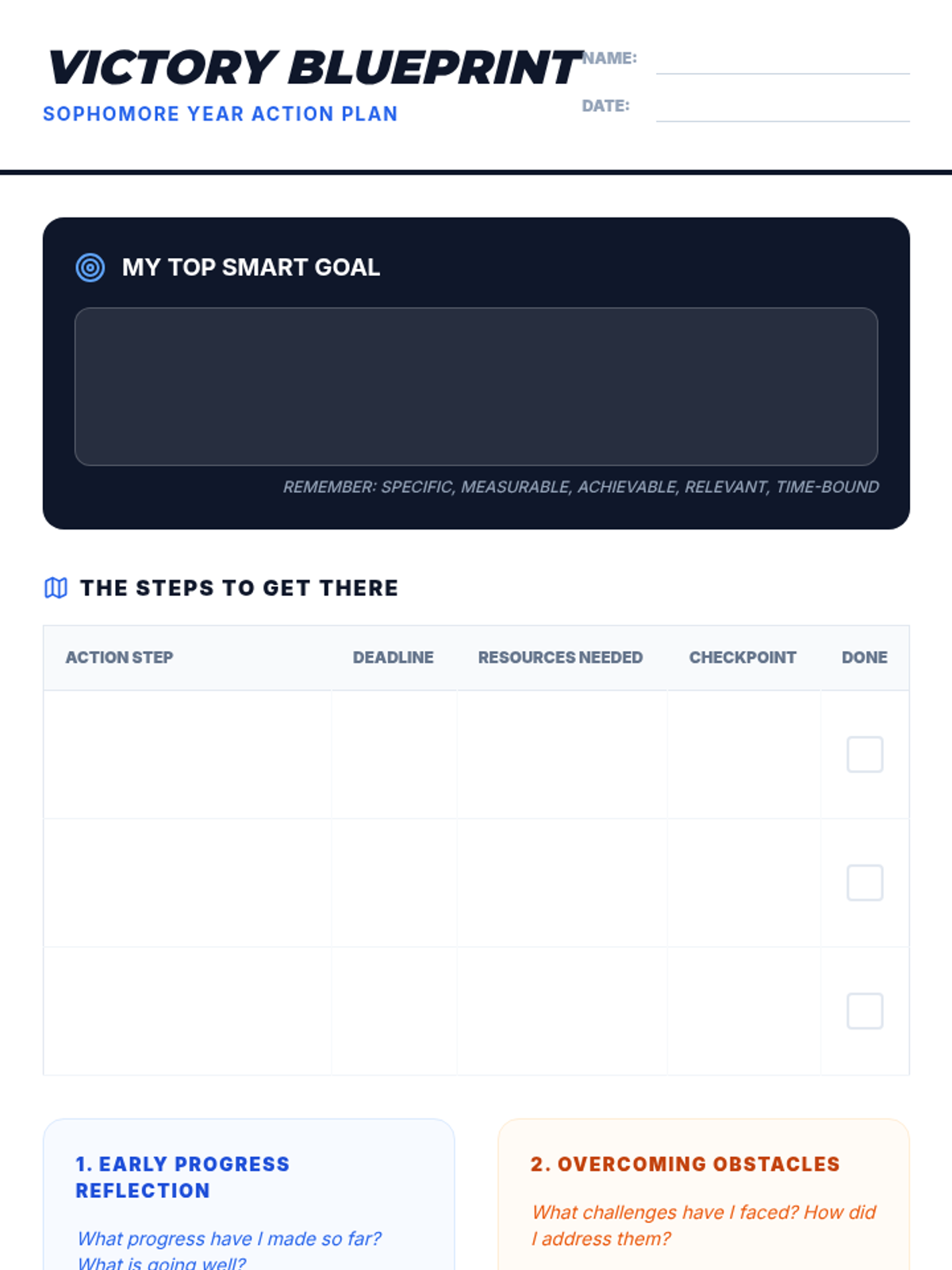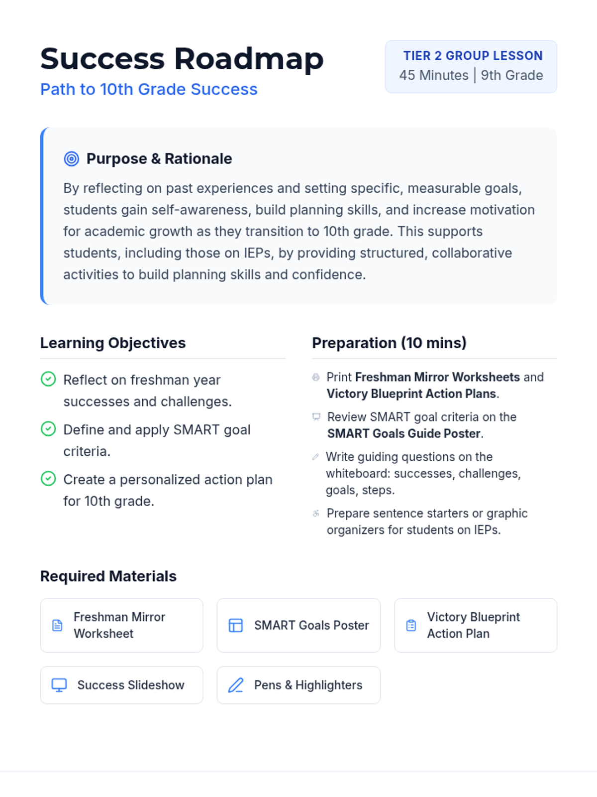 A 45-minute Tier 2 group lesson designed to help 9th graders reflect on their freshman year, master SMART goal-setting, and create a concrete action plan for sophomore year success.