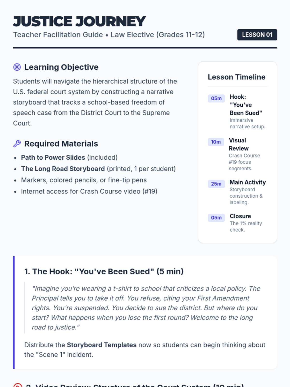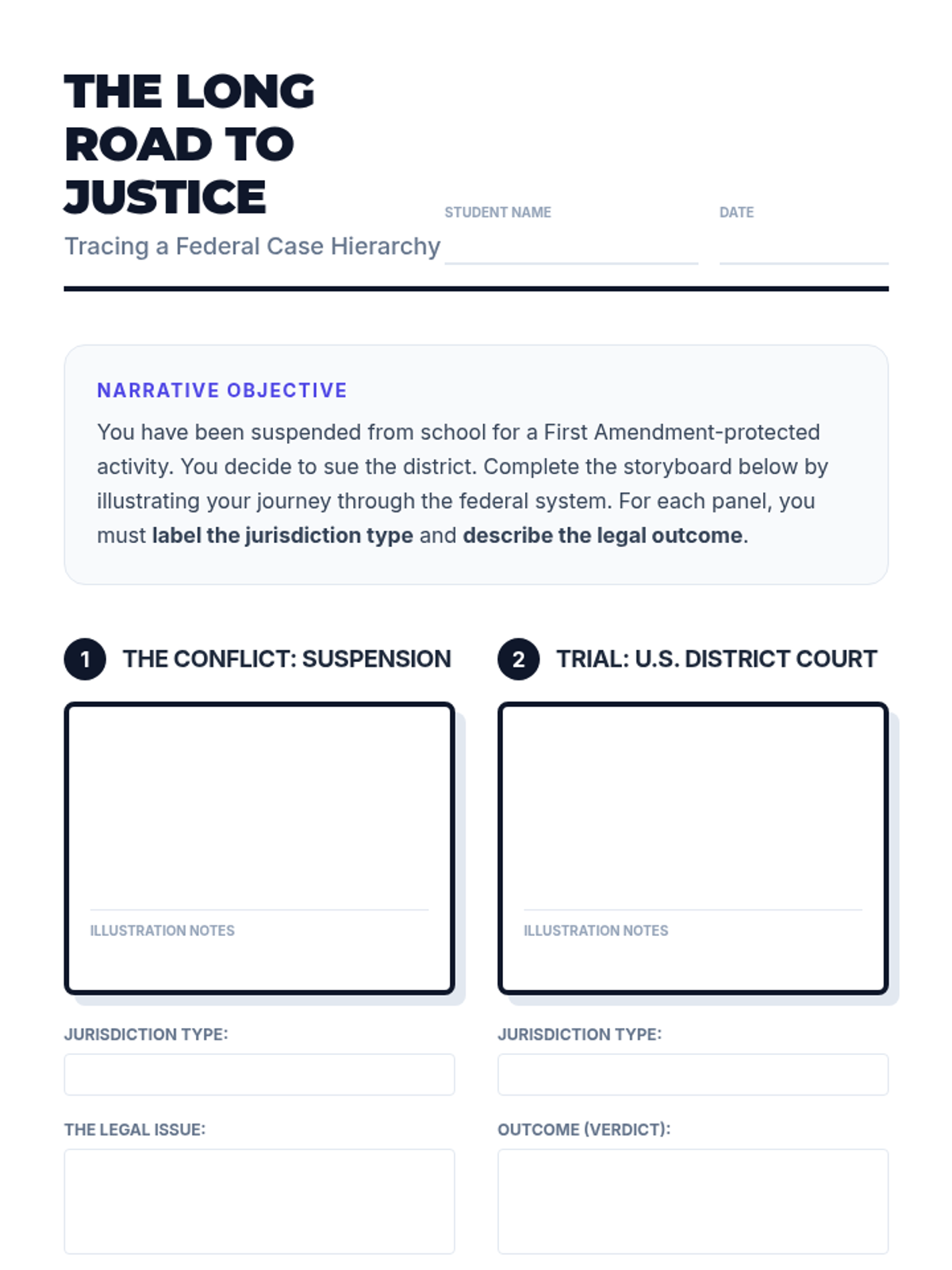 Students trace the hierarchical path of a legal case from trial to the Supreme Court through narrative storyboarding, focusing on jurisdiction and the rigorous filters of the appellate process.
