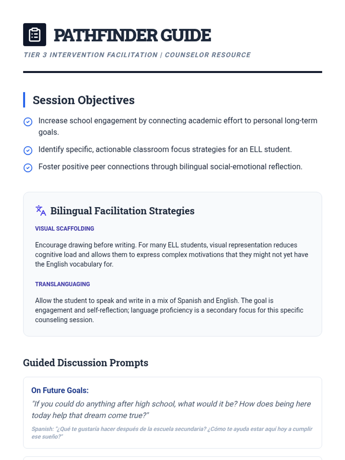 An intensive Tier 3 counseling session focused on increasing school engagement and motivation through bilingual (English/Spanish) goal-setting and social-emotional reflection.