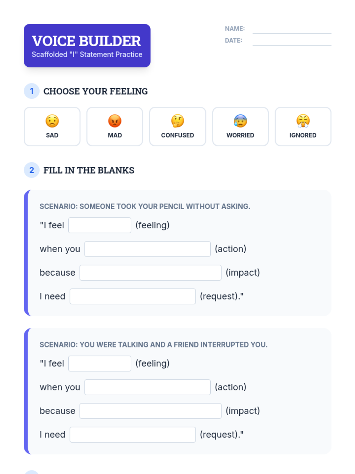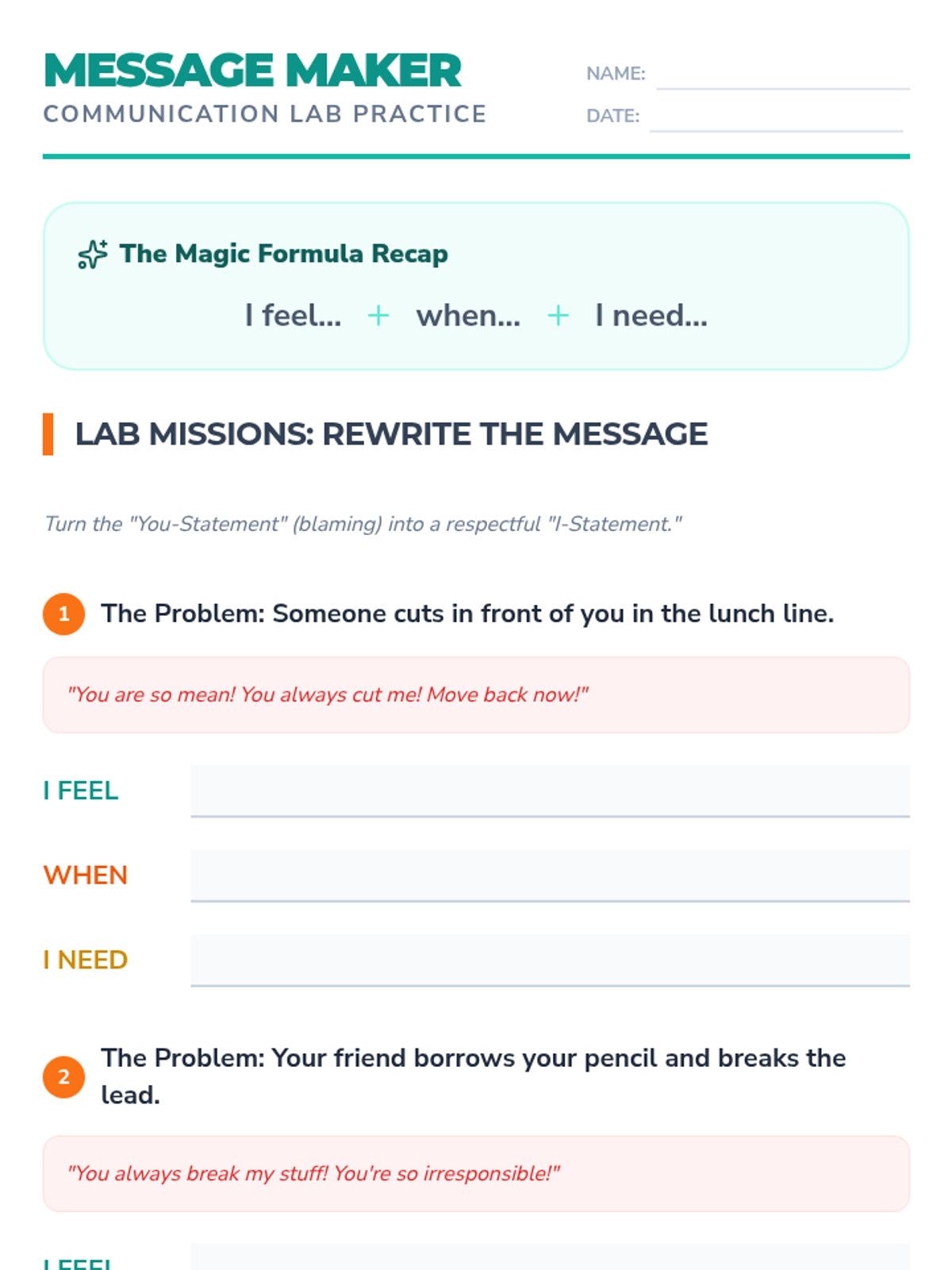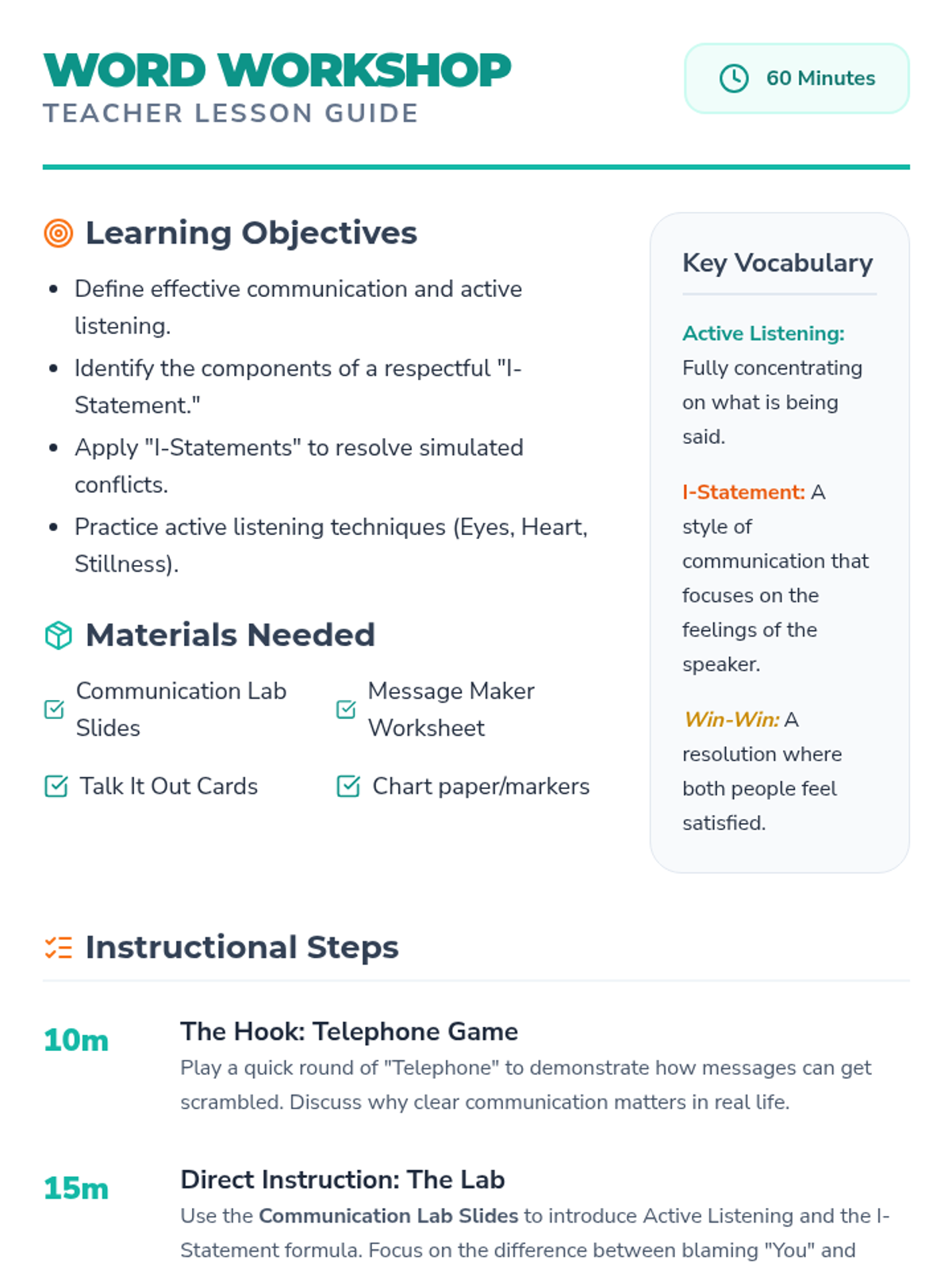 A comprehensive lesson on effective communication, teaching students to use 'I statements,' practice active listening, and resolve conflicts respectfully through hands-on practice and guided discussion.
