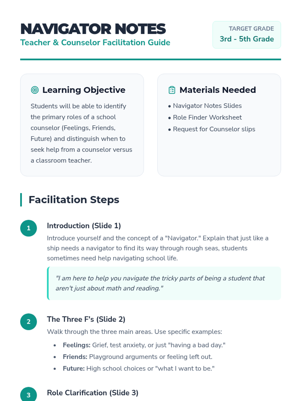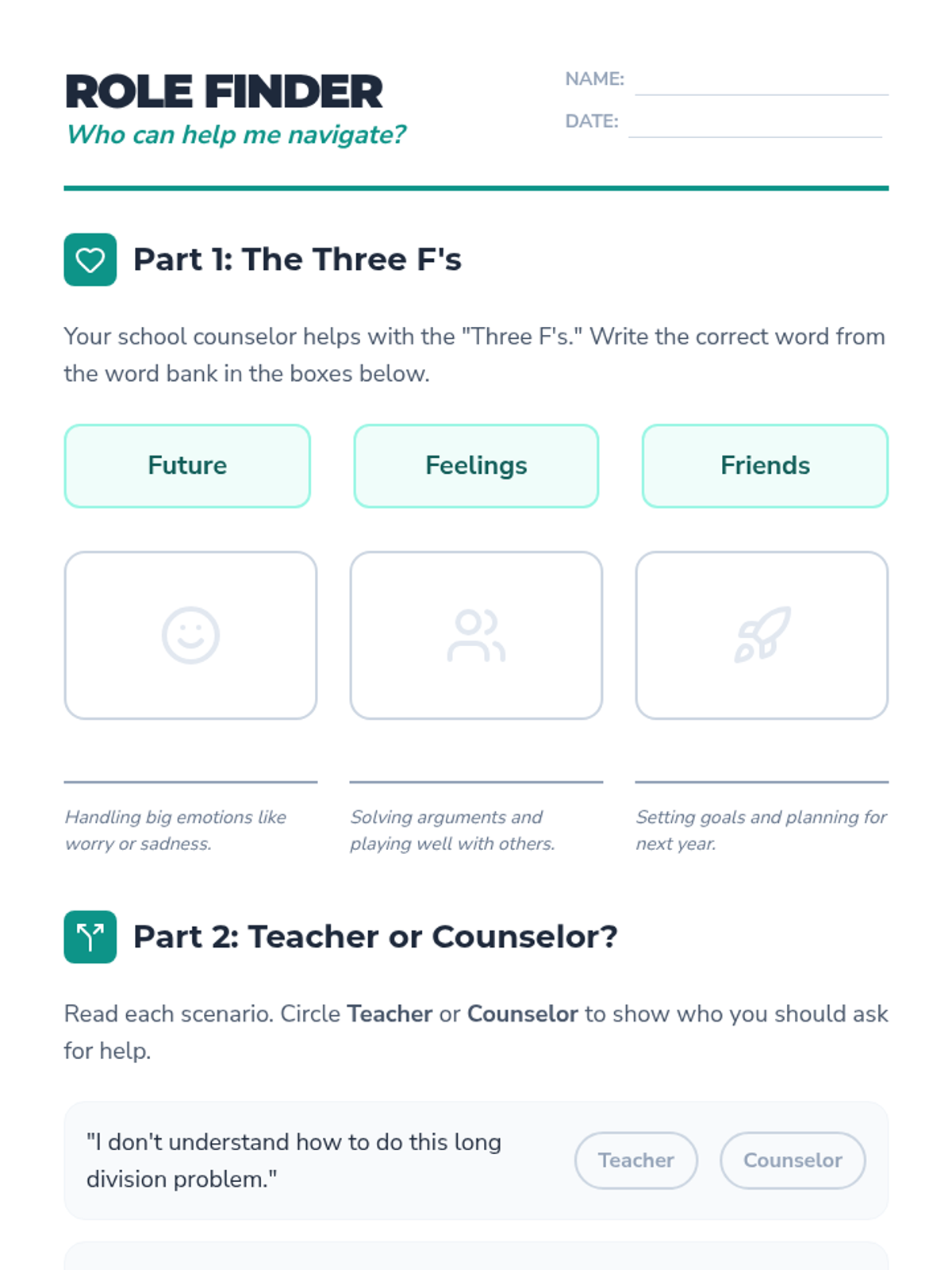 A lesson introducing students to the role of a school counselor, focusing on the 'Three Fs' (feelings, friends, and future plans) and distinguishing the counselor's role from the teacher's role.