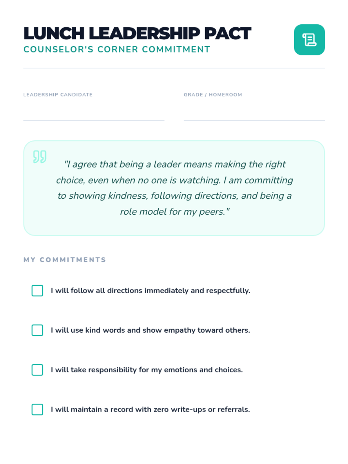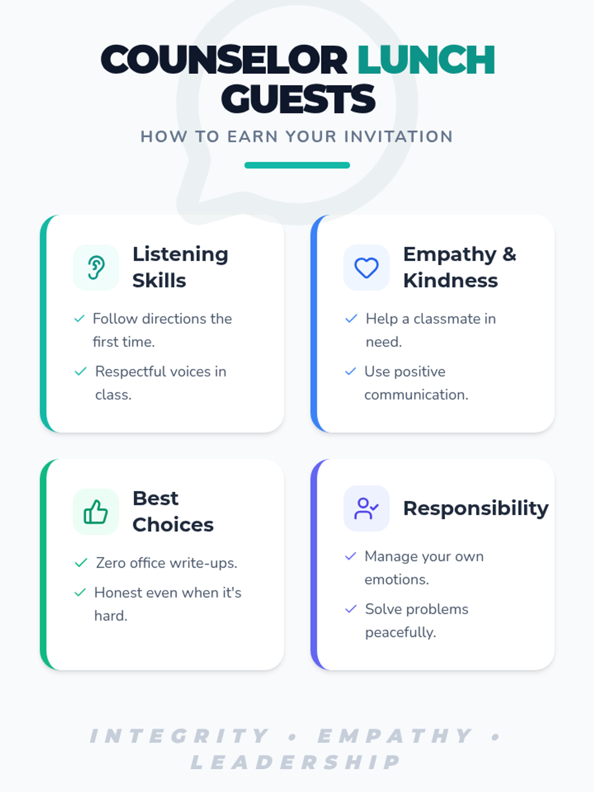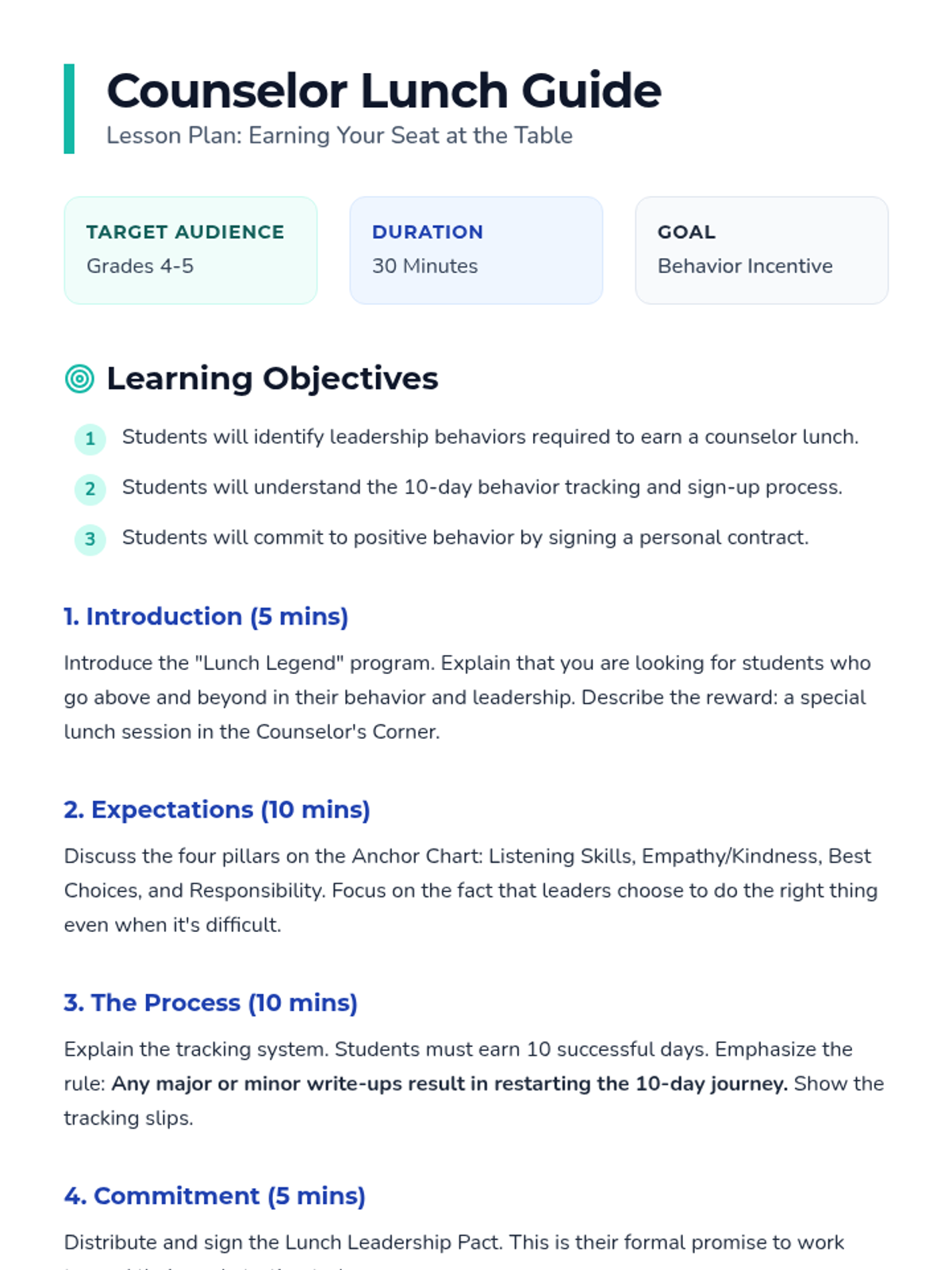 This lesson introduces the Counselor's Corner reward lunch, establishing the high expectations for behavior and the step-by-step process for students to earn their invitation.