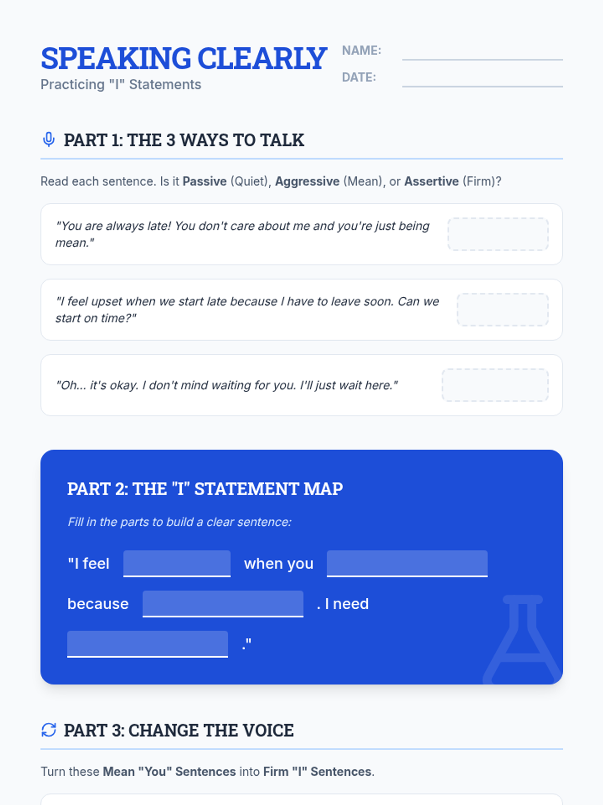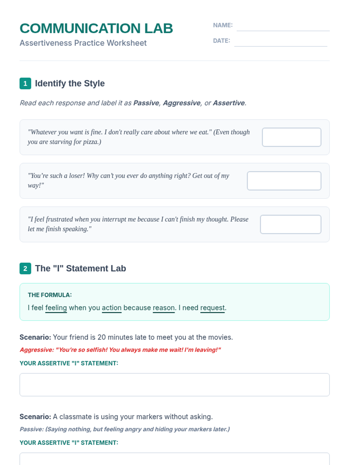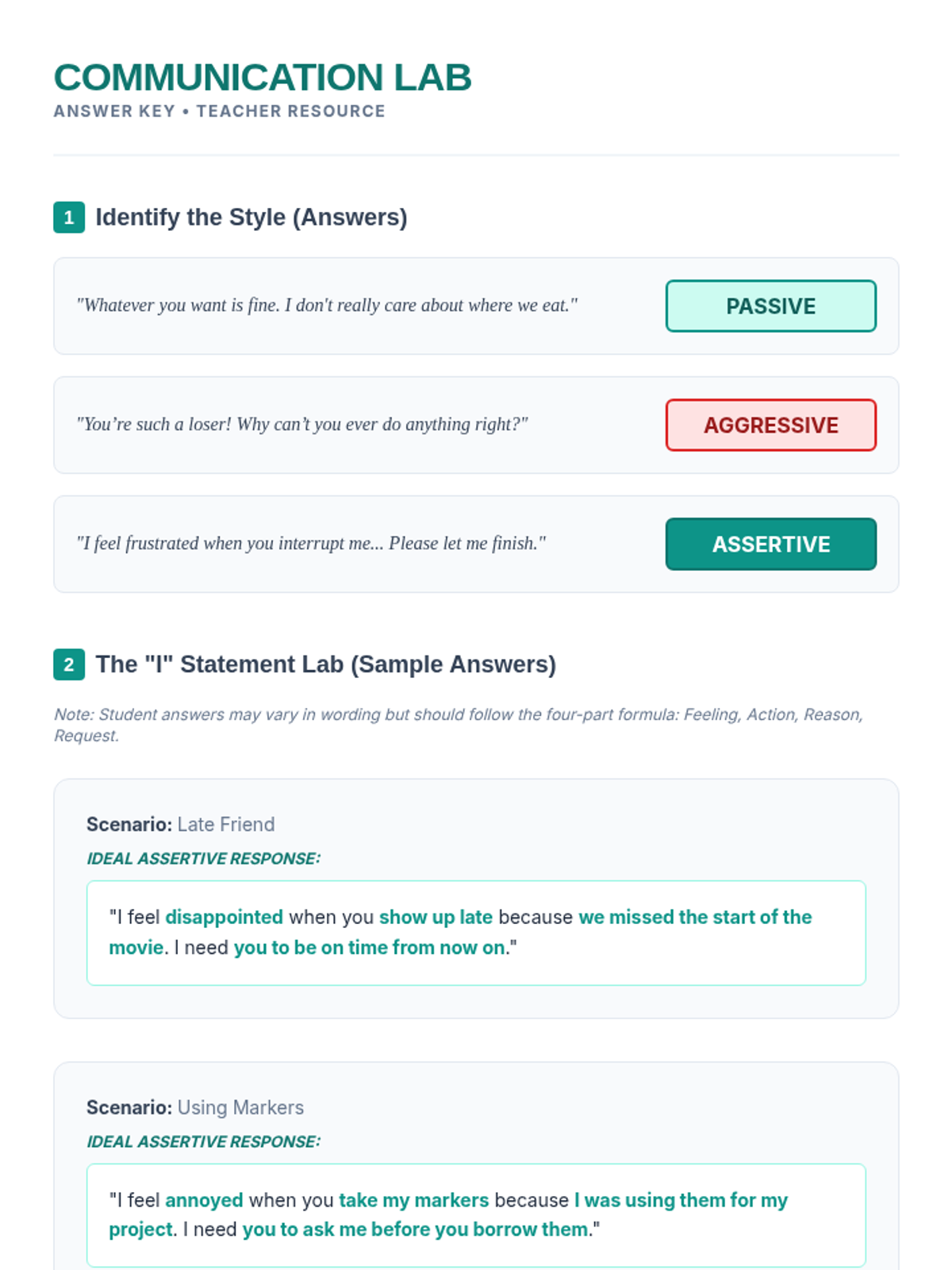 A comprehensive lesson for grades 5-8 focusing on the differences between passive, aggressive, and assertive communication. Students will learn and practice 'I' statements and constructive conflict resolution through role-playing and guided exercises.