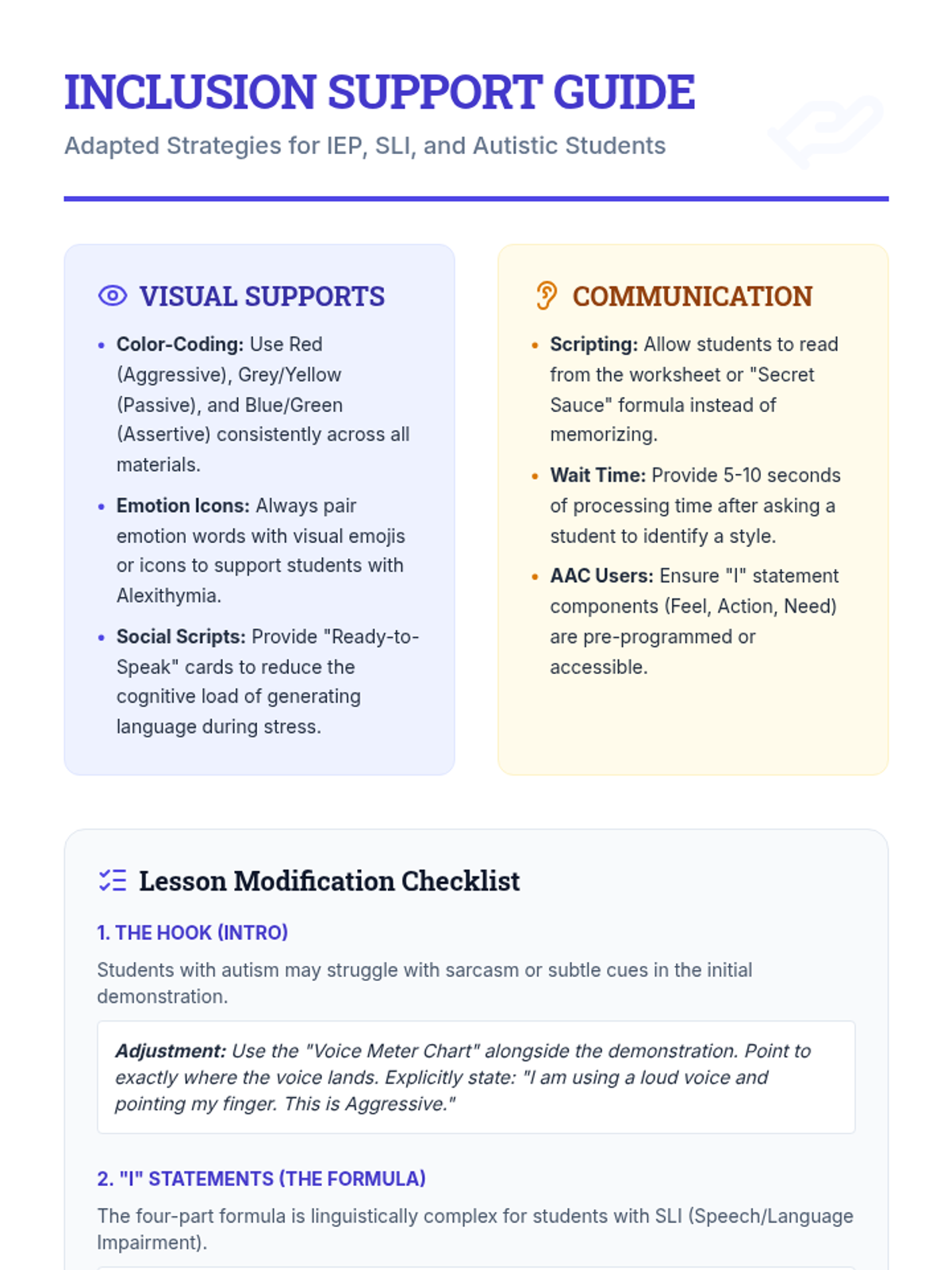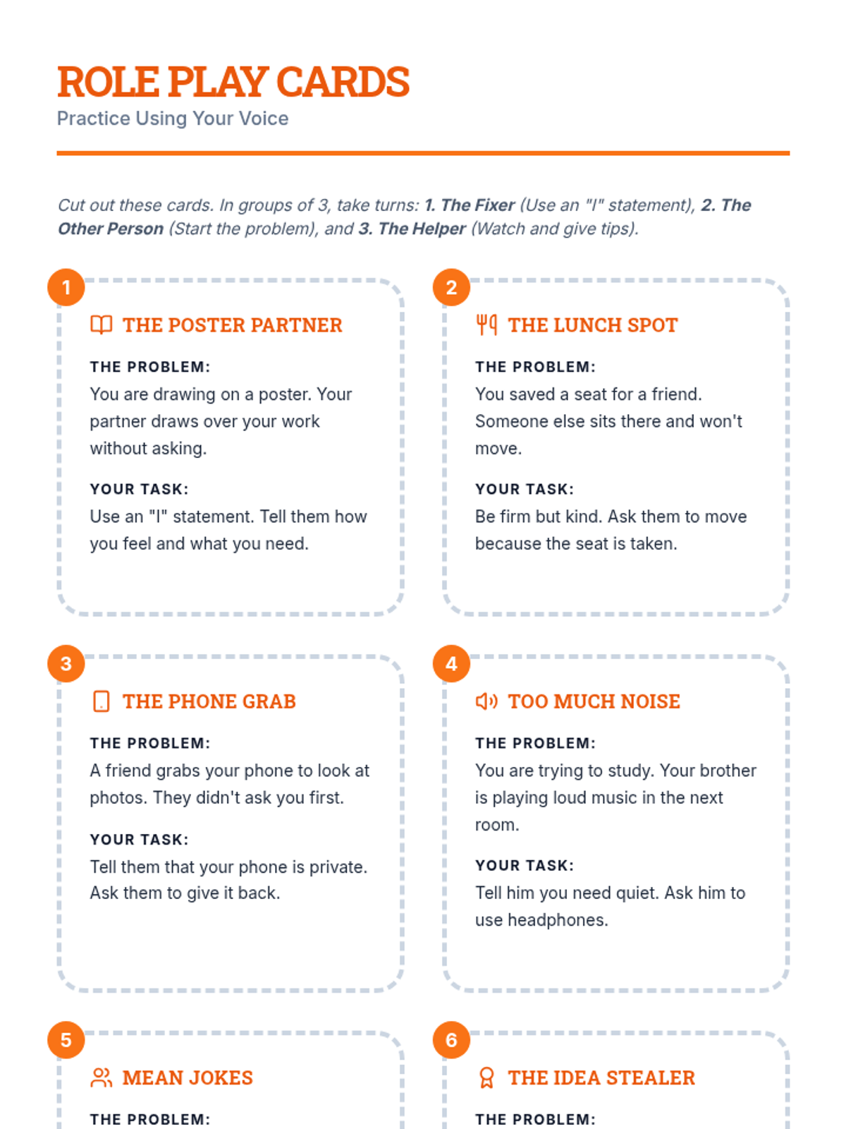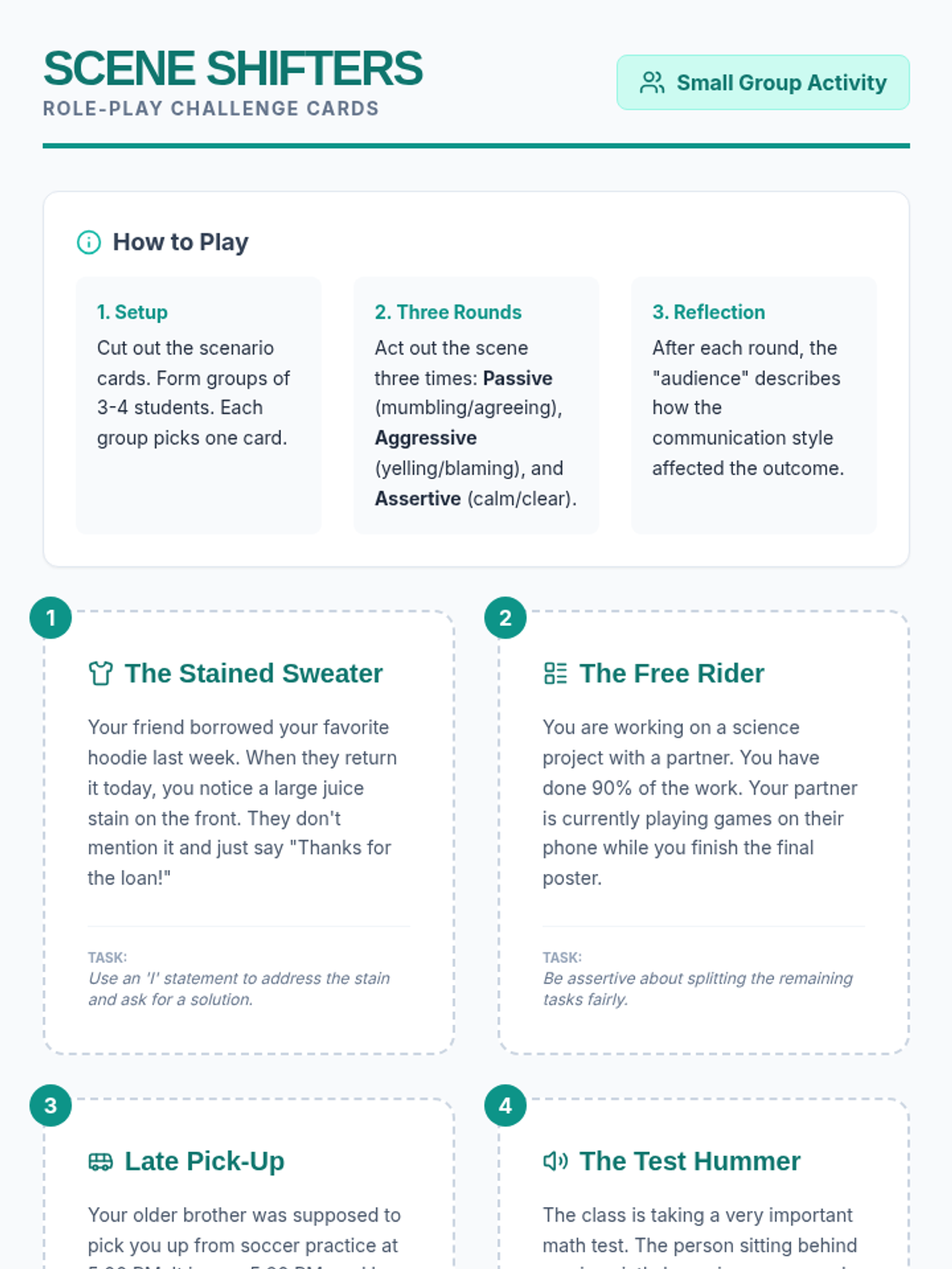 A comprehensive lesson for grades 5-8 focusing on the differences between passive, aggressive, and assertive communication. Students will learn and practice 'I' statements and constructive conflict resolution through role-playing and guided exercises.