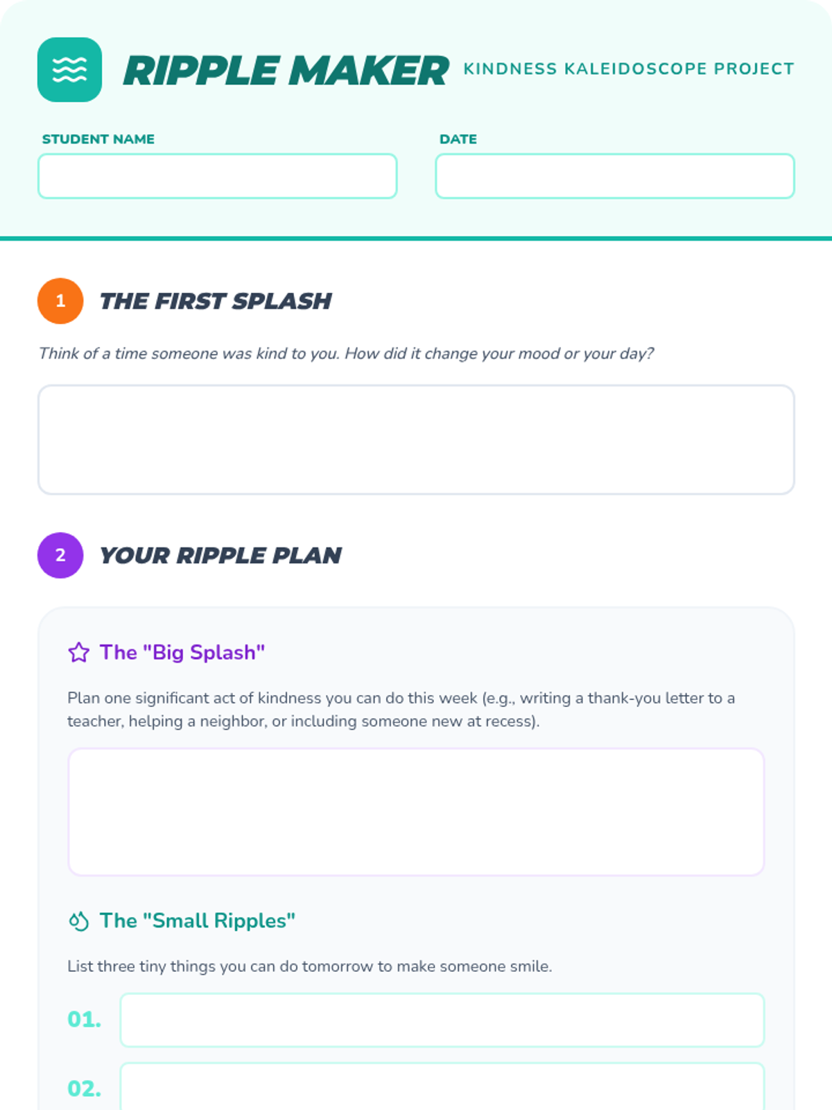 A comprehensive lesson for grades 3-6 exploring the ripple effect of kindness through reflection, storytelling, and collaborative action. Students will discover how small acts of positivity can transform their community like shifting patterns in a kaleidoscope.