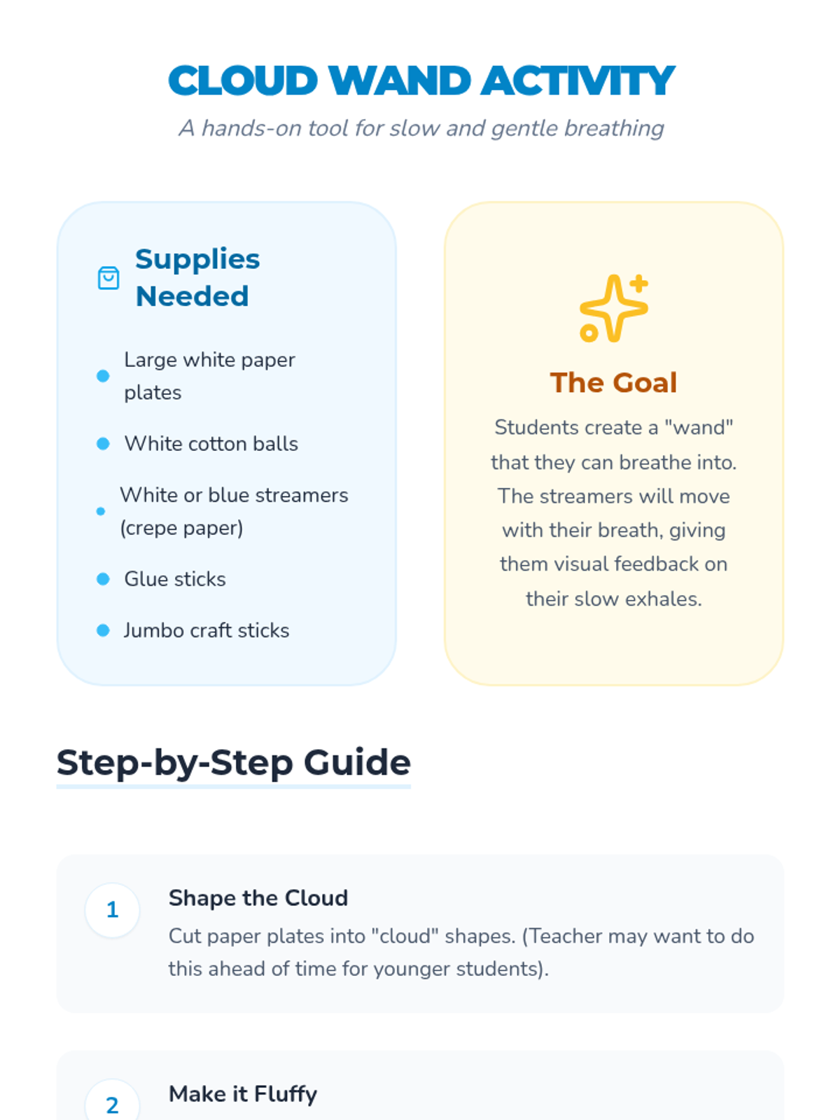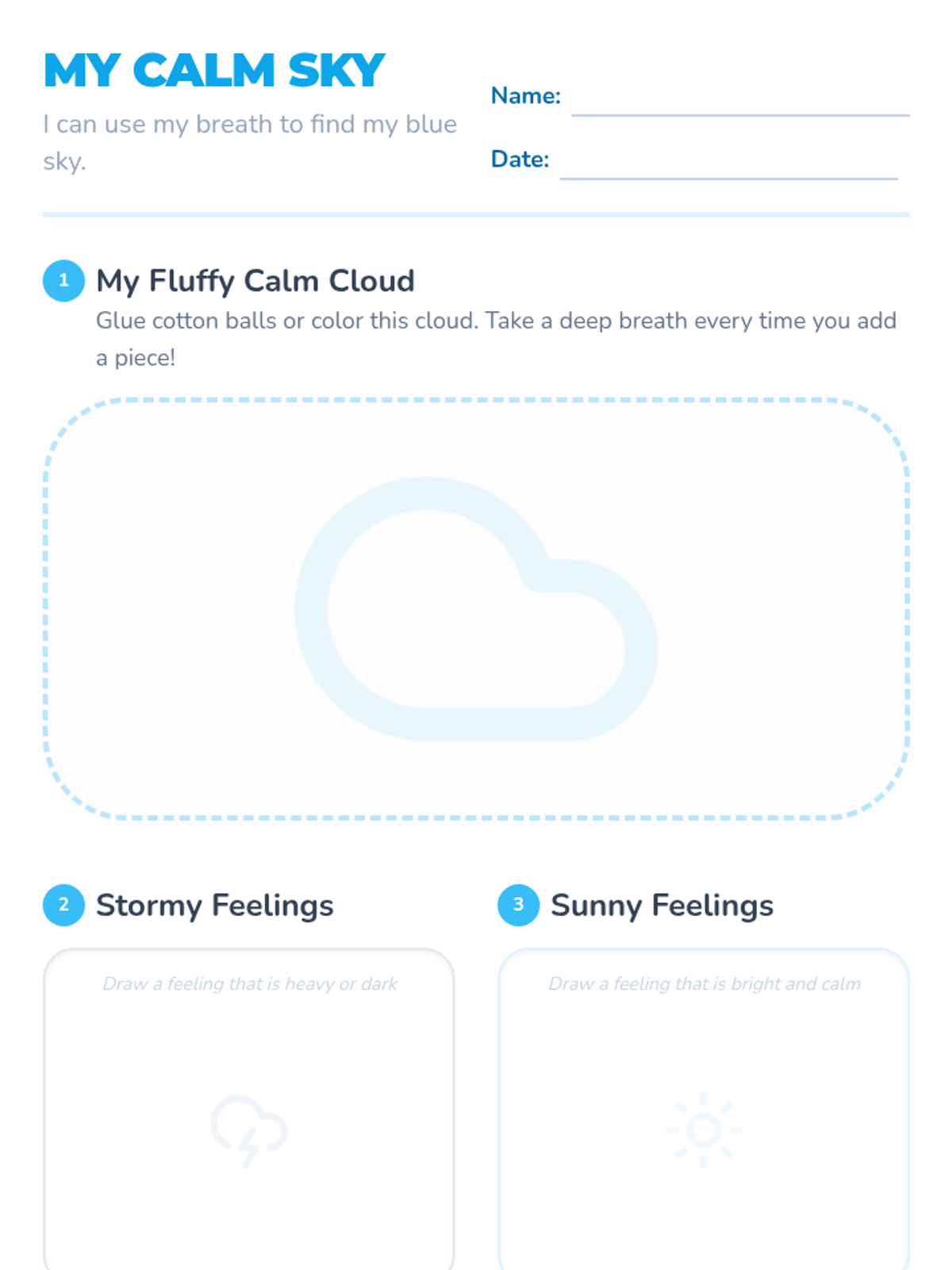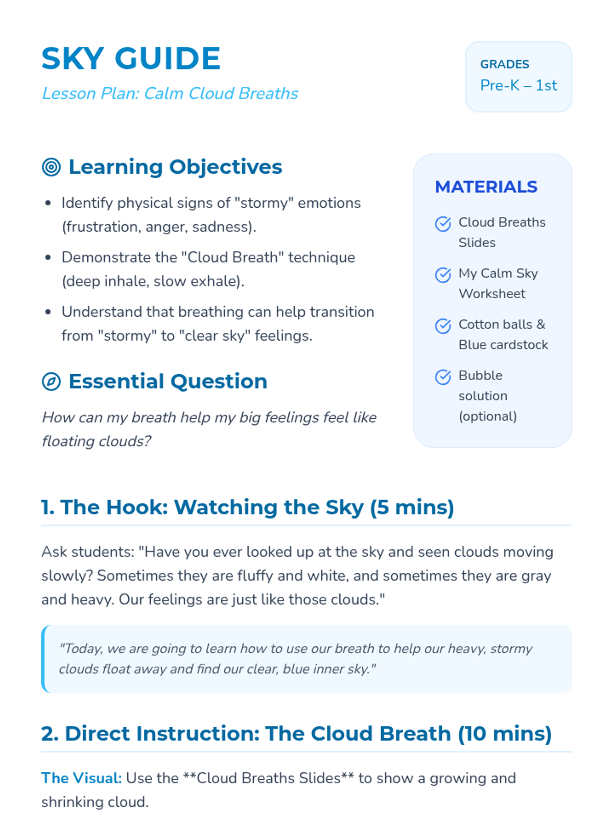 A soothing lesson for young learners (Pre-K to 1st Grade) that teaches simple breathing techniques and emotional self-regulation through cloud-themed visualization and gentle movement.