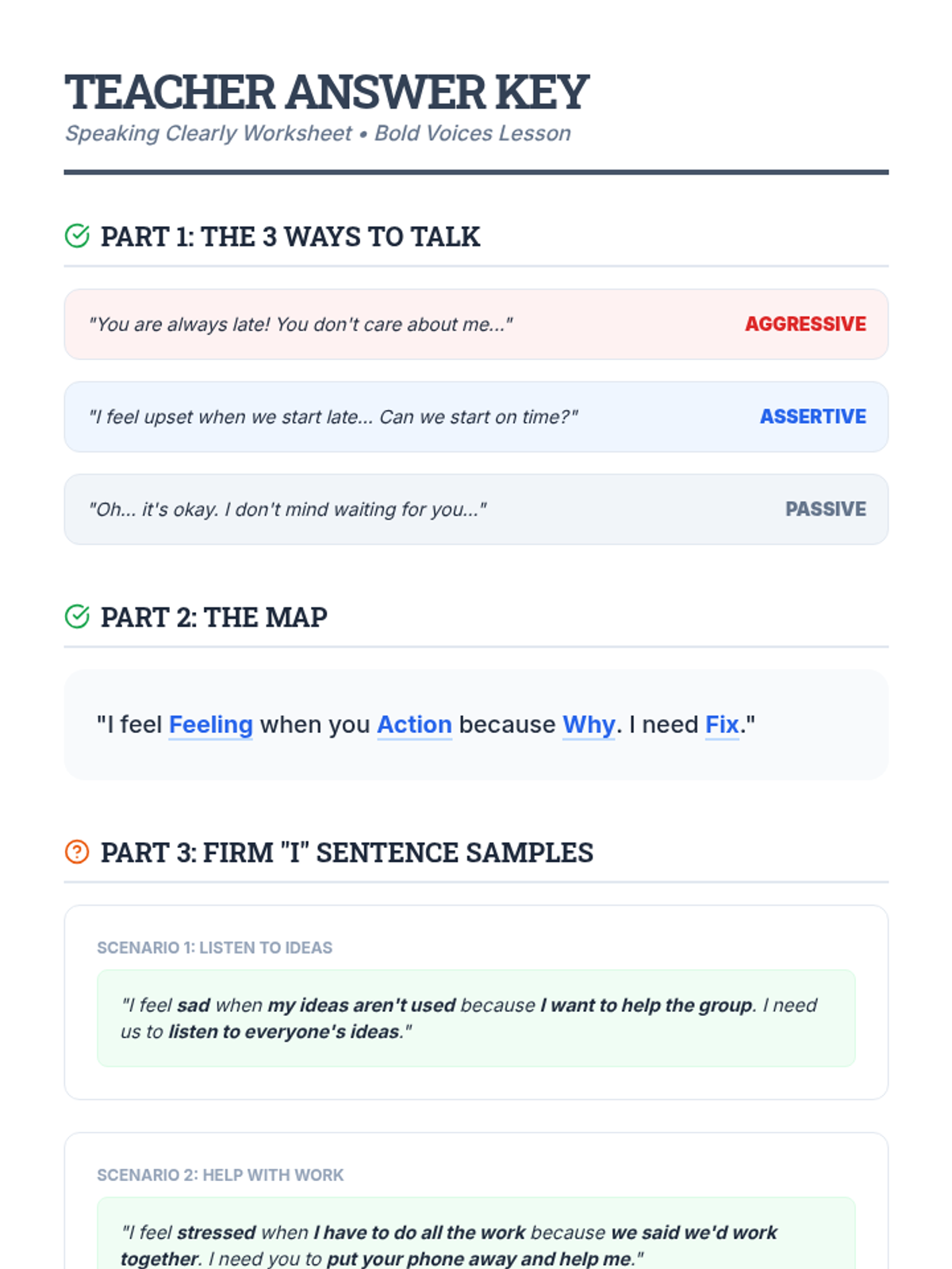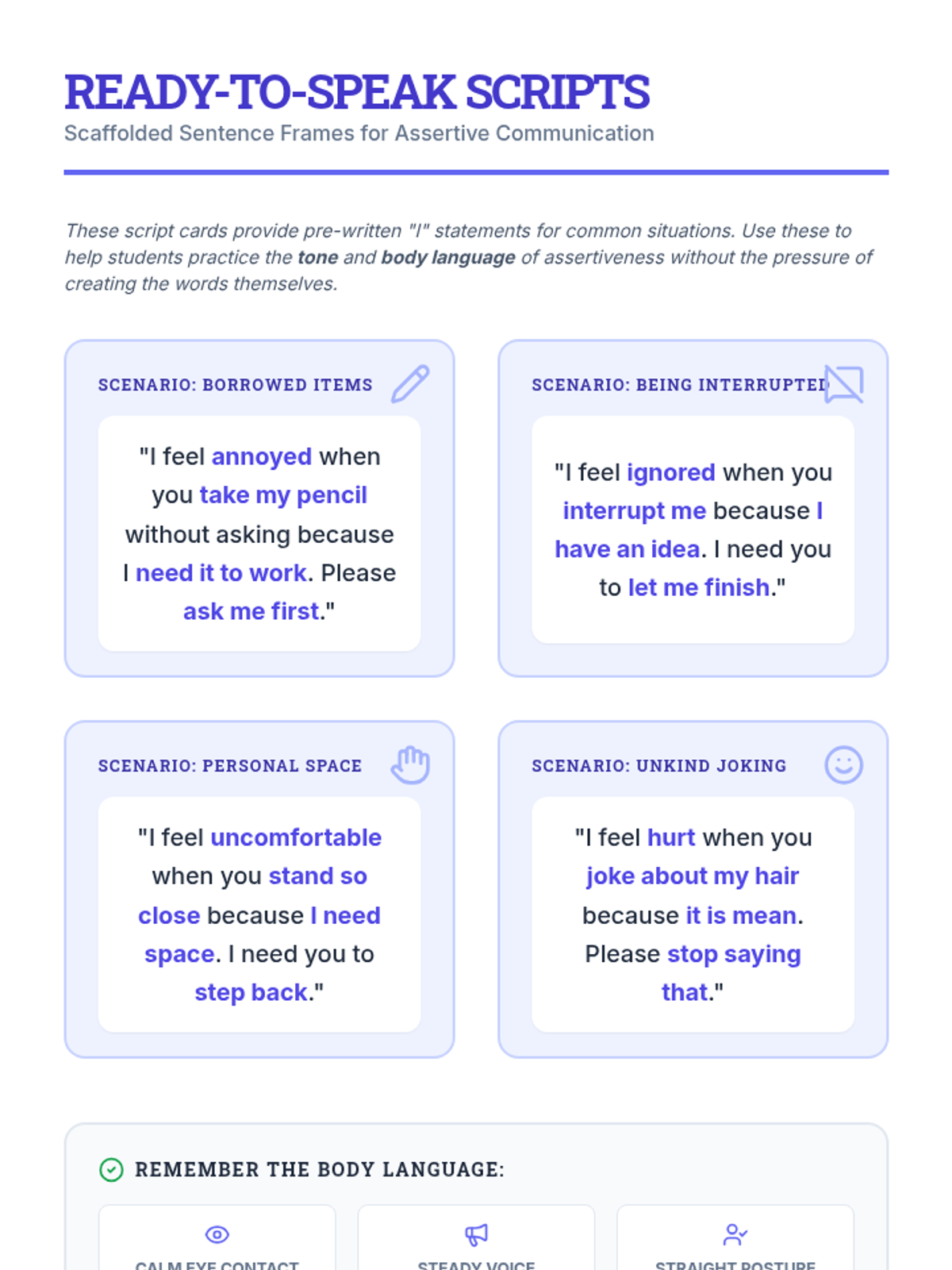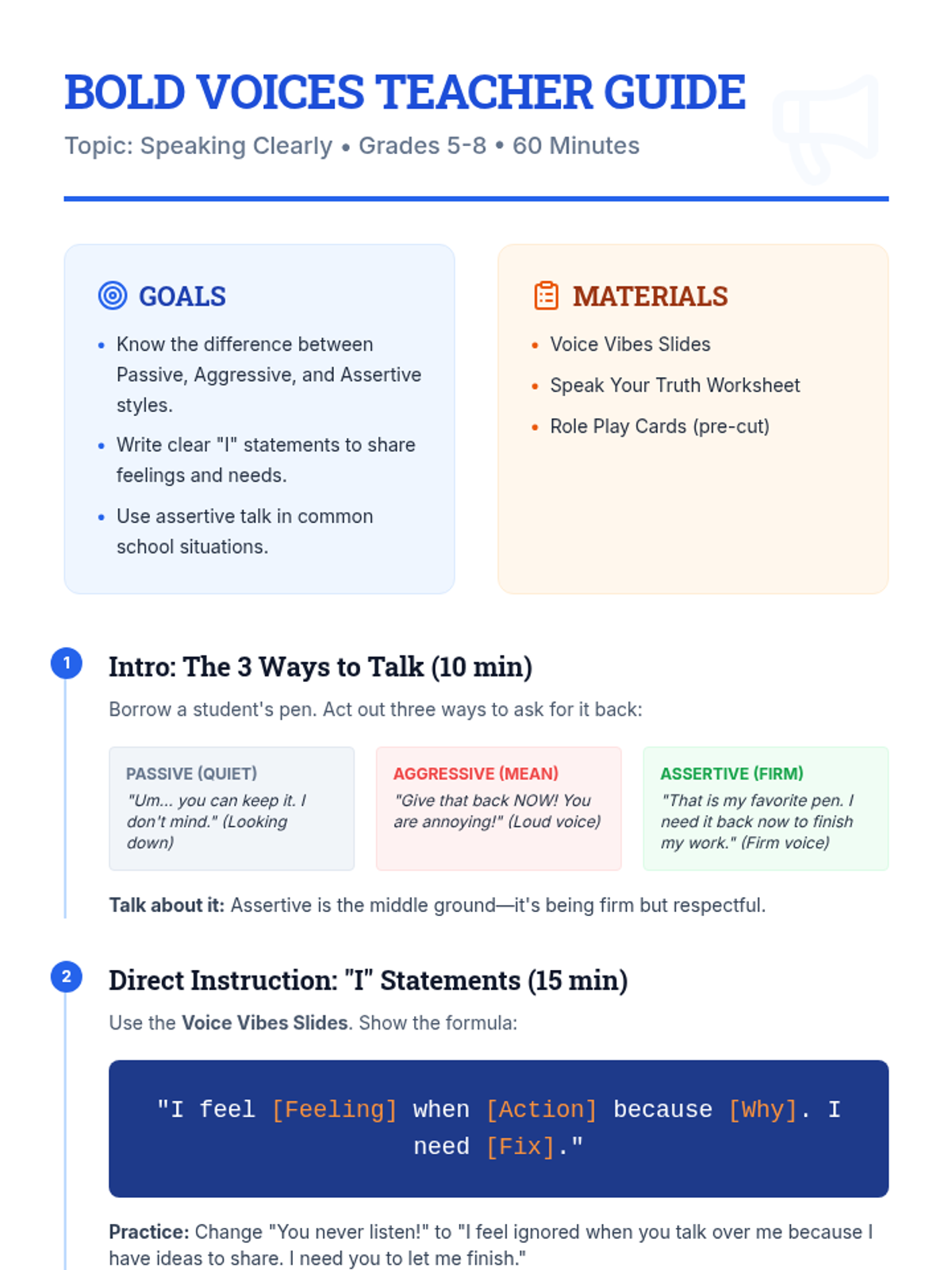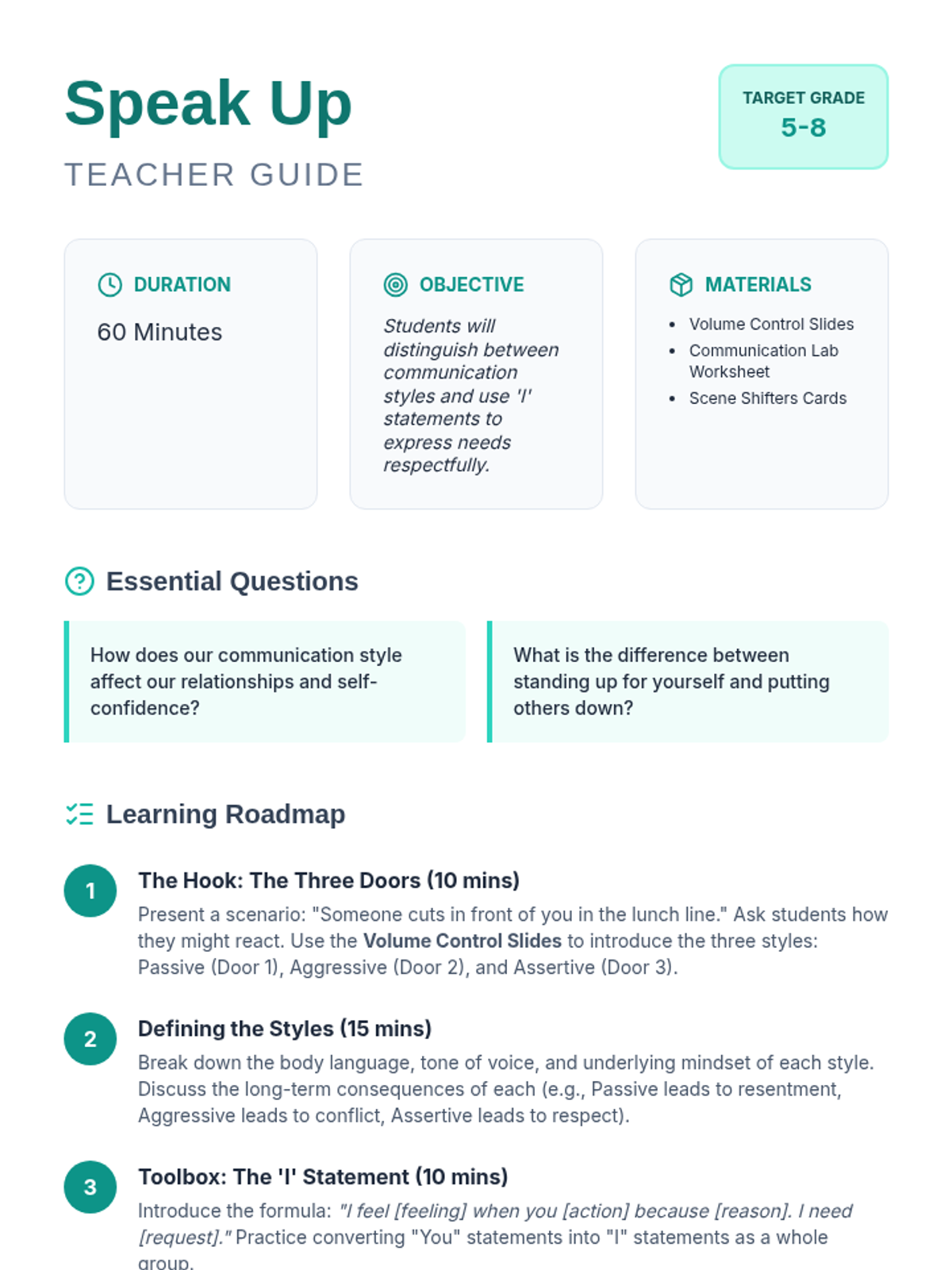 This lesson empowers middle school students to communicate effectively by distinguishing between passive, aggressive, and assertive styles. Students learn to use 'I' statements and practice conflict resolution through interactive role-playing and guided reflection.