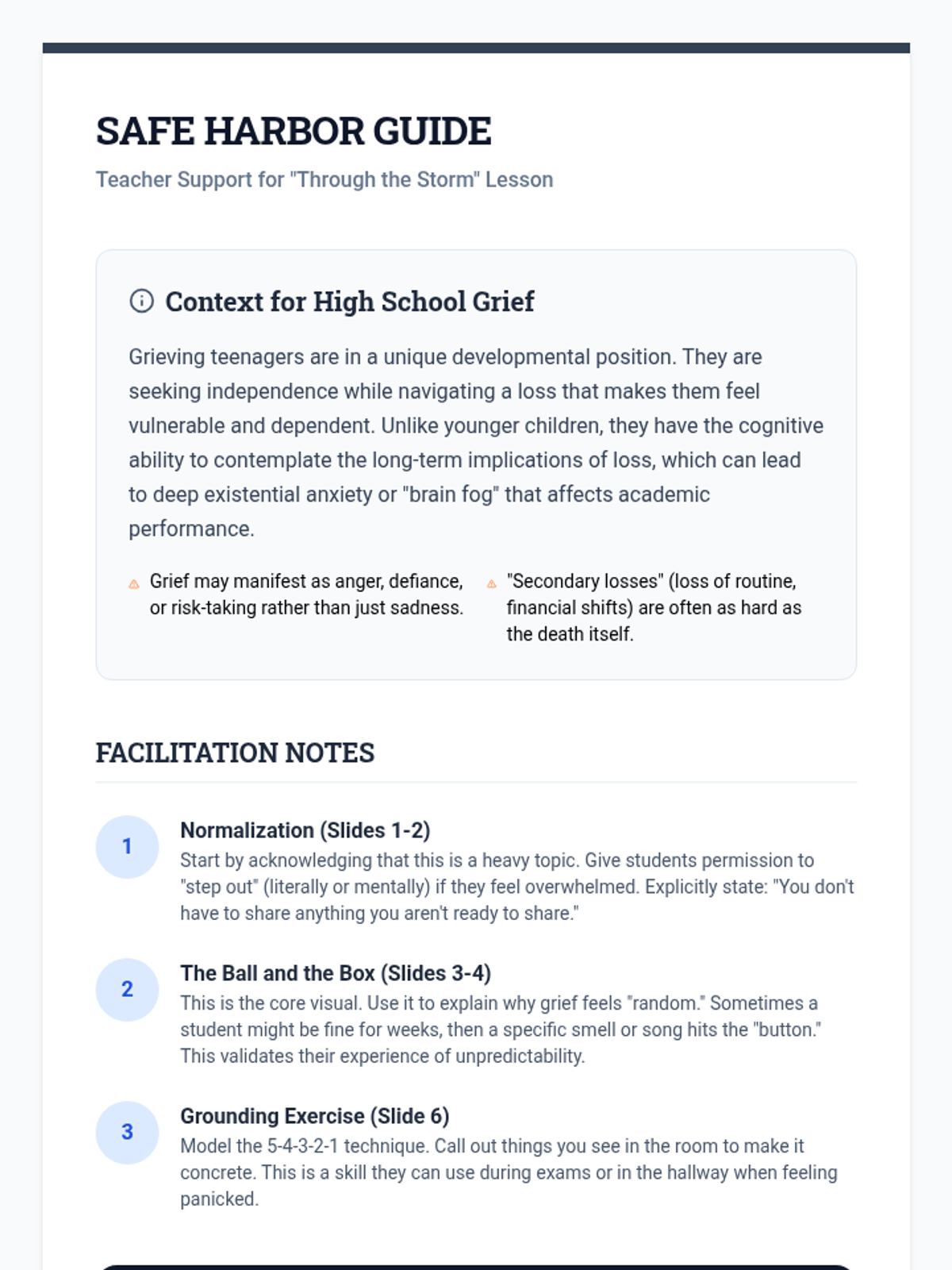 A comprehensive lesson designed for high schoolers to understand the grieving process after the loss of a family member, featuring the 'Ball in the Box' theory and practical coping strategies.