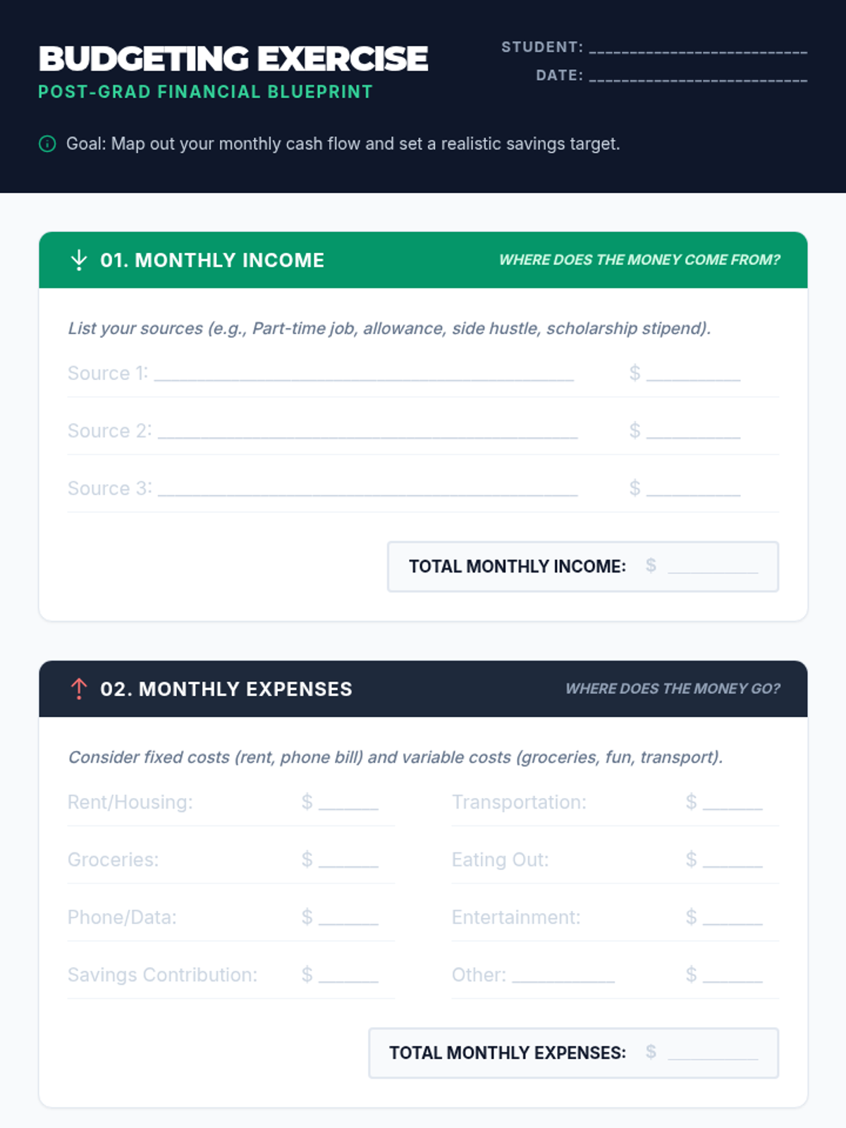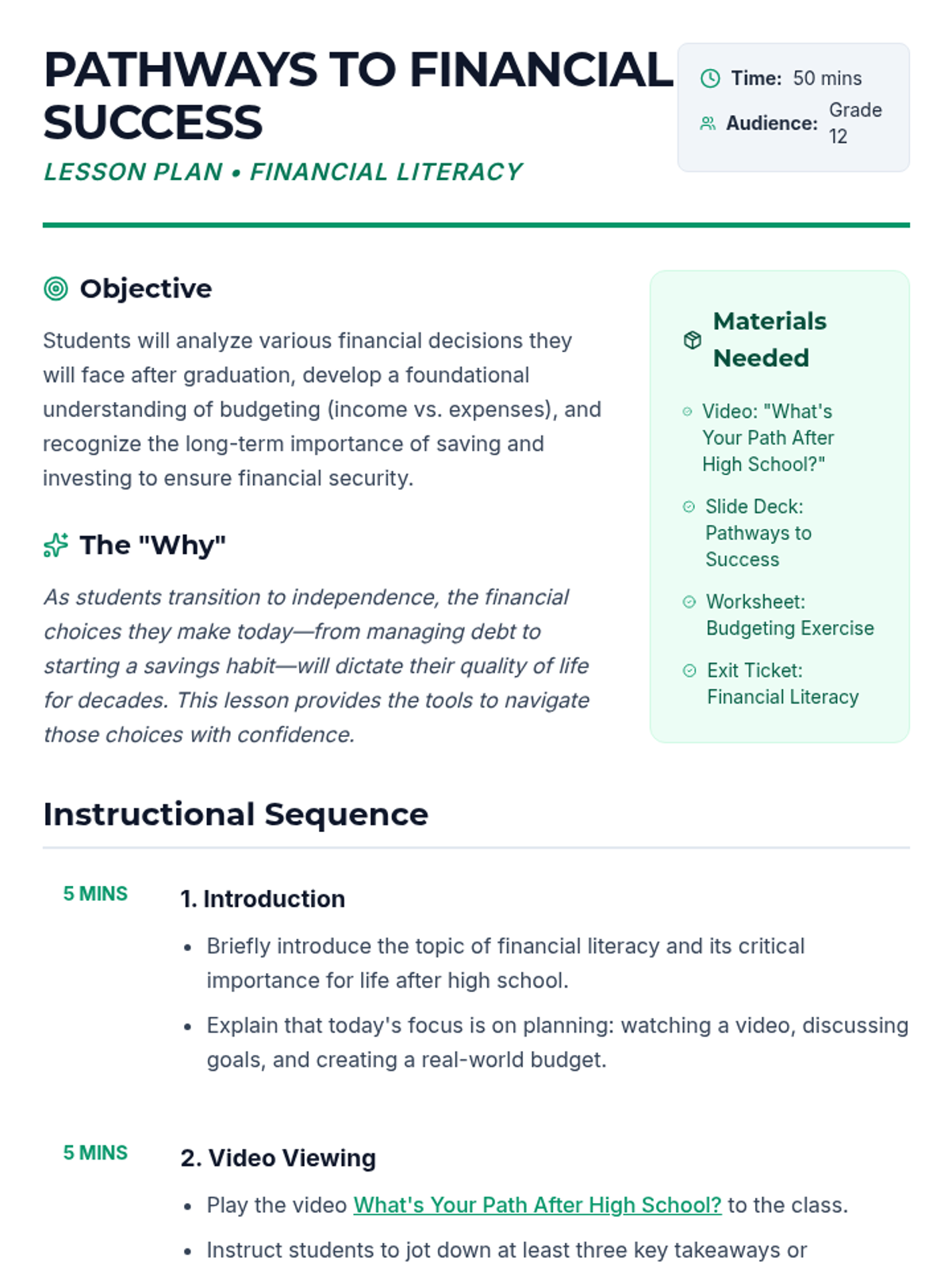 This lesson guides Grade 12 students through critical financial decisions post-graduation, covering budgeting, saving, and investing through a video-led discussion and hands-on budgeting exercise.