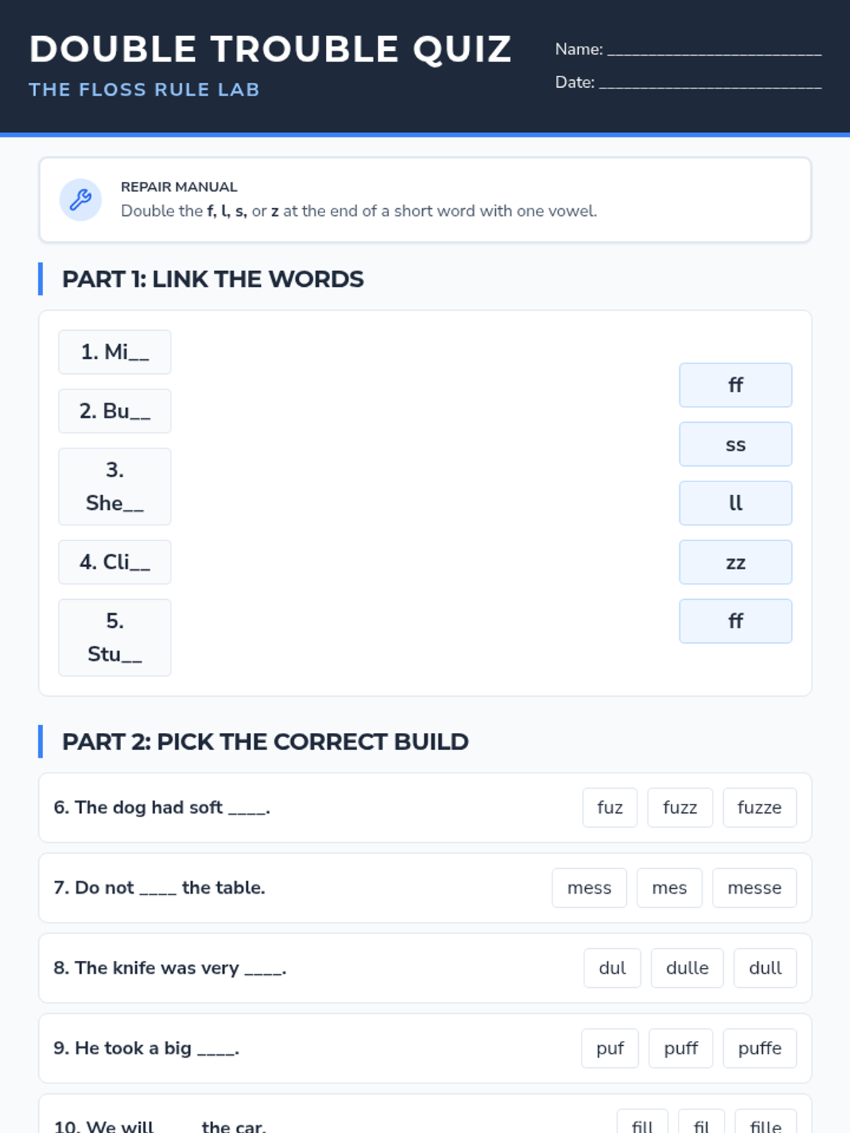 A focused lesson on the FLOSS spelling rule (doubling f, l, s, and z after a short vowel), designed for middle schoolers reading at a primary level.