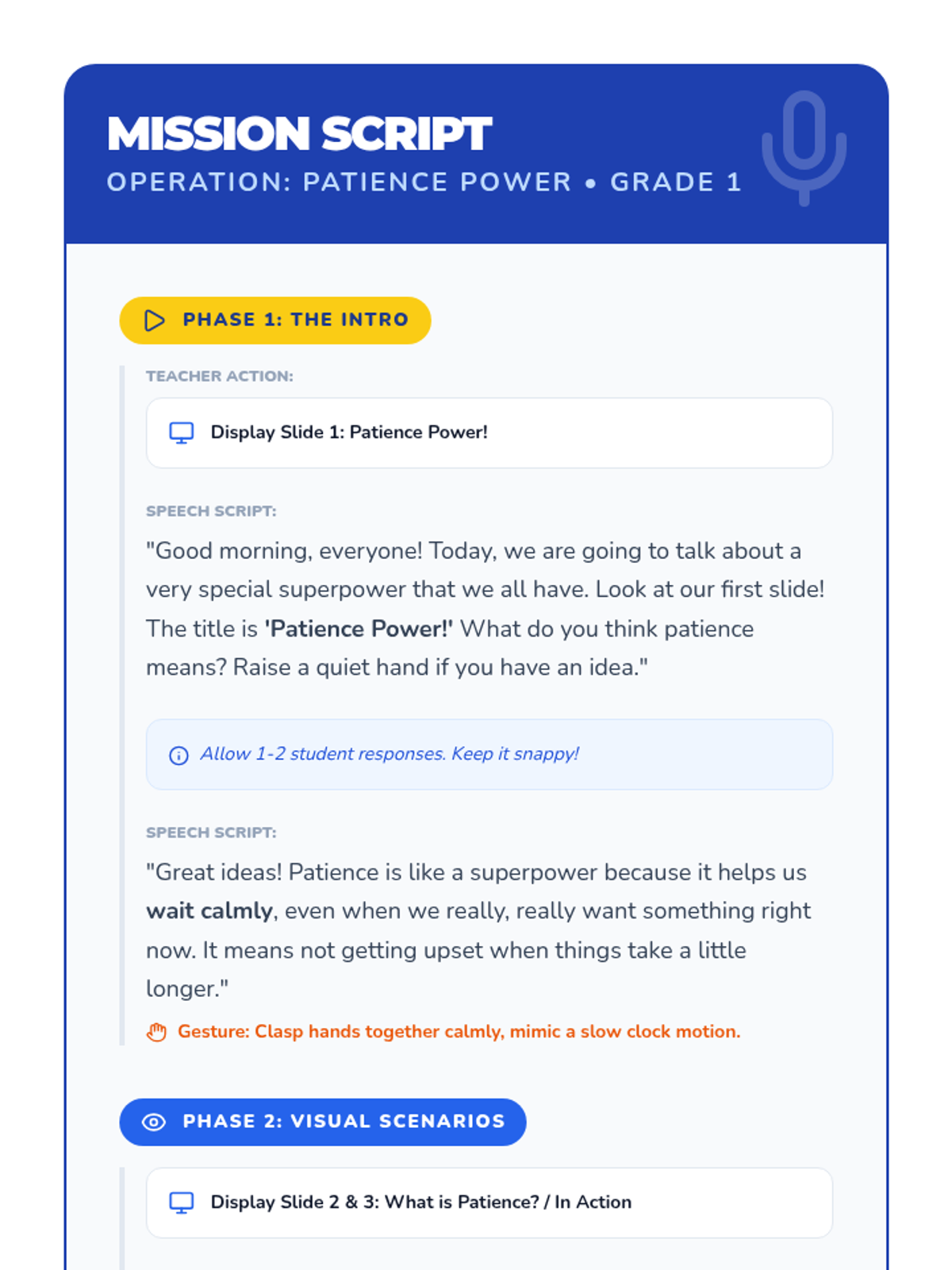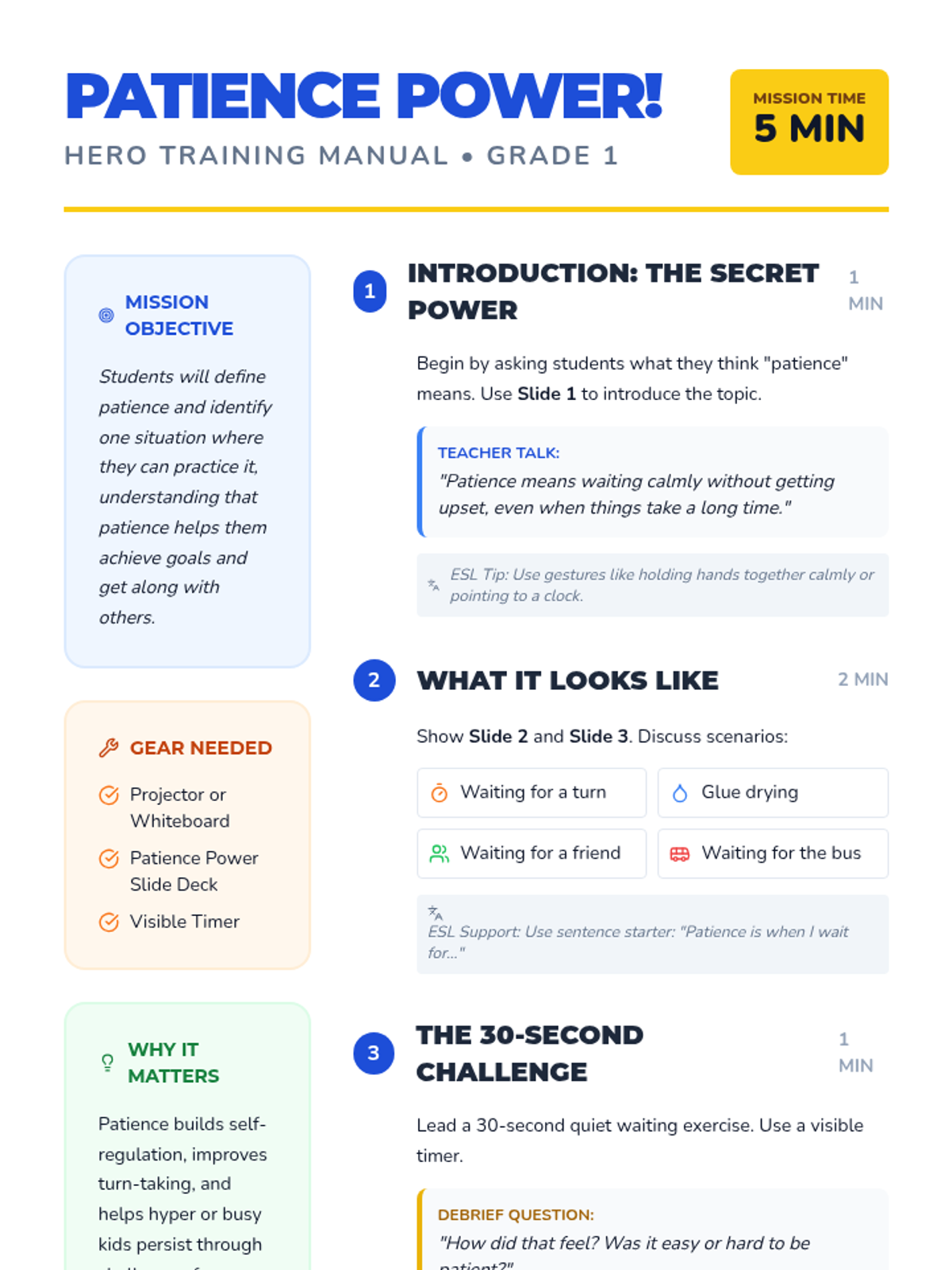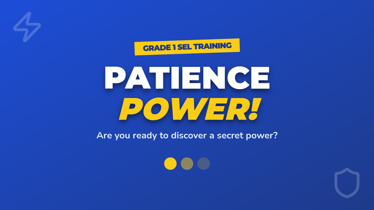 A high-energy, 5-minute lesson for 1st graders introducing the 'superpower' of patience through visual prompts and a 30-second calm-down challenge.