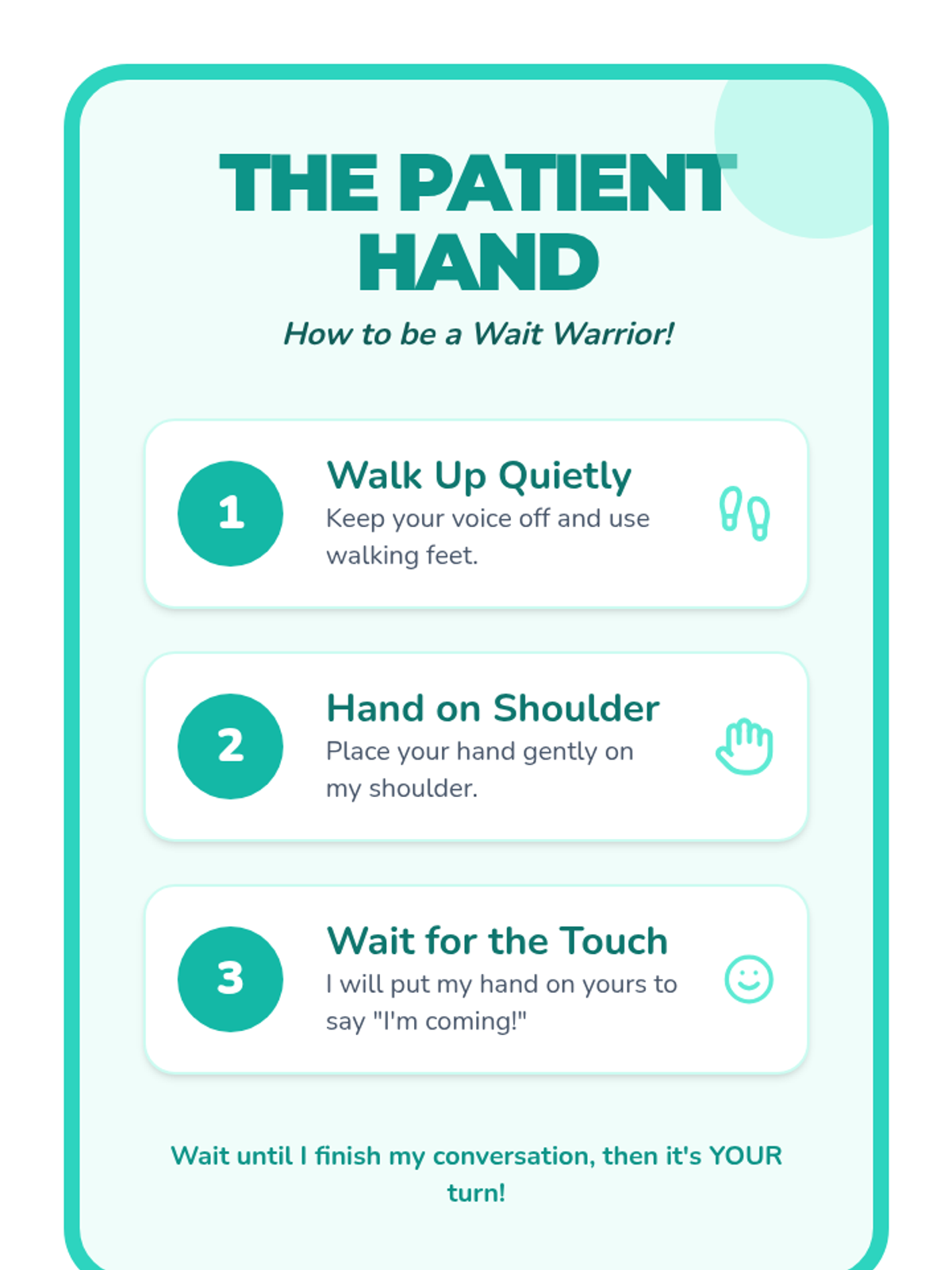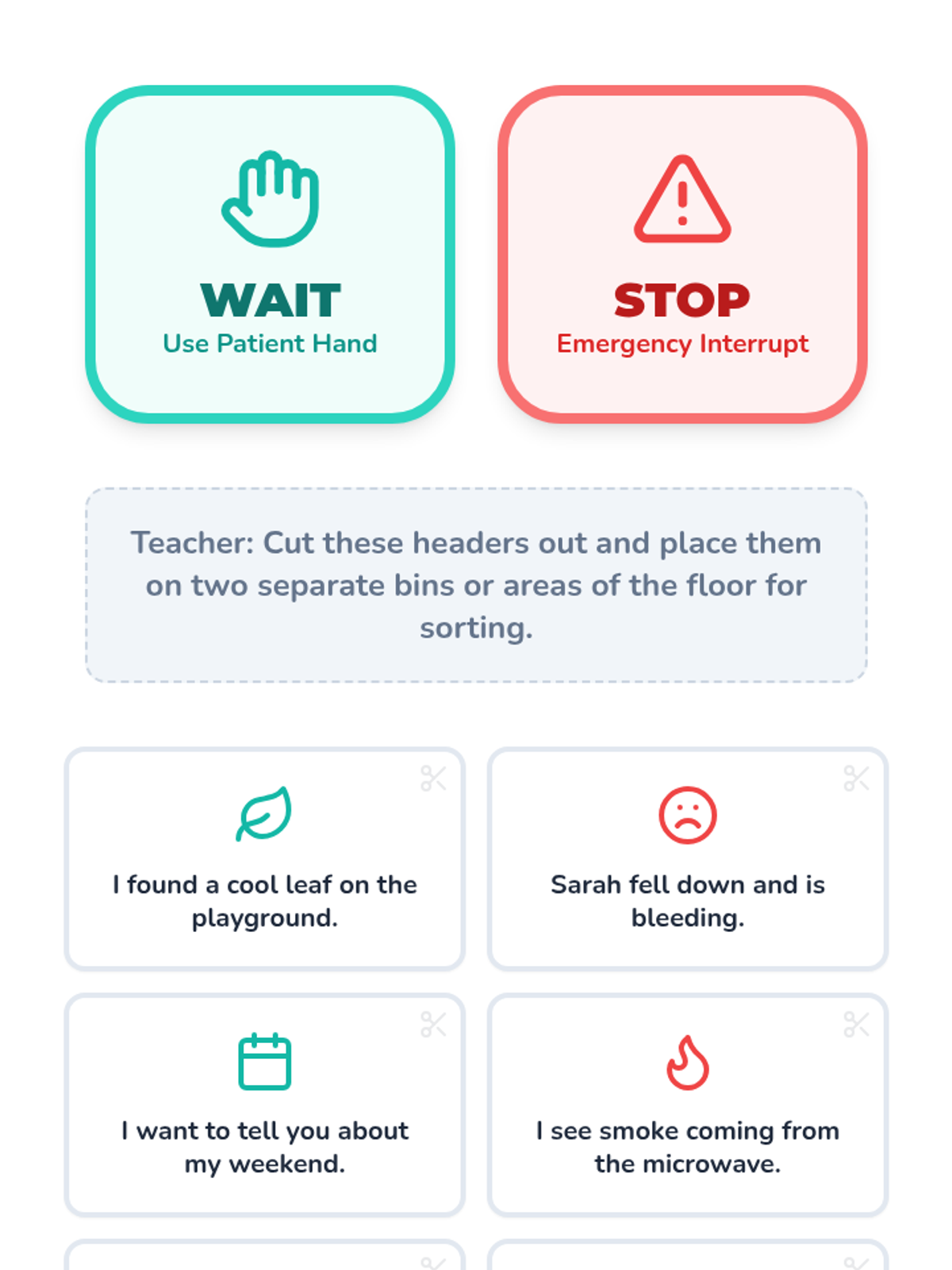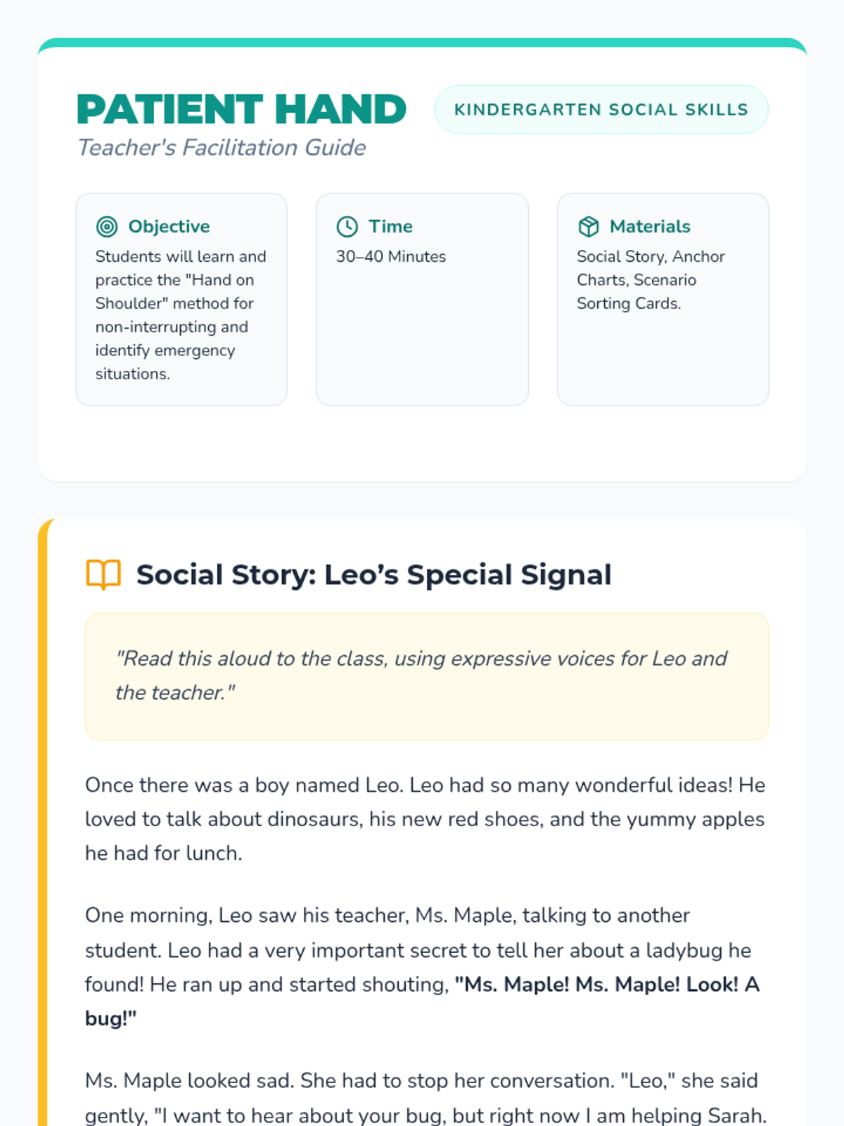 A Kindergarten lesson focused on teaching students the 'Hand on Shoulder' technique for non-disruptive communication and distinguishing between emergency and non-emergency interruptions.