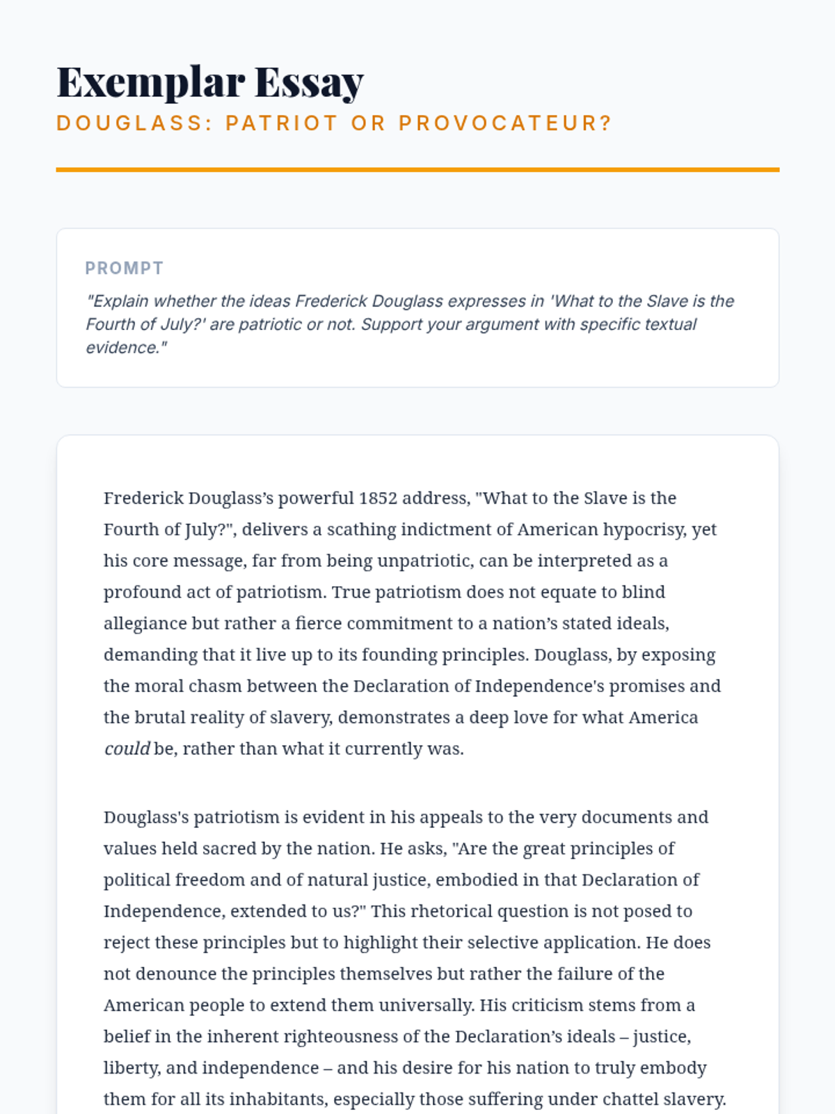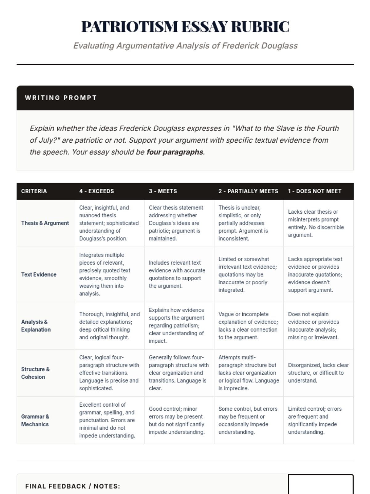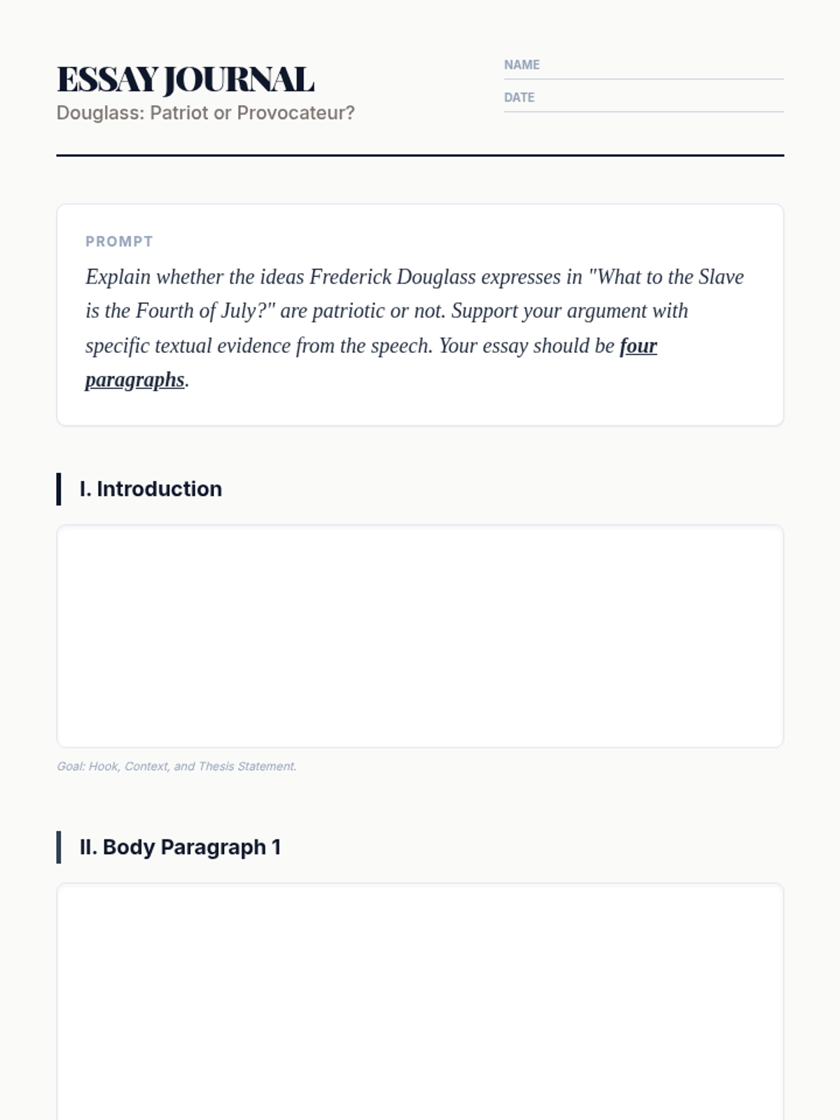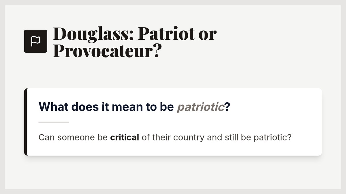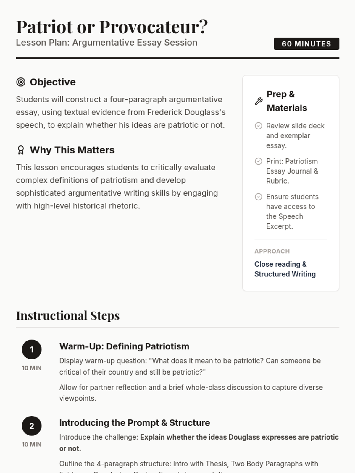 A 60-minute session where students evaluate Frederick Douglass's critique of America through the lens of patriotism. Students gather evidence and write a four-paragraph argumentative essay defining his stance.