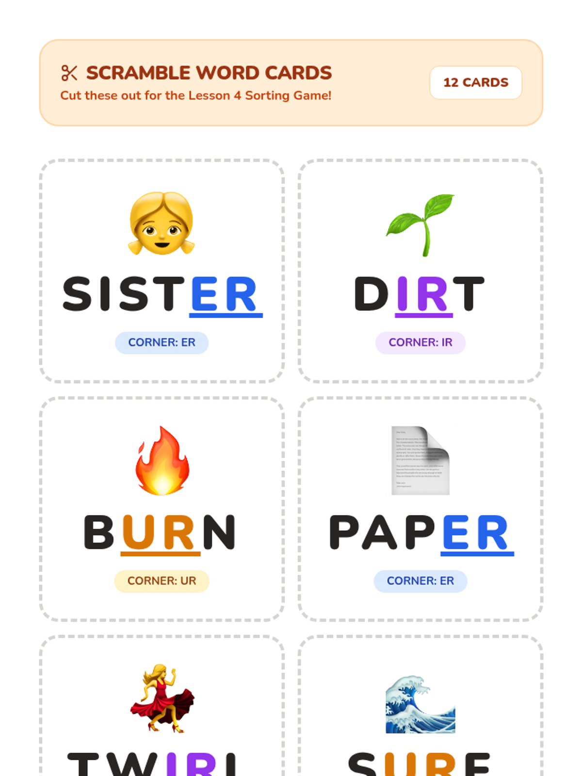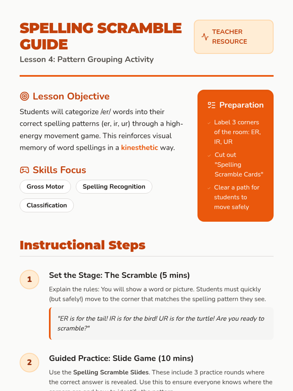 A high-energy sorting lesson where students move physically to identify the correct spelling pattern for different /er/ words.