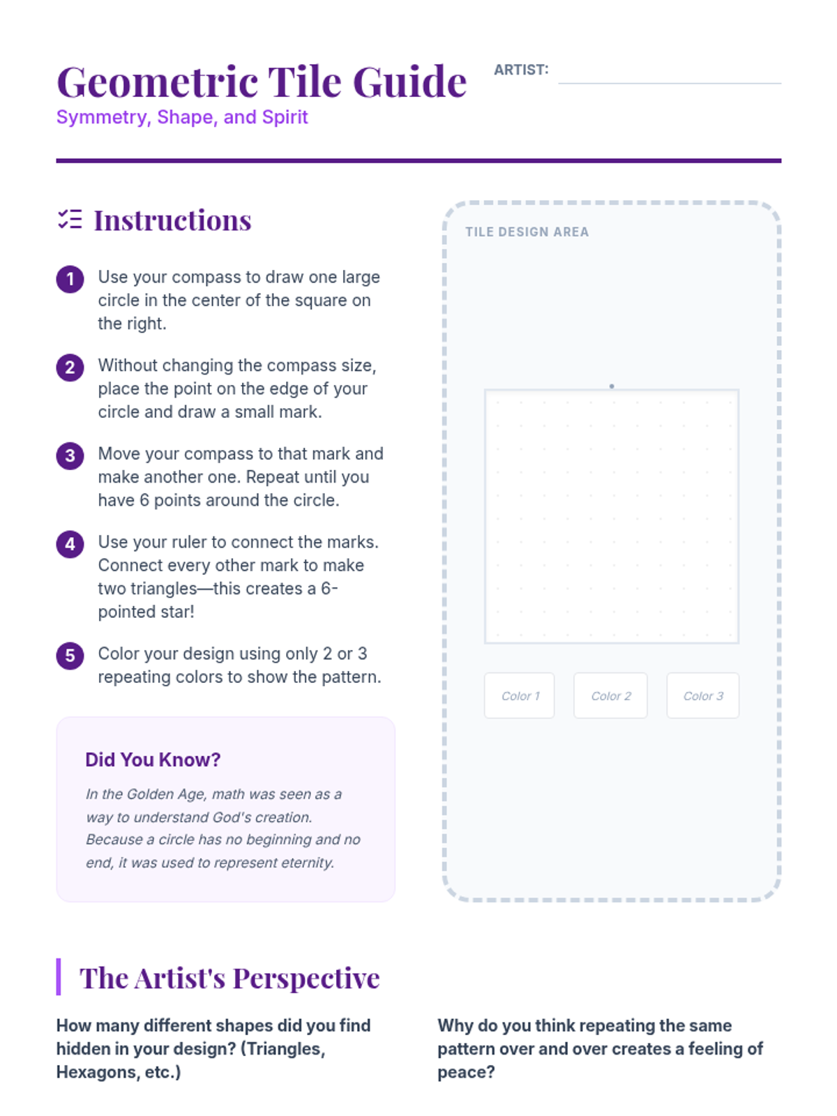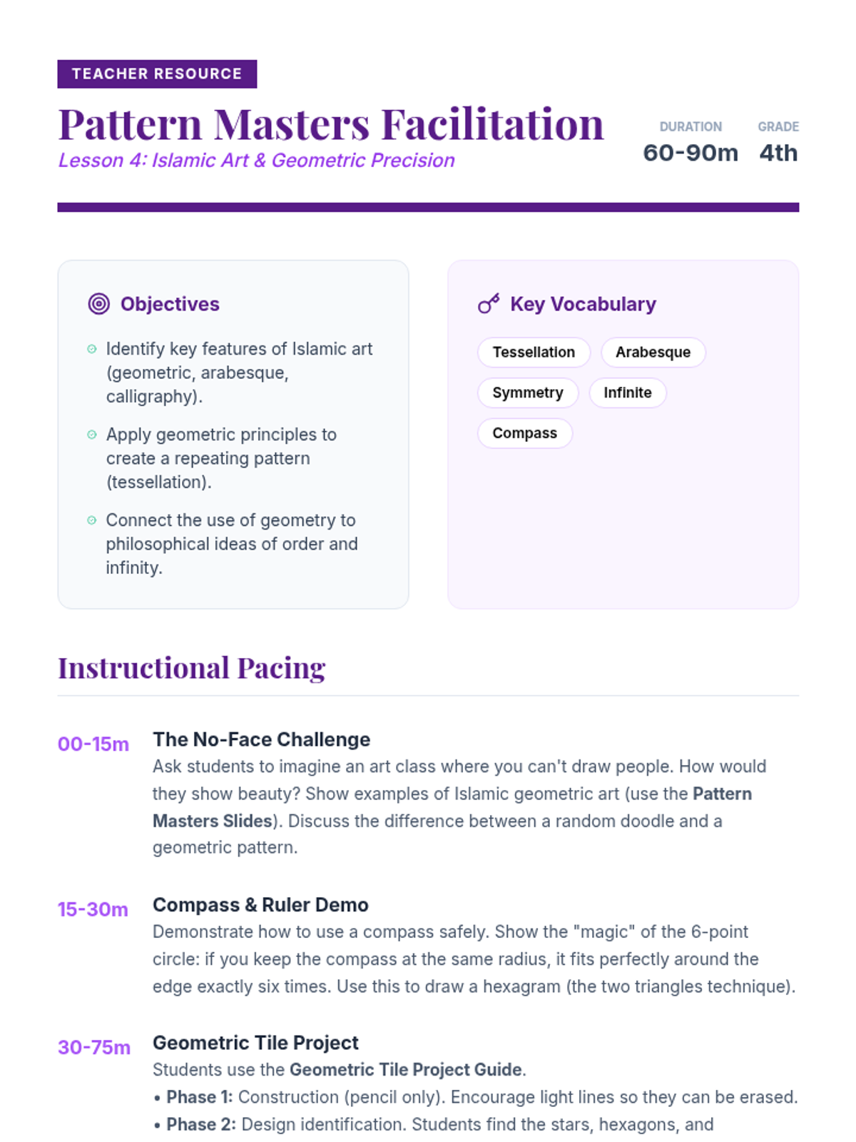 Explores the intersection of math and art through Islamic geometric patterns, tessellations, and arabesques.