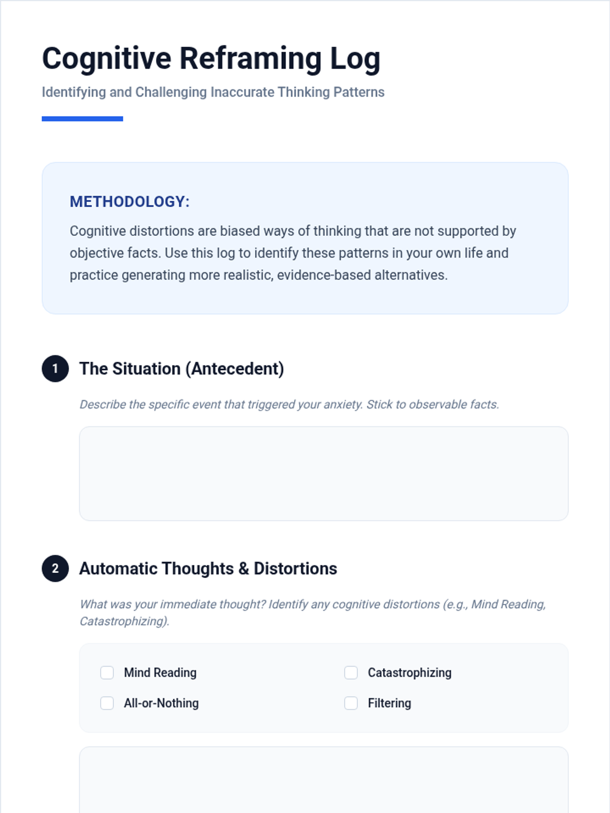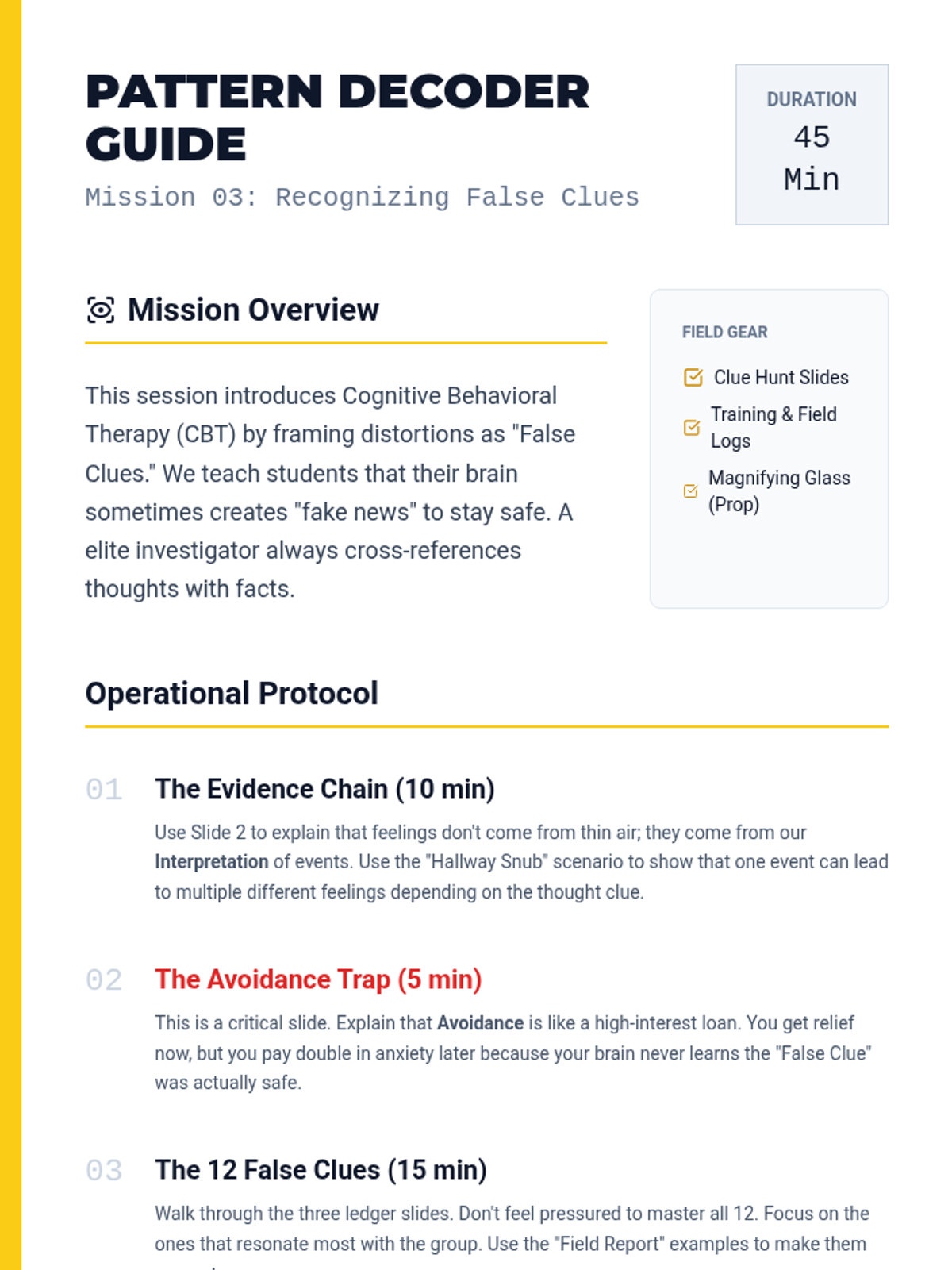 Uncover "False Clues" (cognitive distortions) and learn to recognize patterns in anxious thinking.