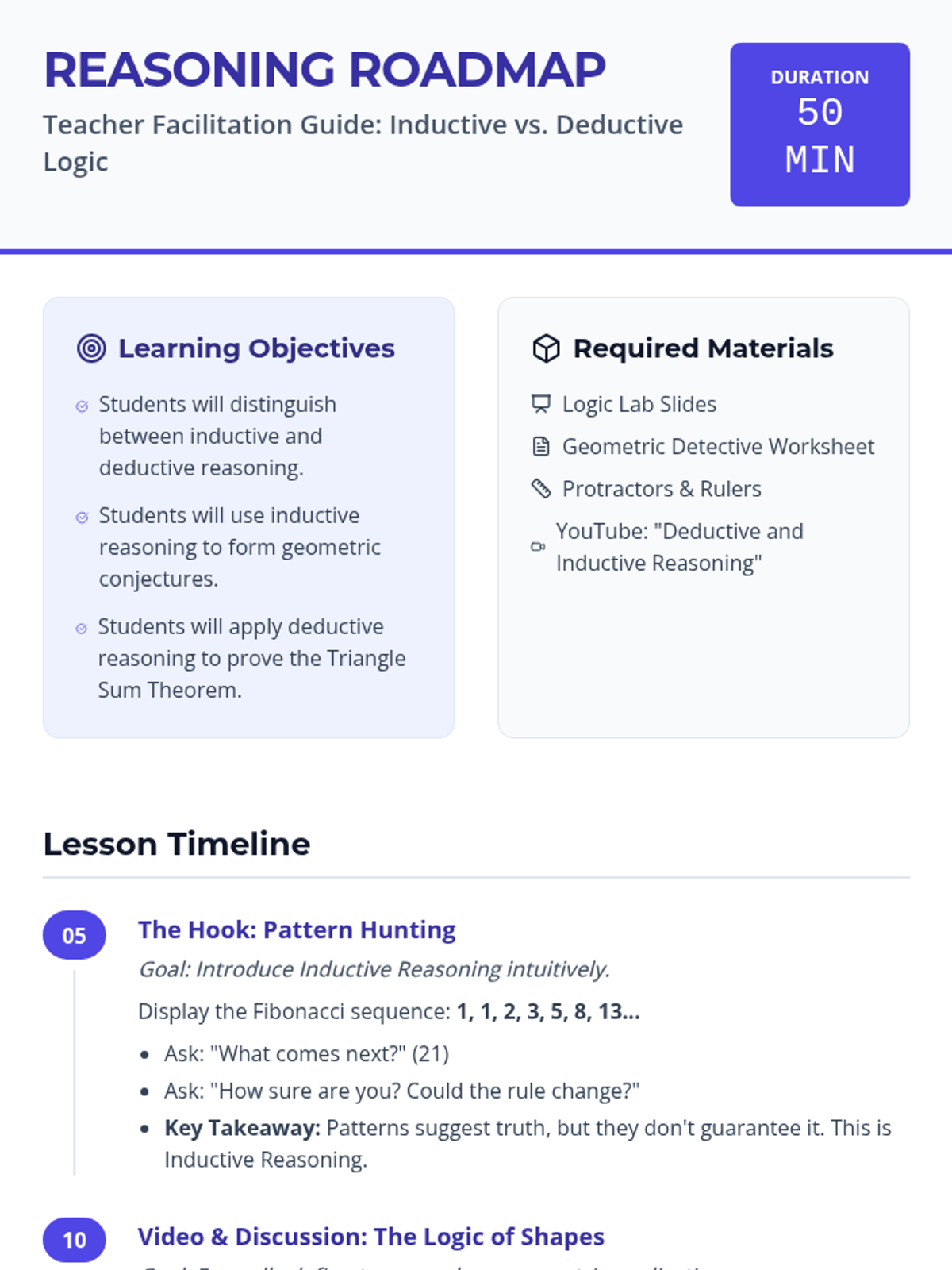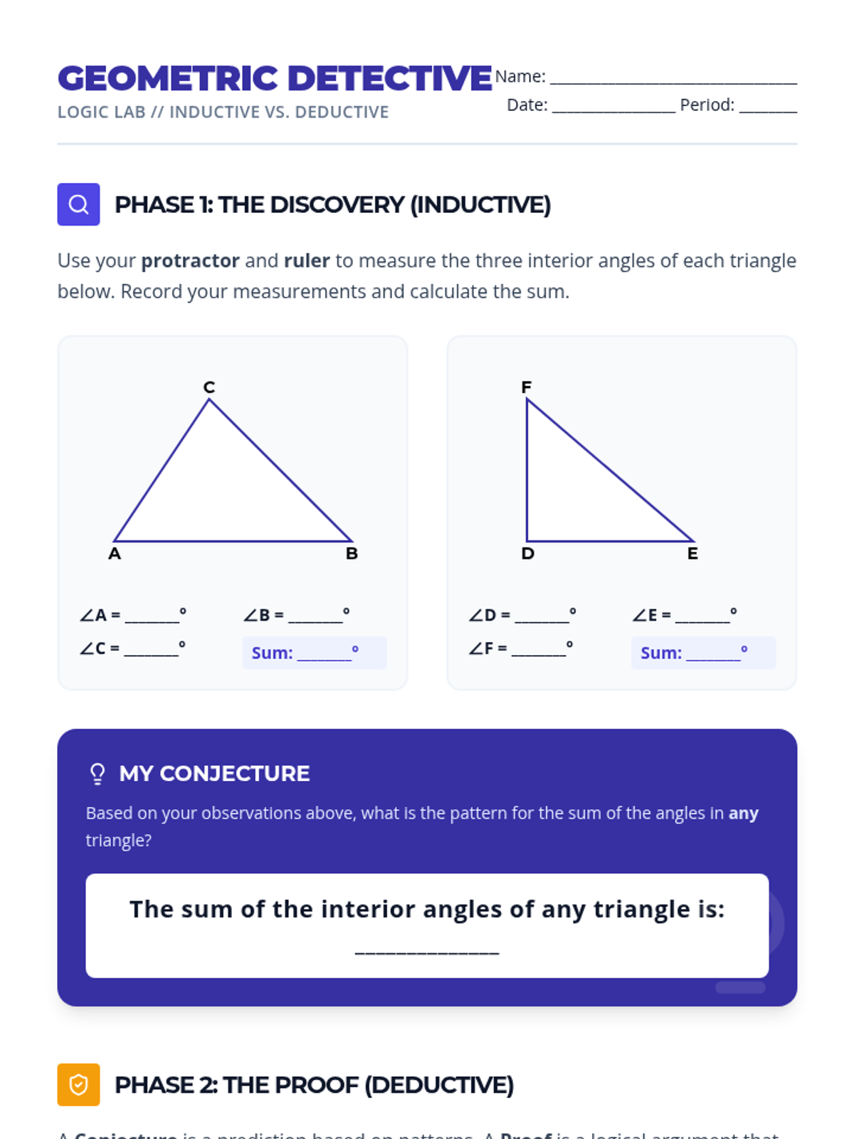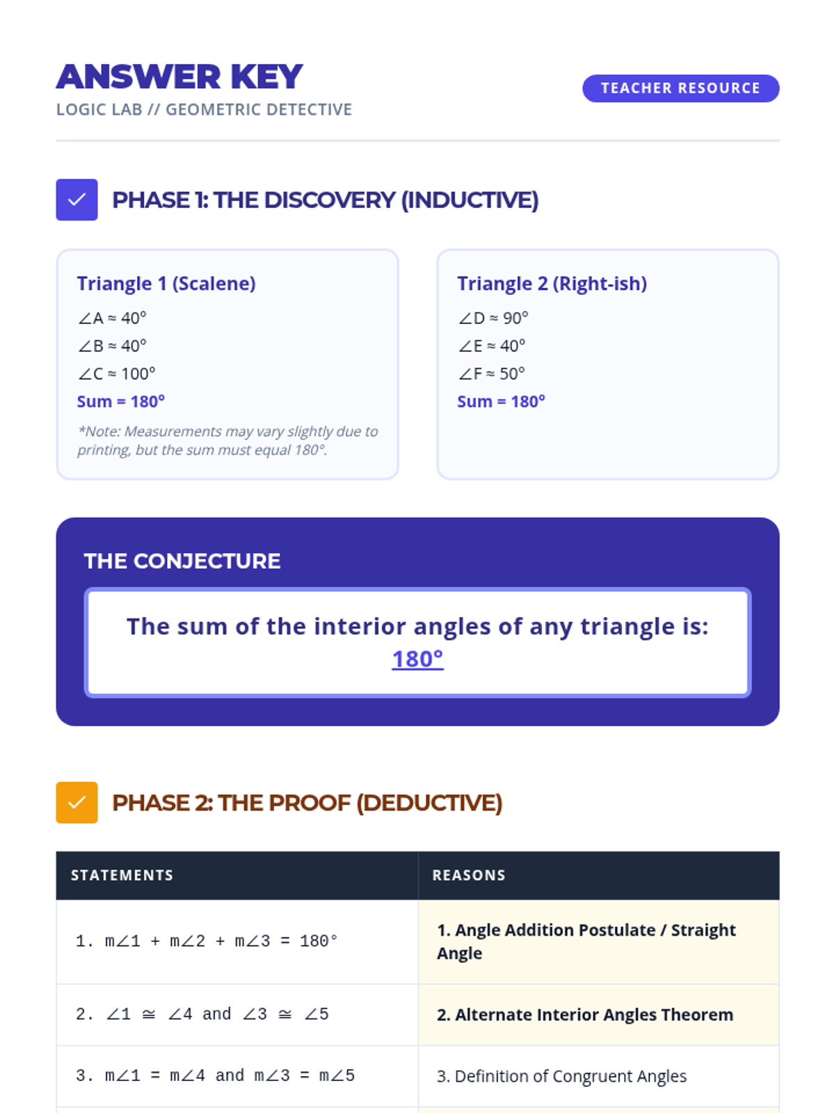 A lesson exploring the differences between inductive reasoning (pattern-finding) and deductive reasoning (fact-based logic) within a geometric context. Students will transition from measuring triangle angles to proving the Triangle Sum Theorem.