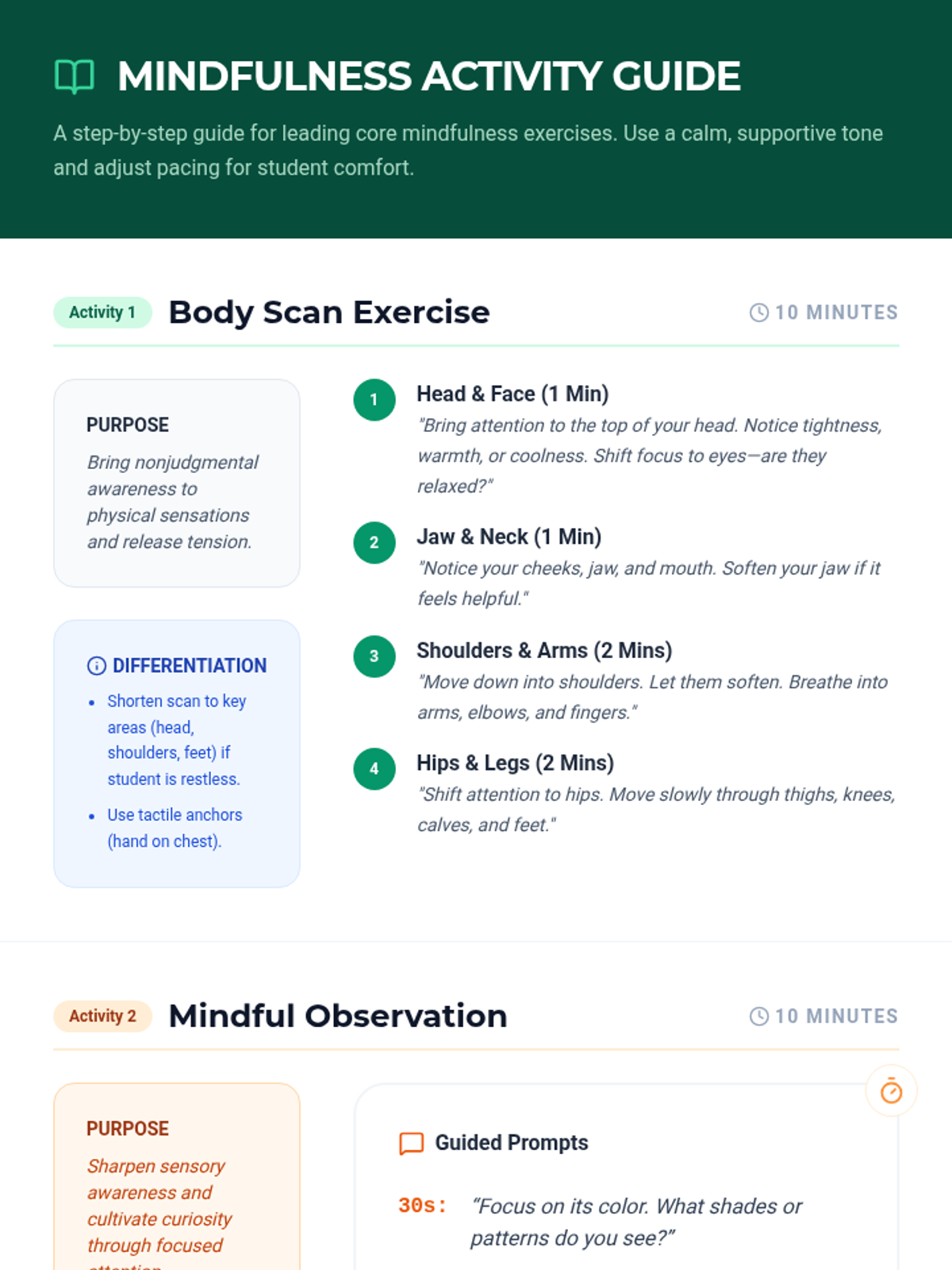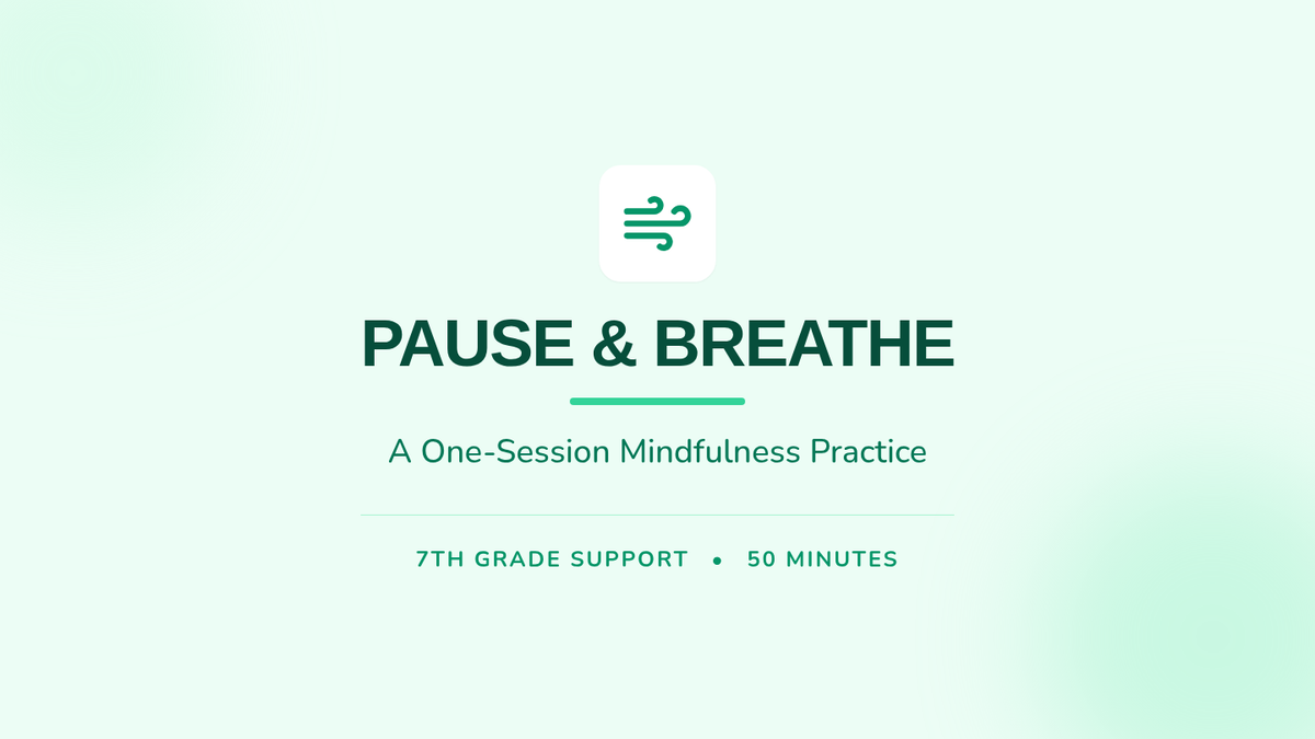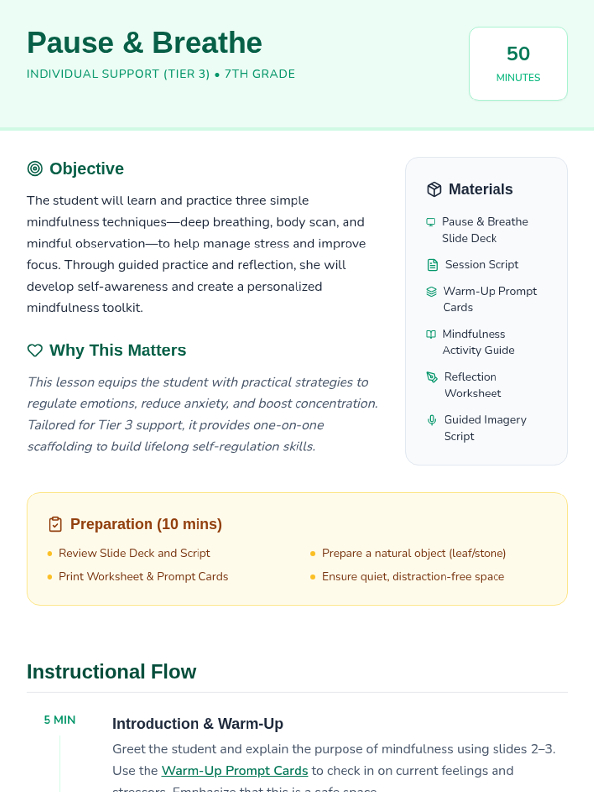 A focused, one-session mindfulness lesson designed for a 7th grade student receiving individual support. The student learns deep breathing, body scan, and mindful observation techniques to manage stress and boost focus.