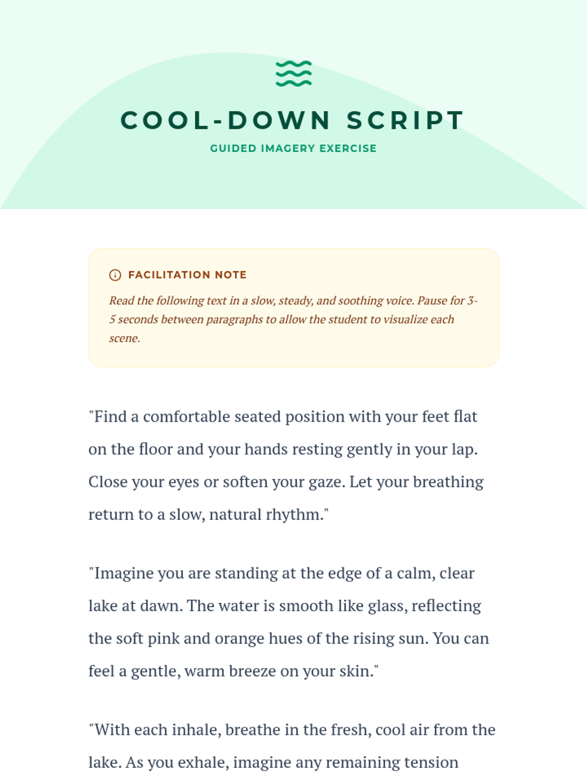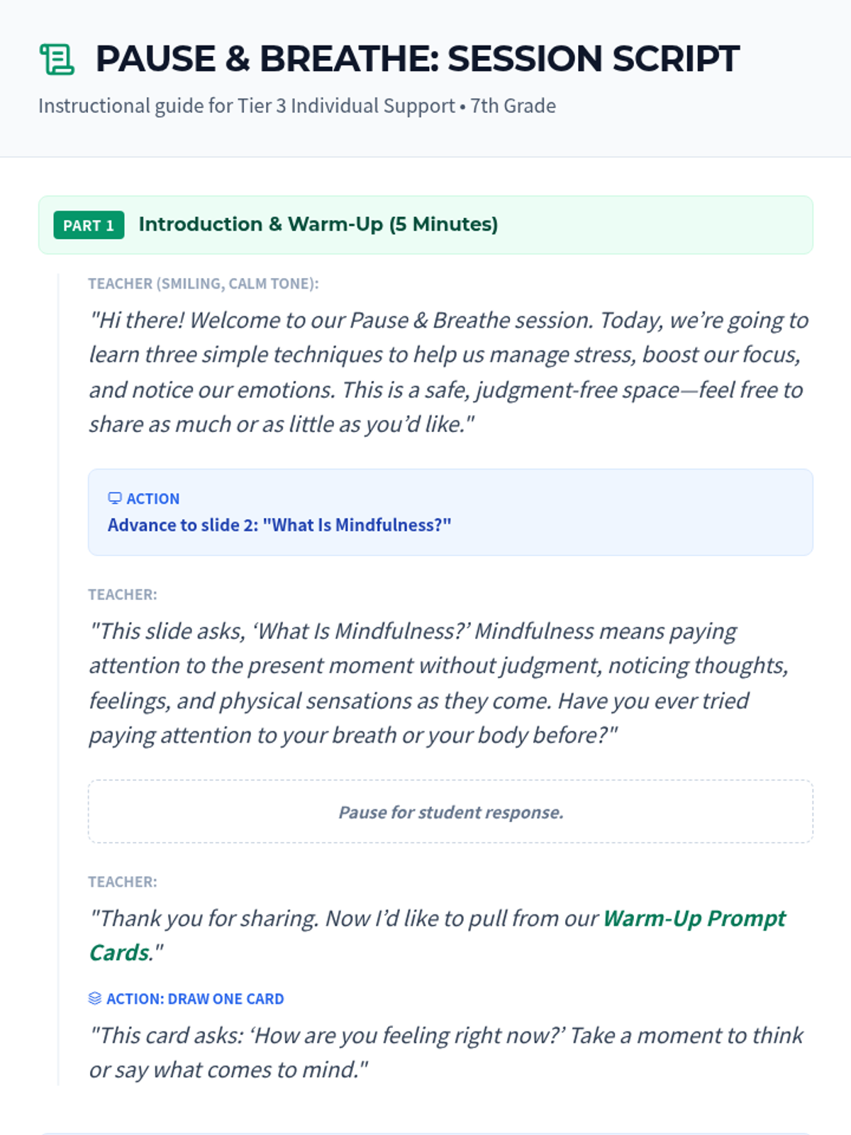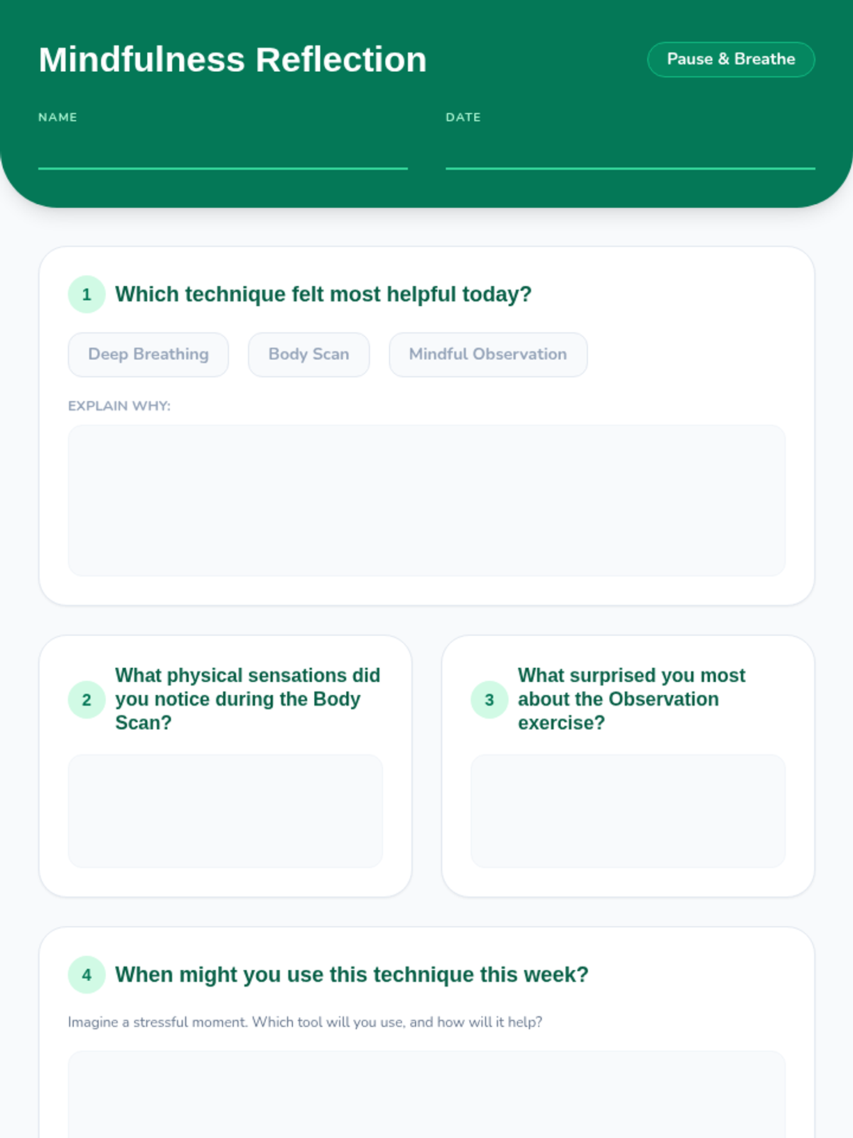 A focused, one-session mindfulness lesson designed for a 7th grade student receiving individual support. The student learns deep breathing, body scan, and mindful observation techniques to manage stress and boost focus.