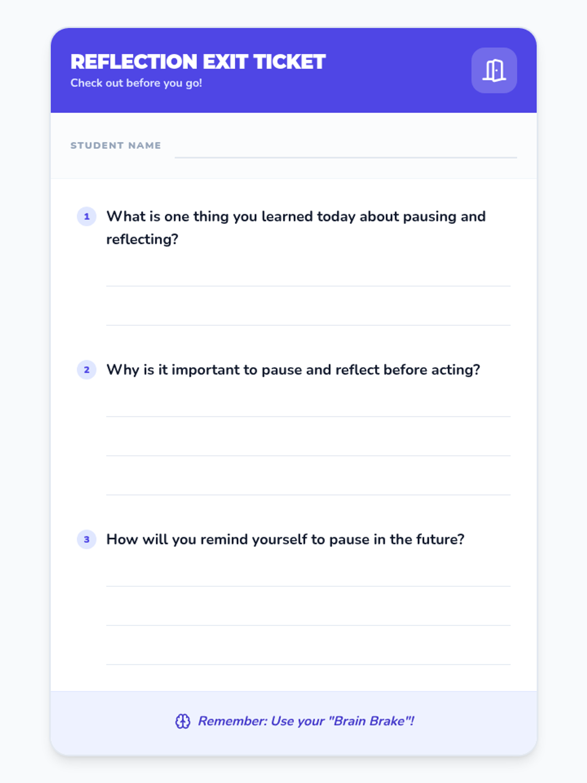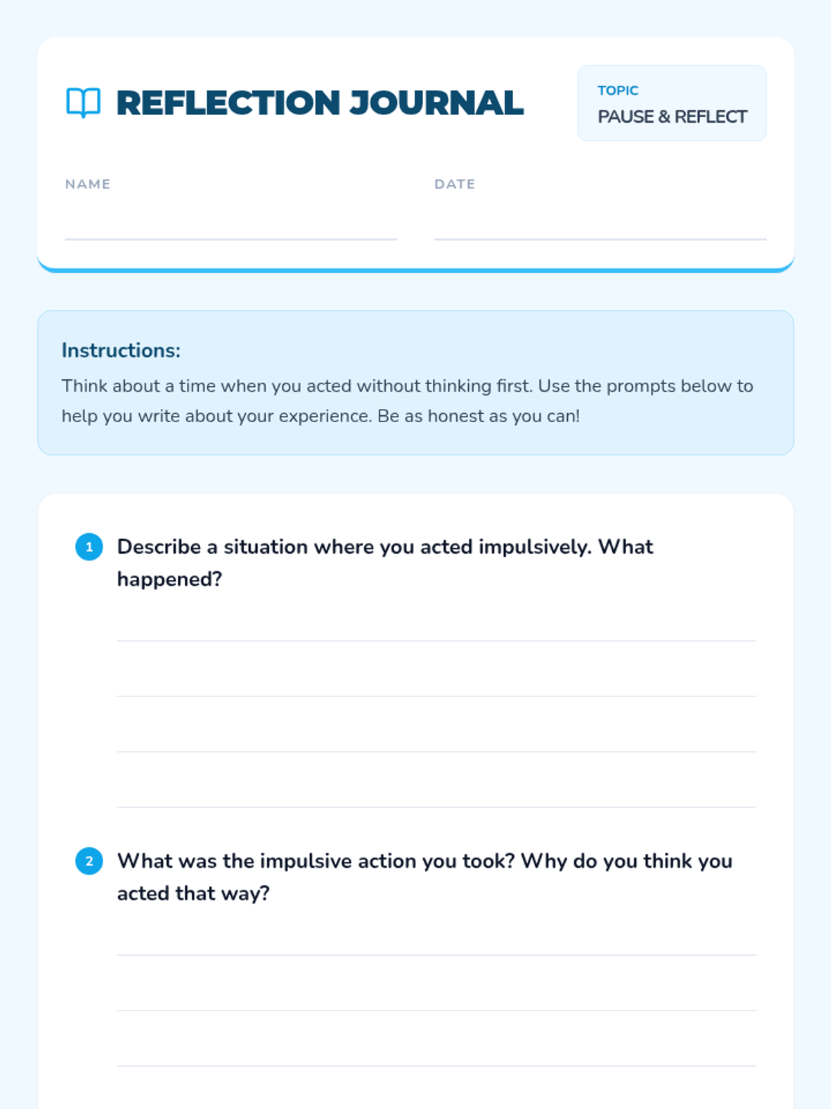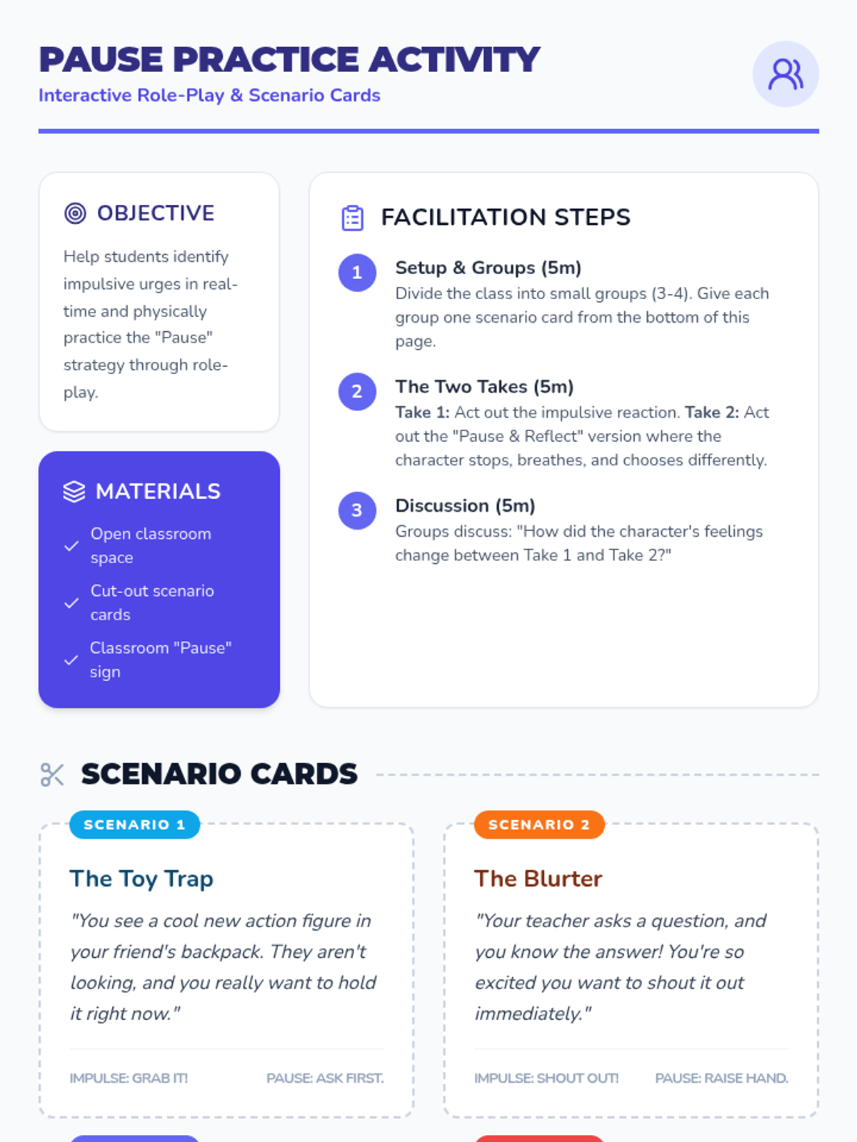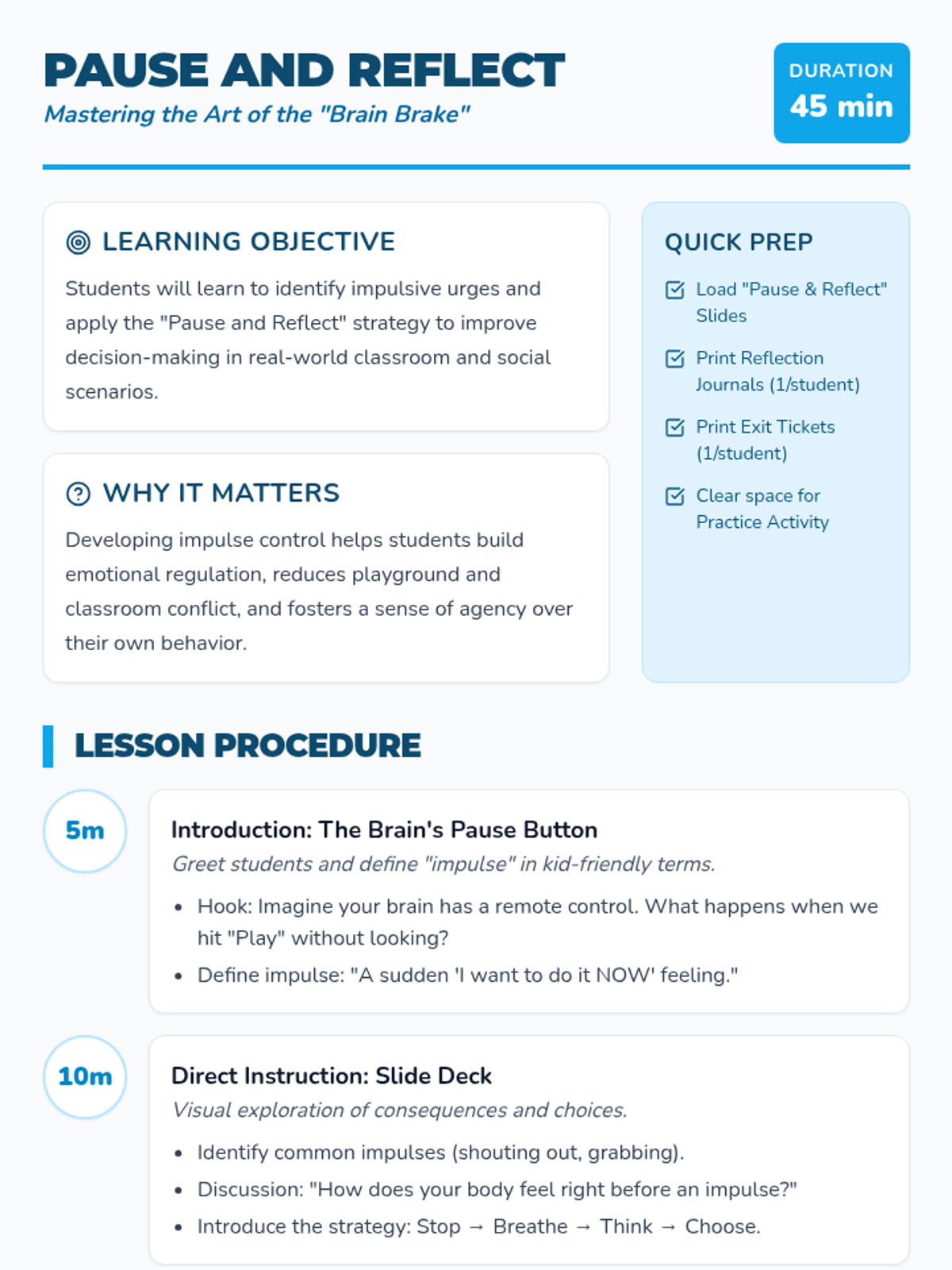 A 45-minute social-emotional learning lesson for 2nd graders focused on developing impulse control through the 'Pause and Reflect' strategy. students will engage in role-playing, journaling, and group discussion to learn how to stop and think before acting.