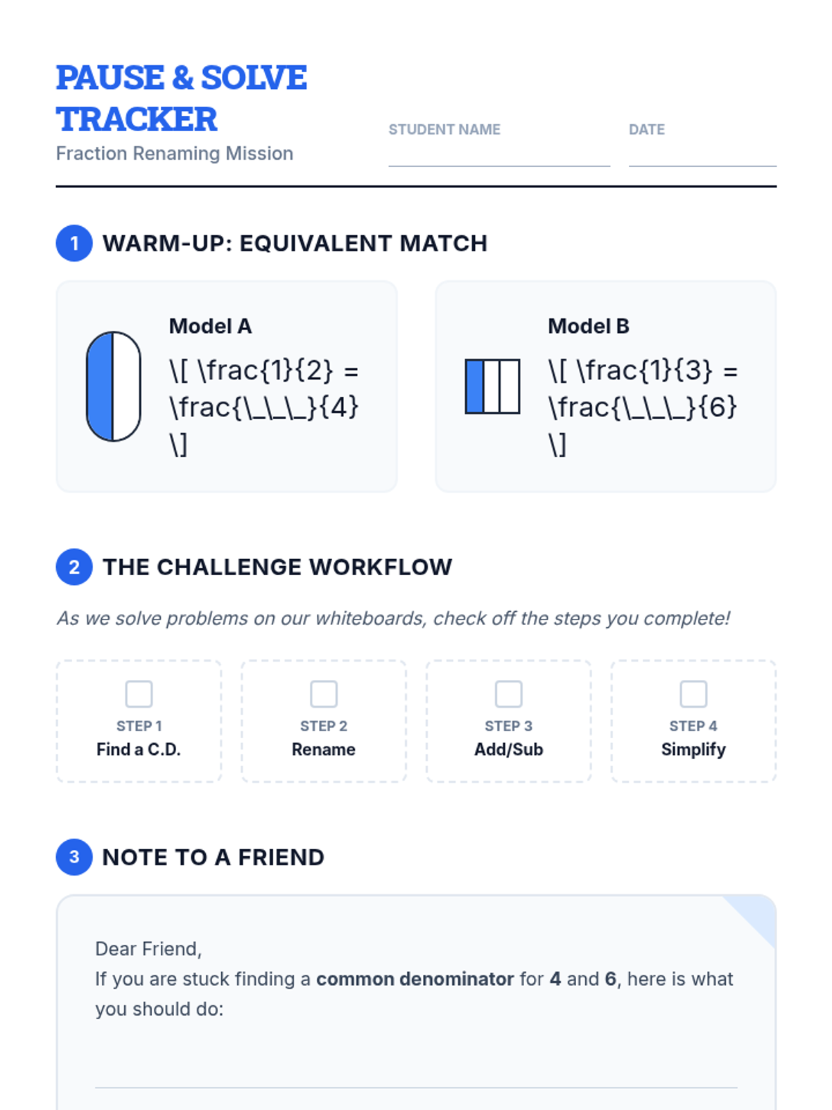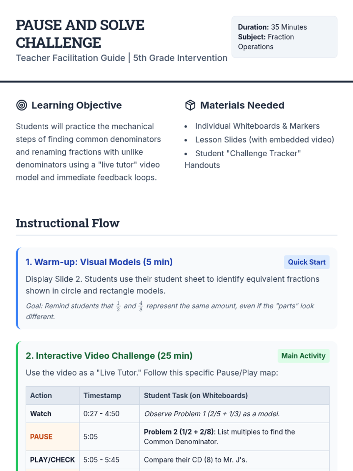 An interactive intervention lesson where students use a video as a 'live tutor' to master renaming fractions with unlike denominators through a pause-and-solve challenge.