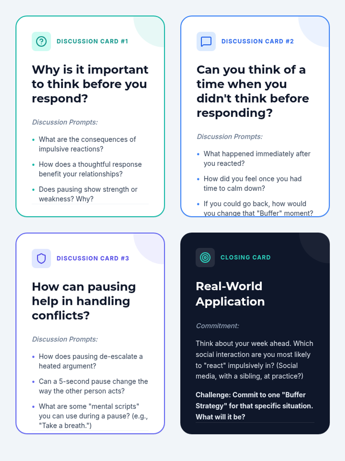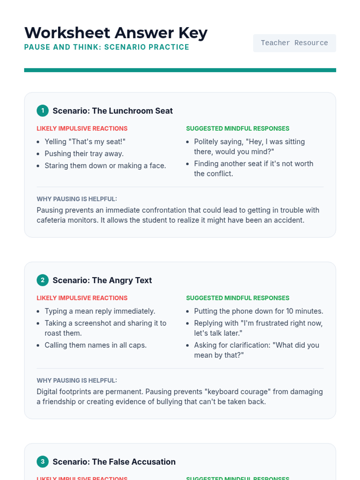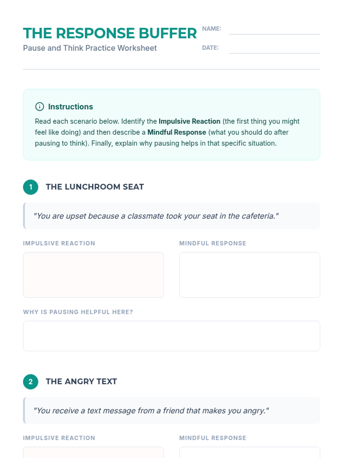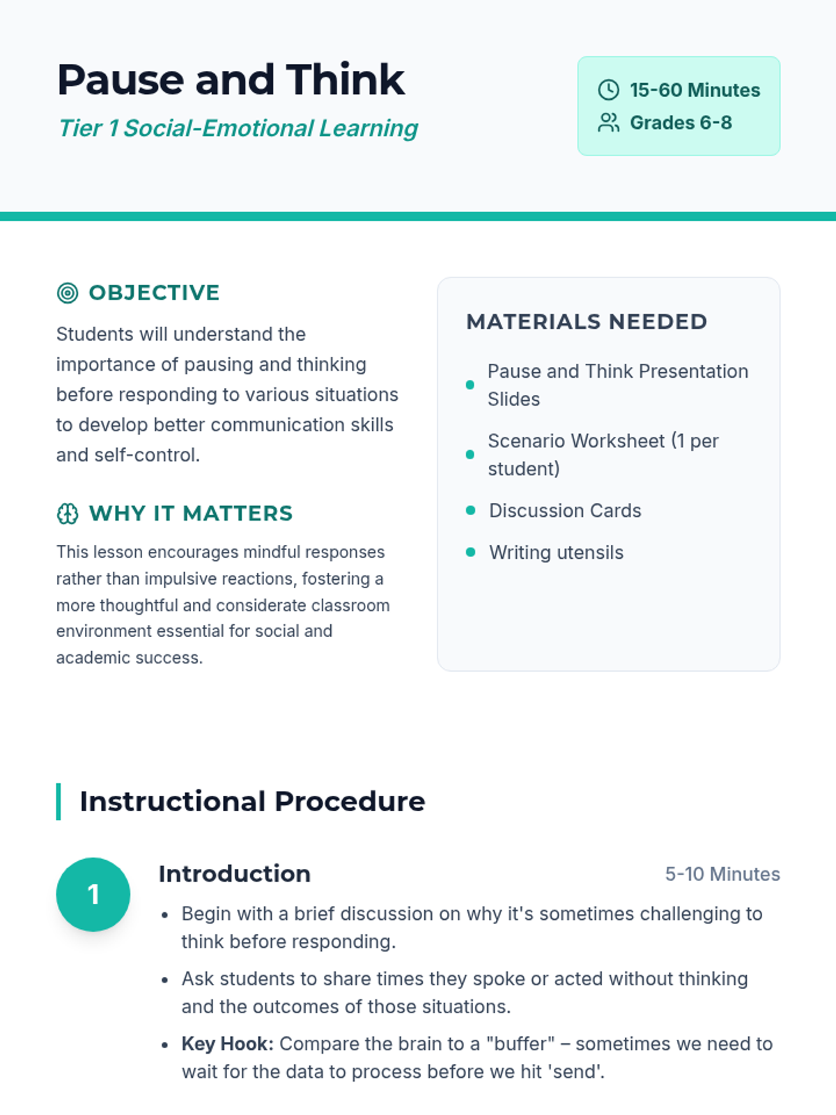 A lesson designed for 6th-8th graders to develop self-control and communication skills by learning to pause and think before reacting to social or emotional triggers.