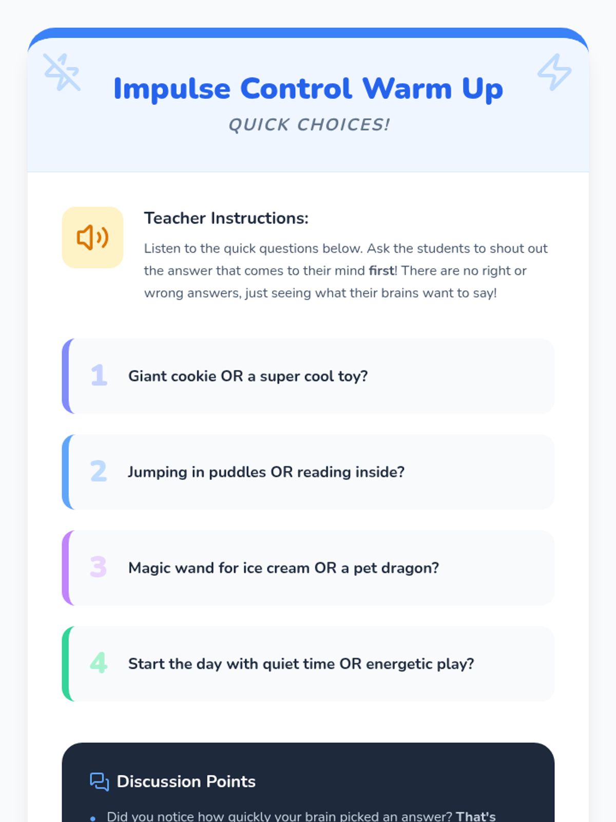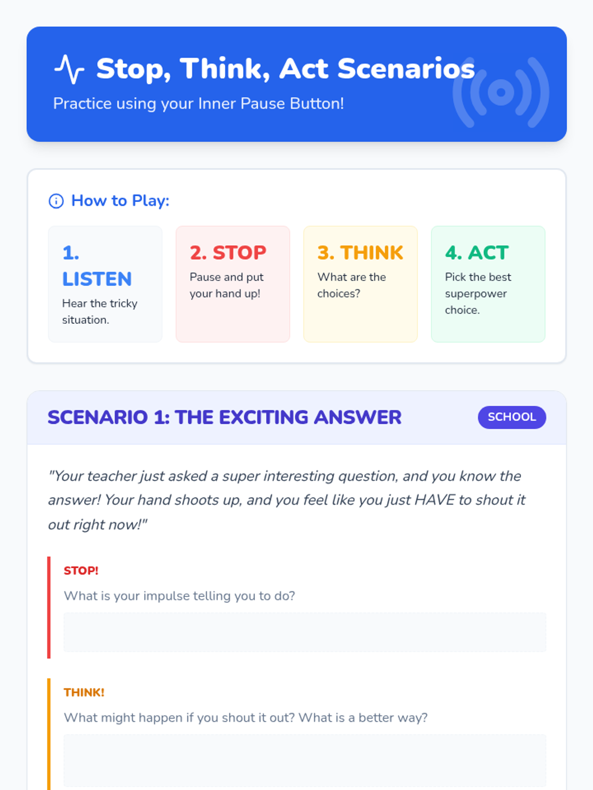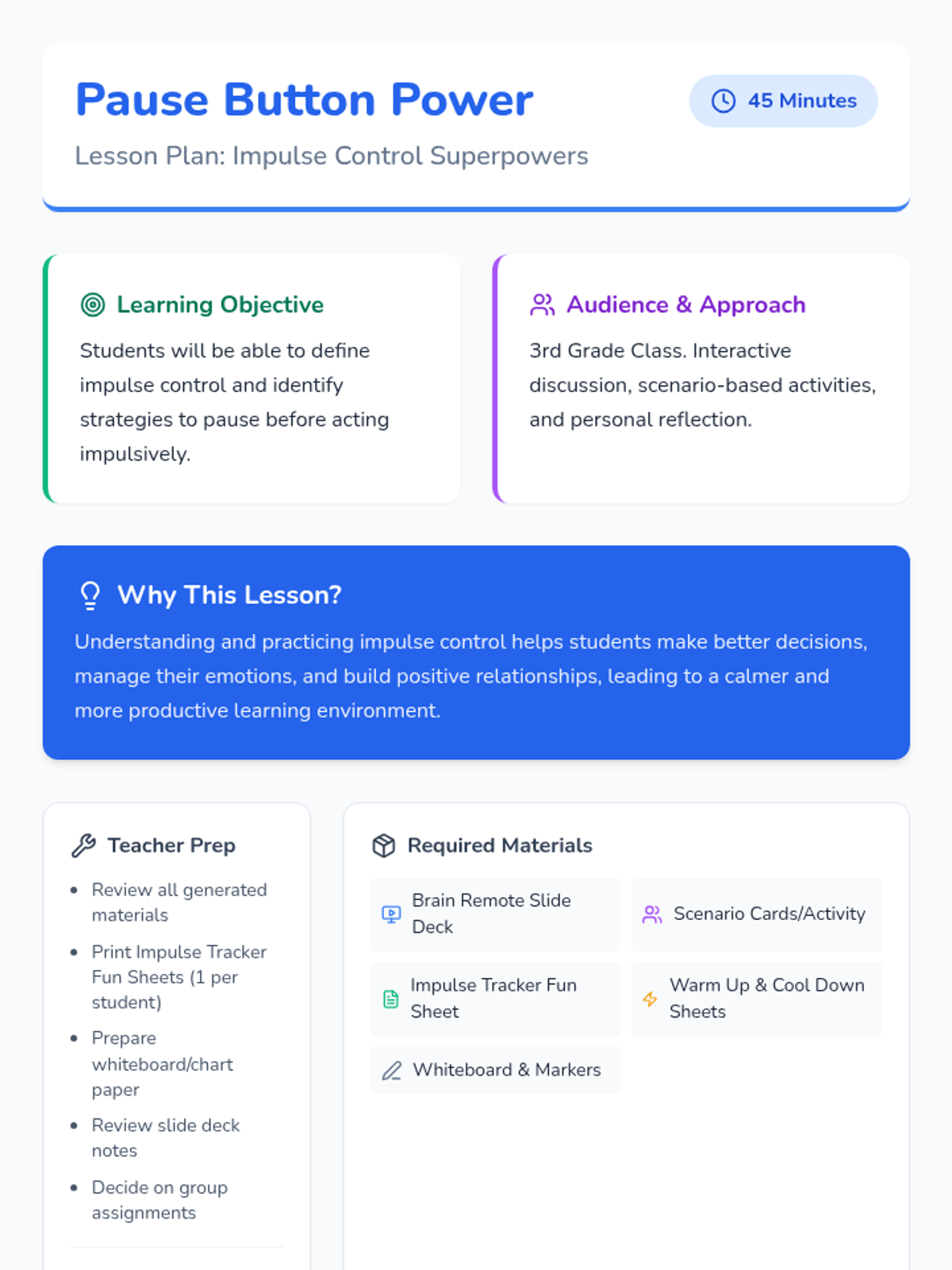 This lesson helps 3rd-grade students understand impulse control through the metaphor of a 'brain remote control,' teaching them to STOP, THINK, and ACT before making choices.