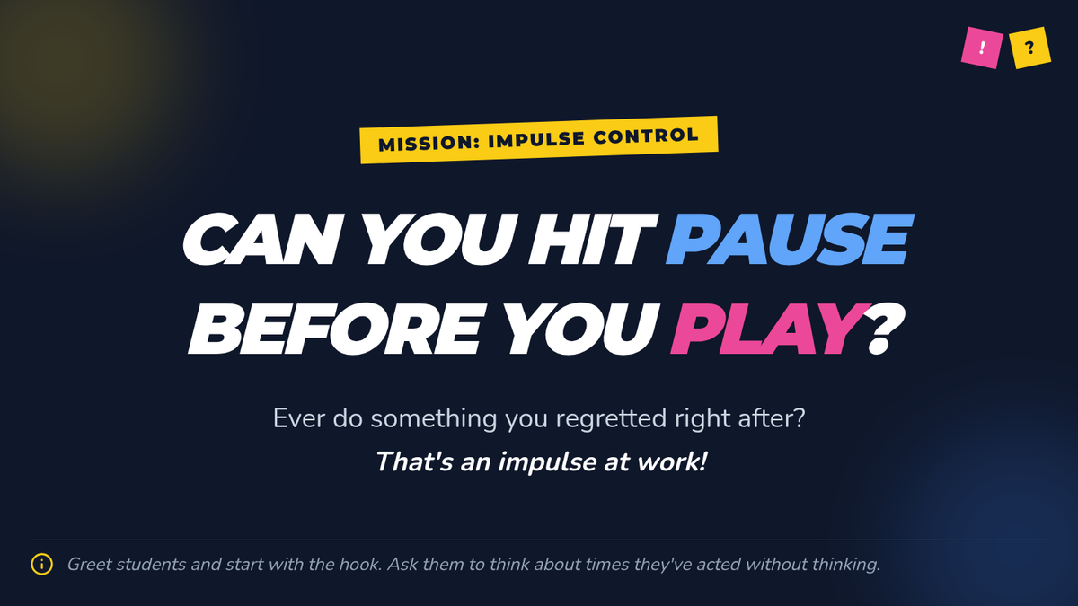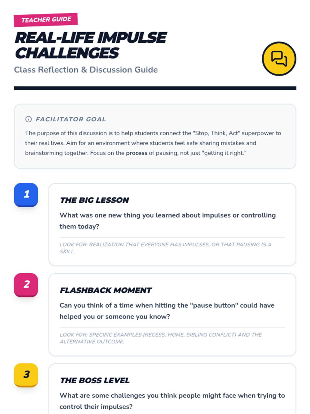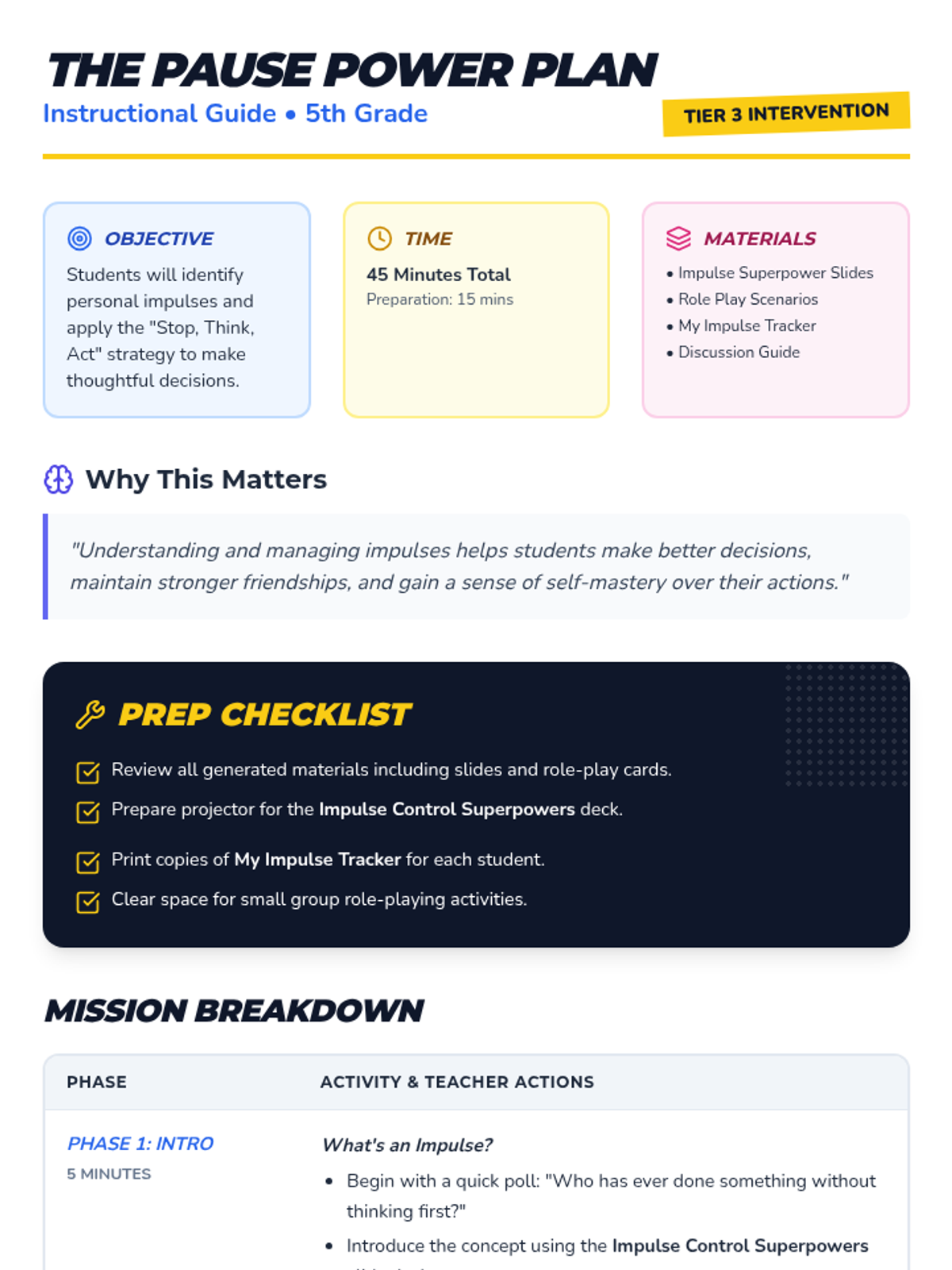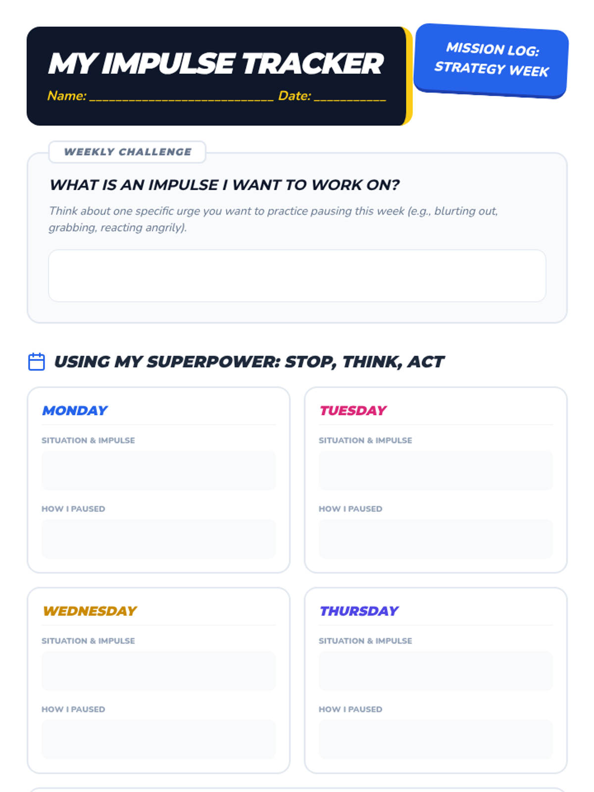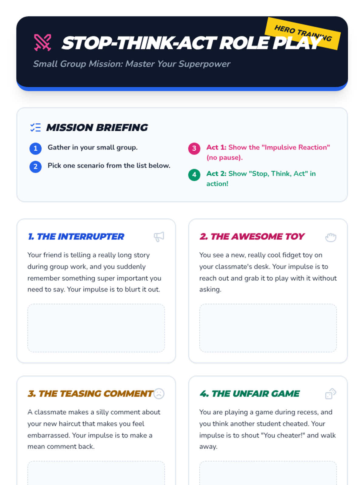 This Tier 3 intervention for 5th graders focuses on developing impulse control through the 'Stop, Think, Act' strategy. Students learn to identify sudden urges, practice thoughtful pausing through role-play, and track their progress in real-world situations.