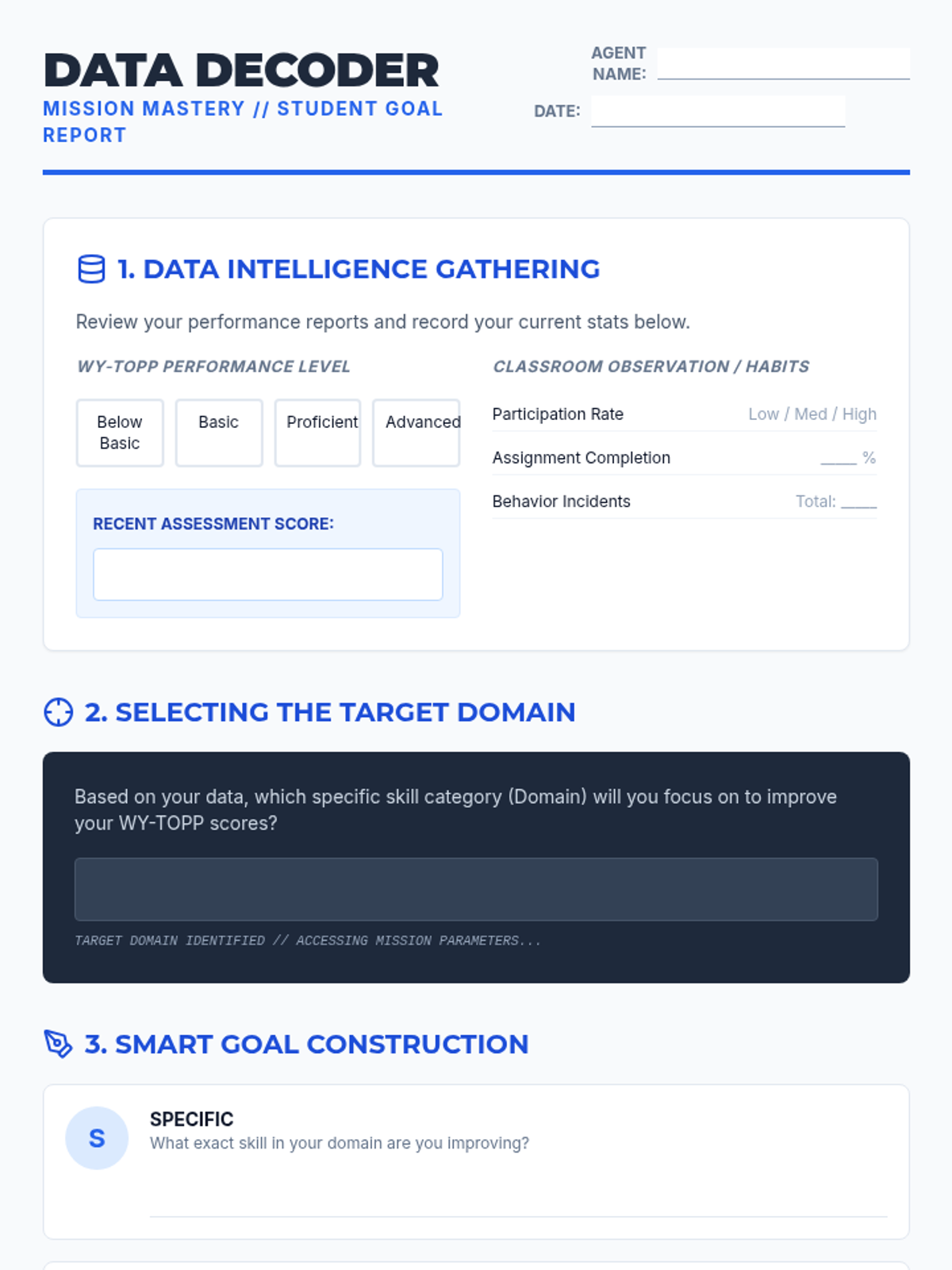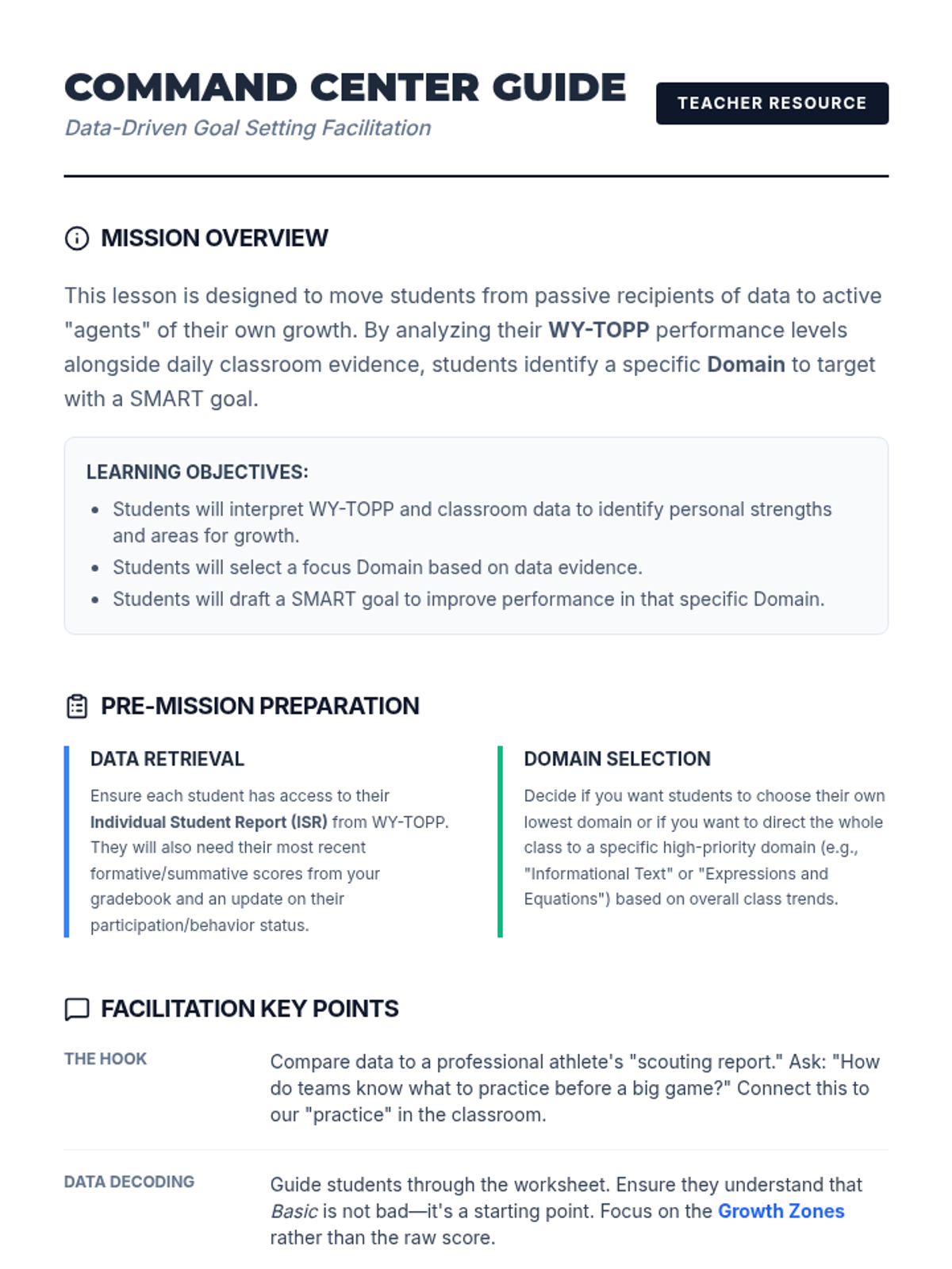 A comprehensive lesson designed for 6th-8th grade students to analyze their WY-TOPP and classroom data to create actionable SMART goals. The lesson empowers students to take ownership of their learning by focusing on specific domains for improvement.